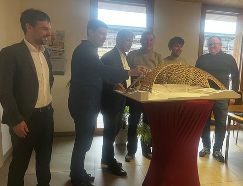 Wie die Zusammenarbeit mit Professor Robeller entstanden ist, schilderte LGS-Prokuristin Tina Heigl. Sie wollte den Experten für digitalen Holzbau und seine innovativen Ideen für die Ausstellung nutzen, die während der Landesgartenschau zu sehen ist. Der damalige Geschäftsführer Robert Sitzmann aber sah ein der innovativen Dachkonstruktion eine tolle Lösung für die Parkarena, die Peter Hickl gerade plante. „Ich hätte diesen Bau natürlich gerne gehabt, aber dann wäre er viel kleiner ausgefallen und nach der Gartenschau wieder verschwunden. Die Parkarena aber ist auf Dauer angelegt“, freute sich Heigl.