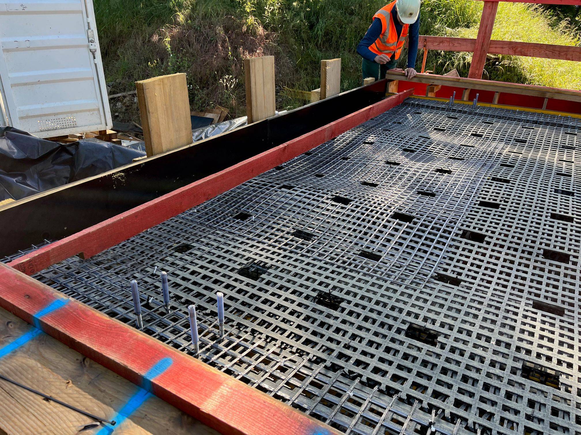 Die Carbonmattenbewehrungen wurden auf 3,4 m x max. ~15,0 m mit einer Gesamtmenge von etwa 1,5 t verbaut.