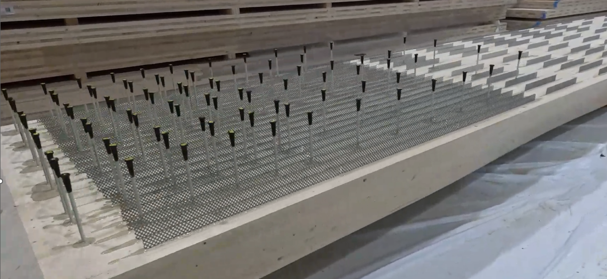 Zur Übertragung der Schubkräfte des HBV-Trägers wurden erstmals stabförmige Carbonschubbügel eingesetzt. Die Versuchsreihen zeigten eine hohe Tragfähigkeit und noch statisches Potenzial zur Effizienzsteigerung. Dies wird in die DAfStb-Richtlinien aufgenommen. Eine weitere Innovation: Die Querkräfte aus dem Holzträger wurden über nichtmetallische GFK-Combarstäbe mit einer Kopfausbildung in die Massivplatte hochgehängt.