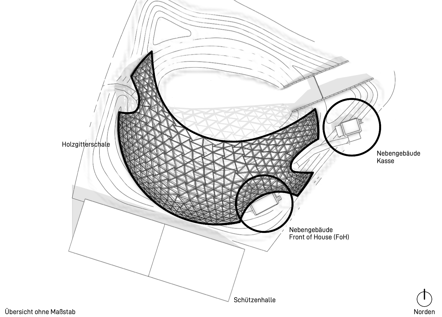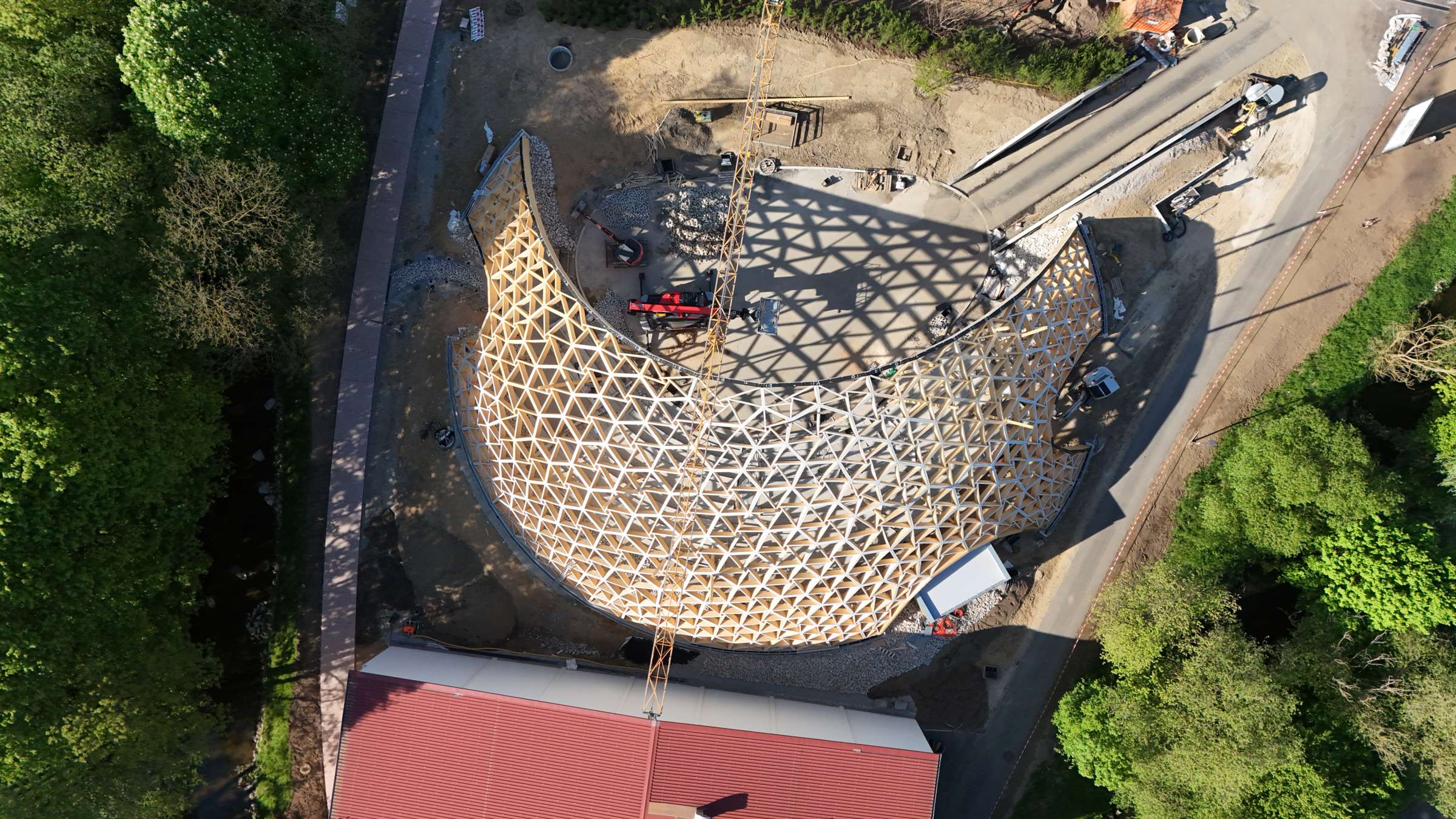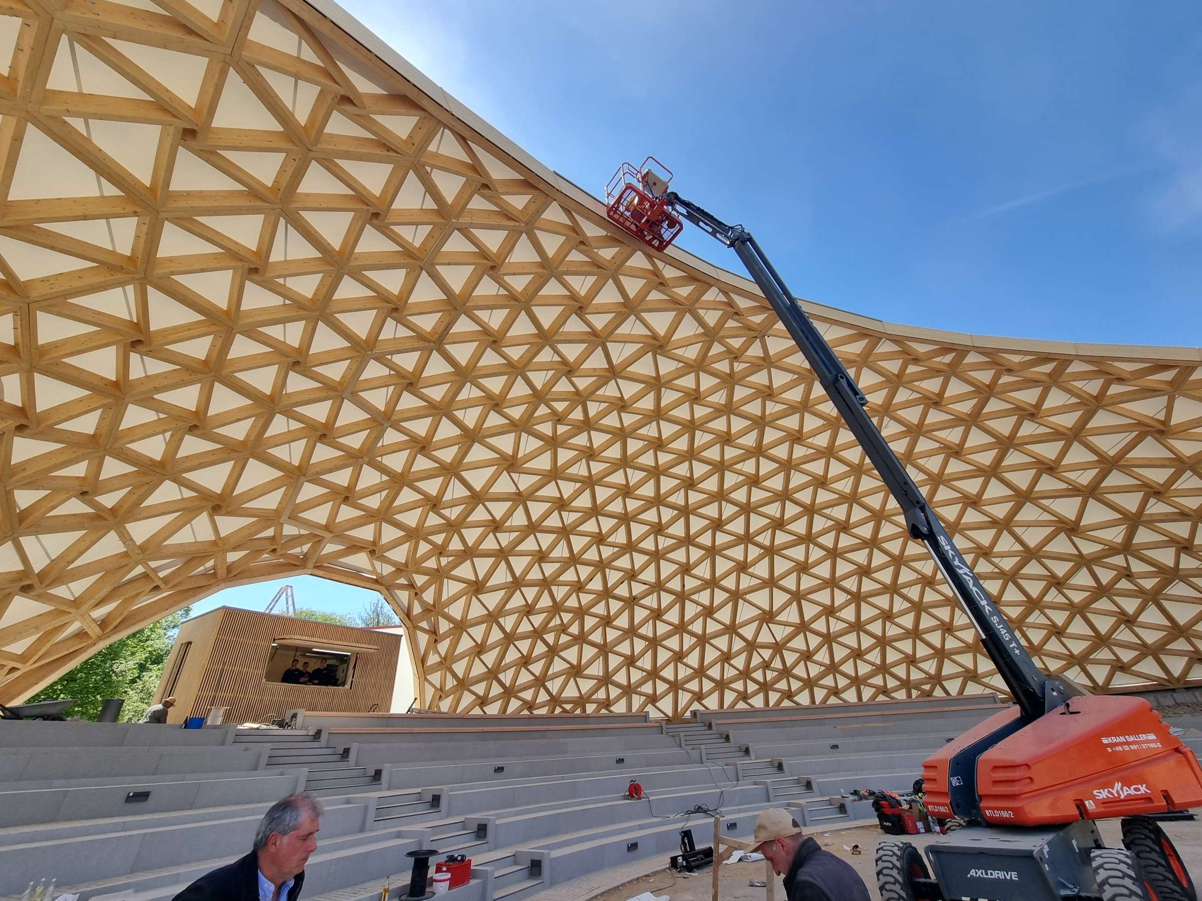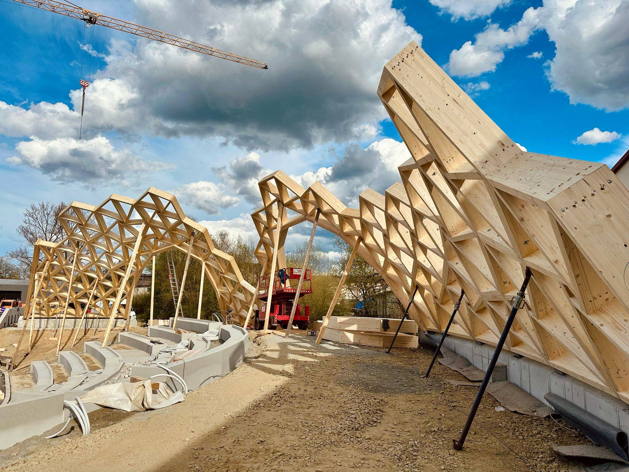 Innovatives, leichtes Flächentragwerk aus kurzen Holzelementen als offene Hallenkonstruktion für Open-Air-Veranstaltungen errichtet