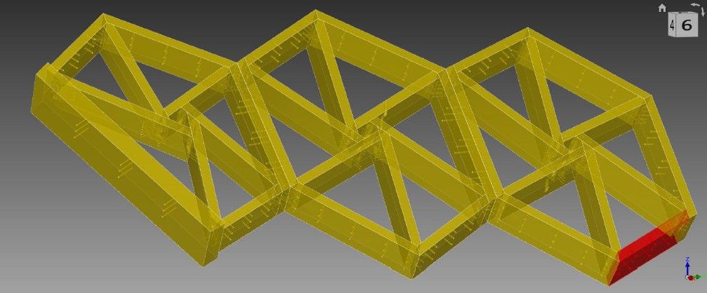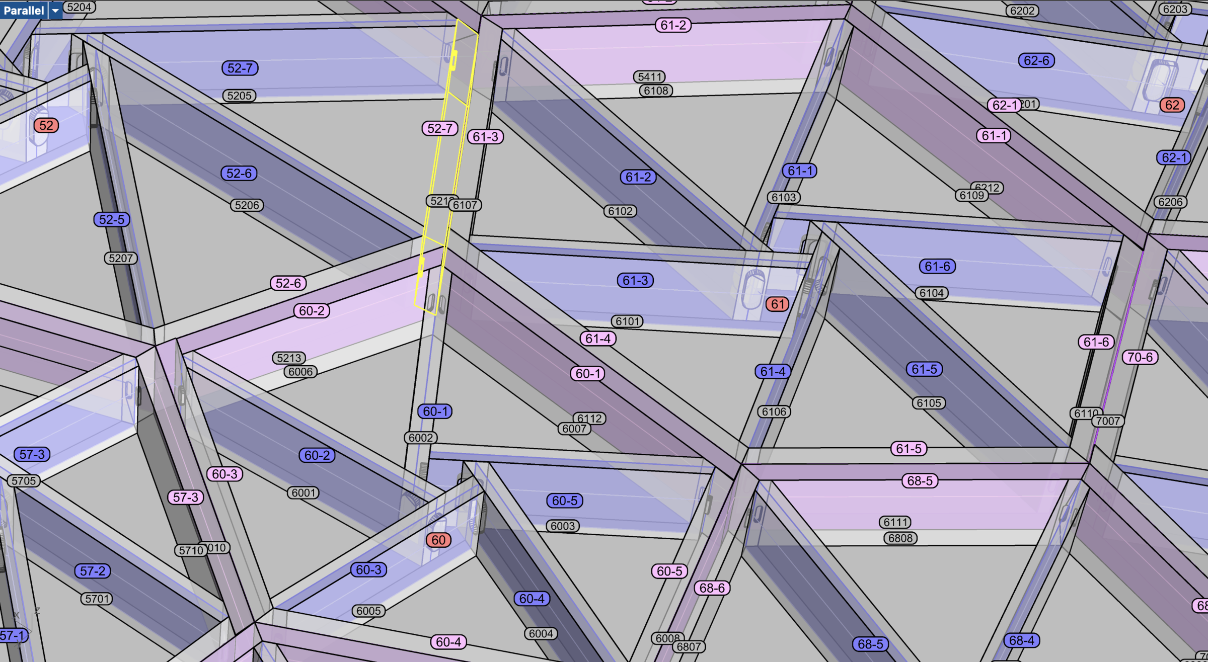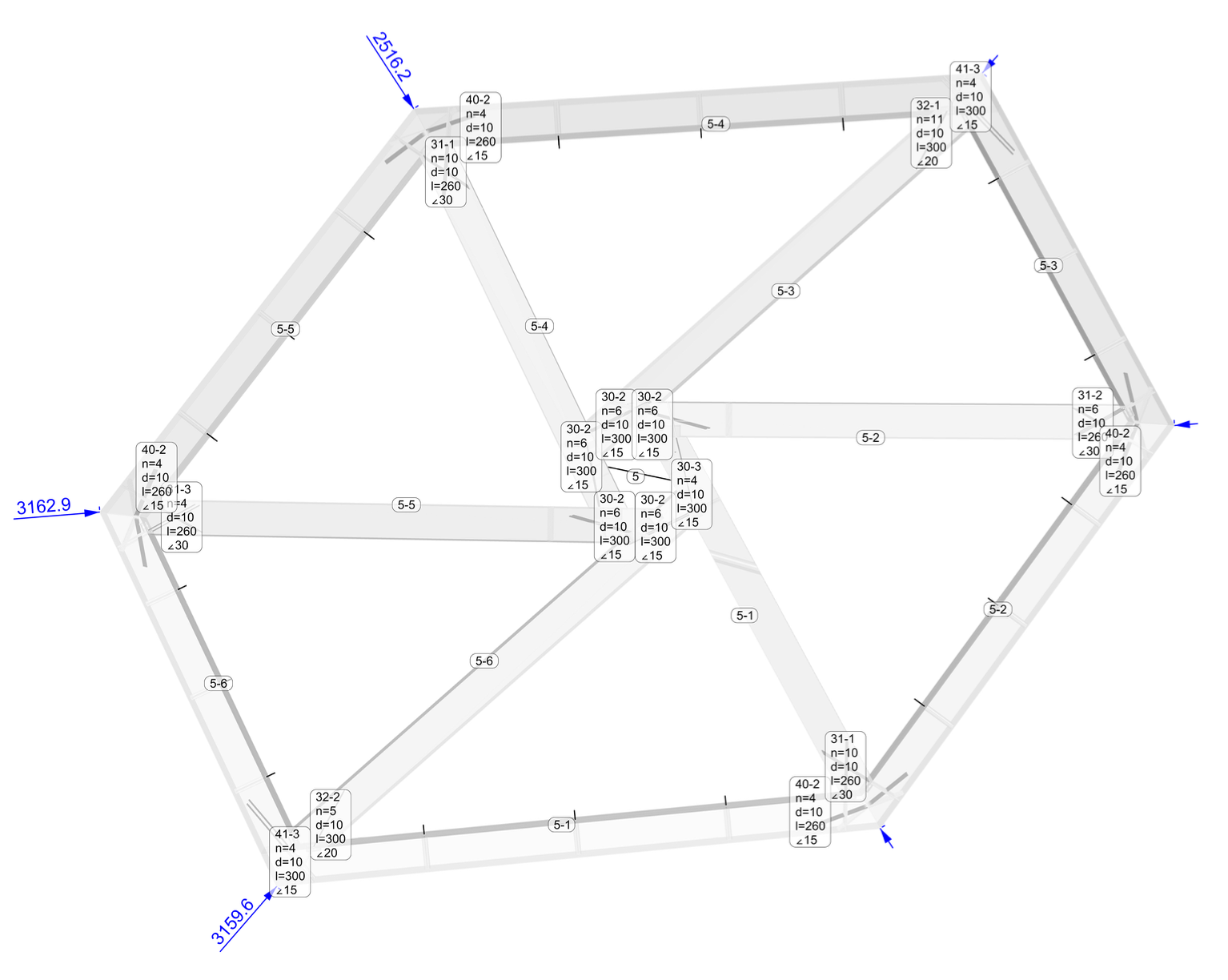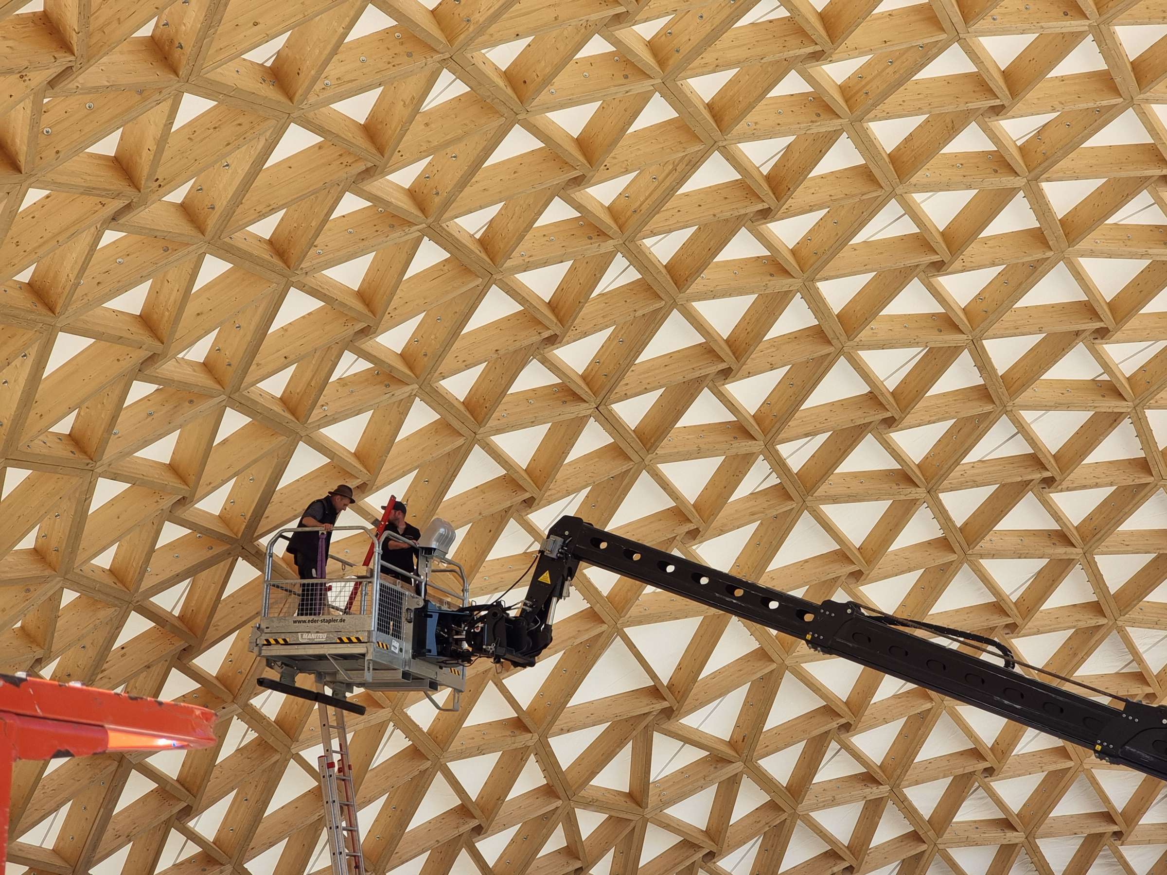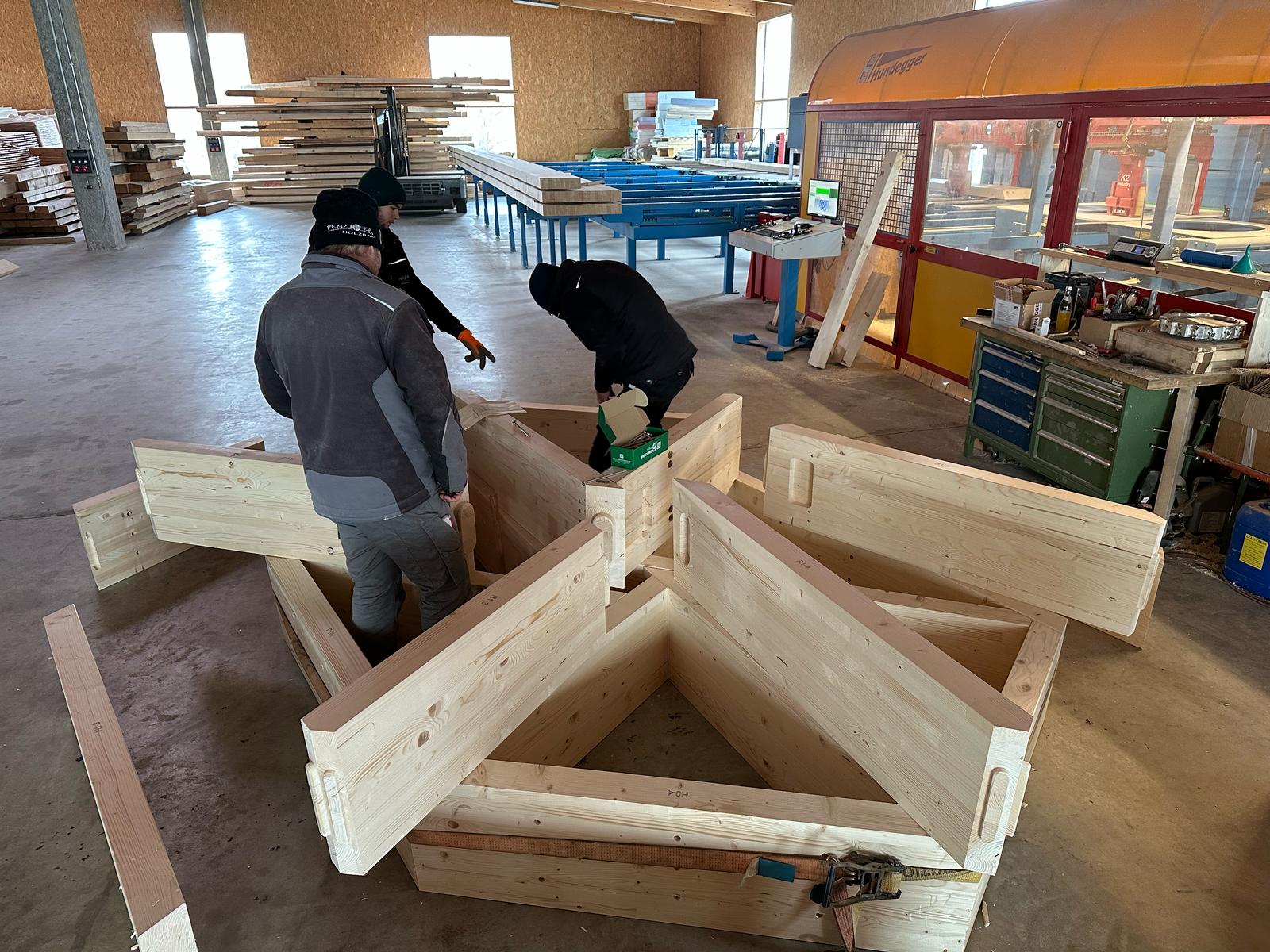 Die Wabenform ist besonders materialeffizient und leicht angelegt. Dazu wurden vollautomatisch tausende unterschiedliche Holzelemente und deren Produktionsdaten für den Abbund berechnet, inklusive aller Bohrungen und Ausfräsungen für die Verschraubungen. Der Zuschnitt erfolgte millimetergenau mit einer High-Tech-Maschine in einem Sägewerk. Mit dieser Methode wird auch der Verschnitt auf ein Minimum reduziert.
