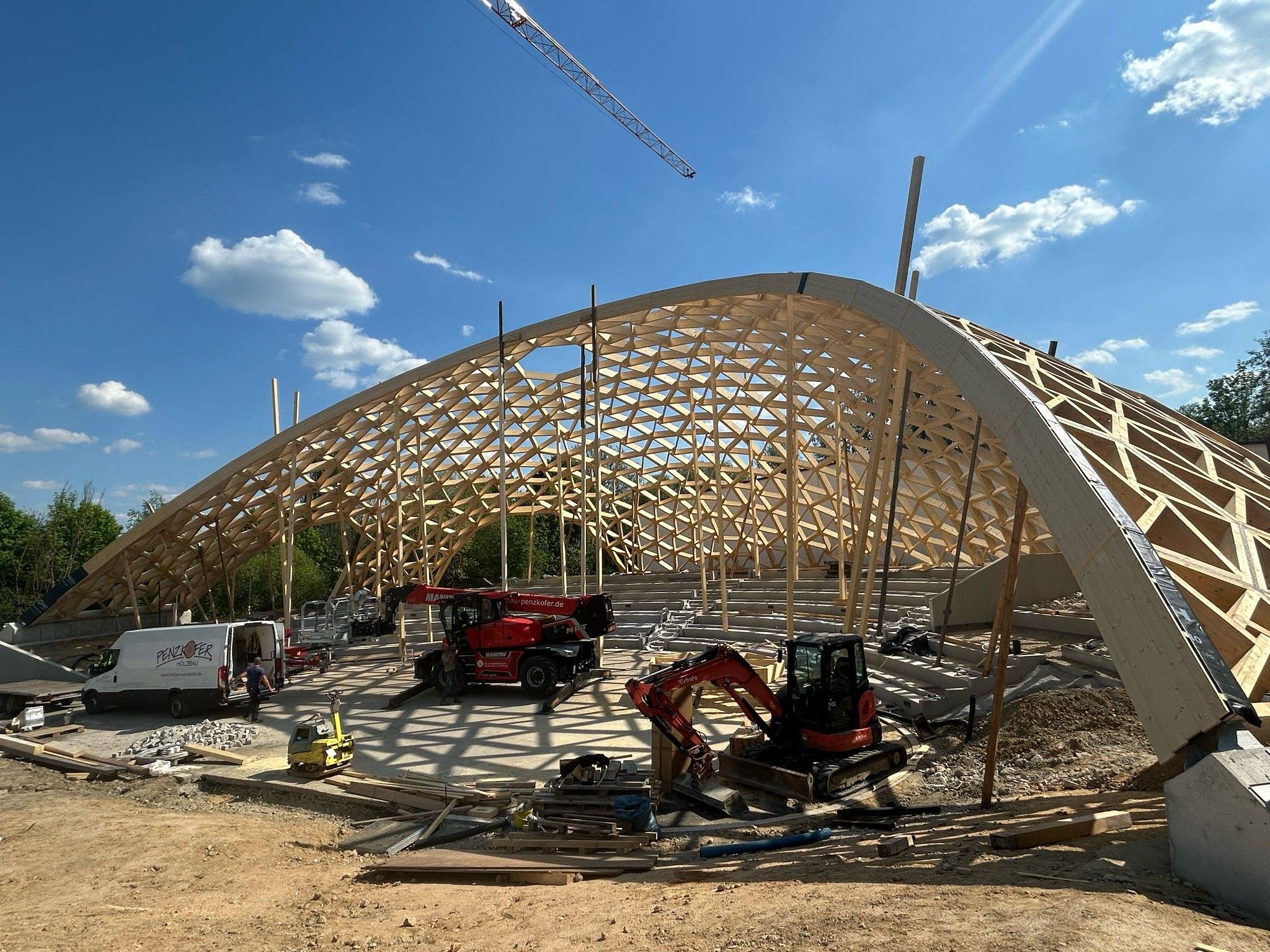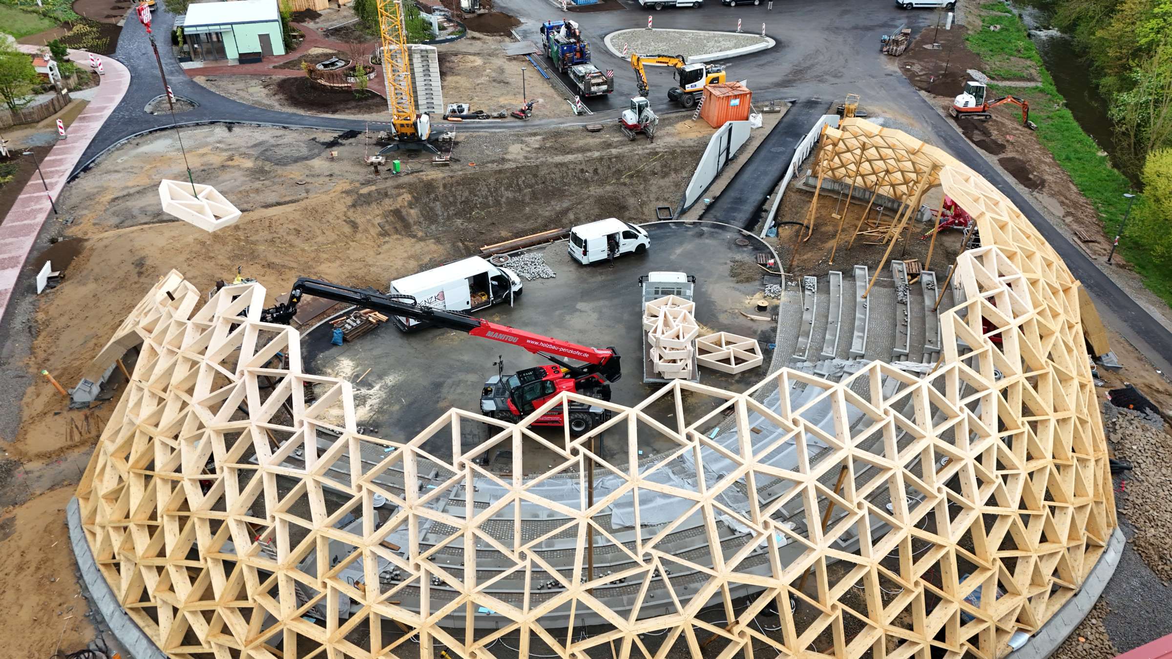 Neben mehreren kleineren Demonstratorprojekten ermöglicht die Parkarena Furth den Forschenden, die Methoden in einer vollmaßstäblichen Gitterschalenkonstruktion zu testen.