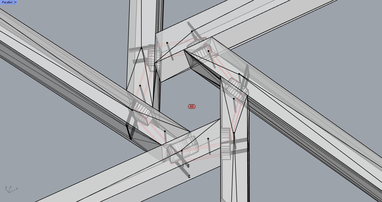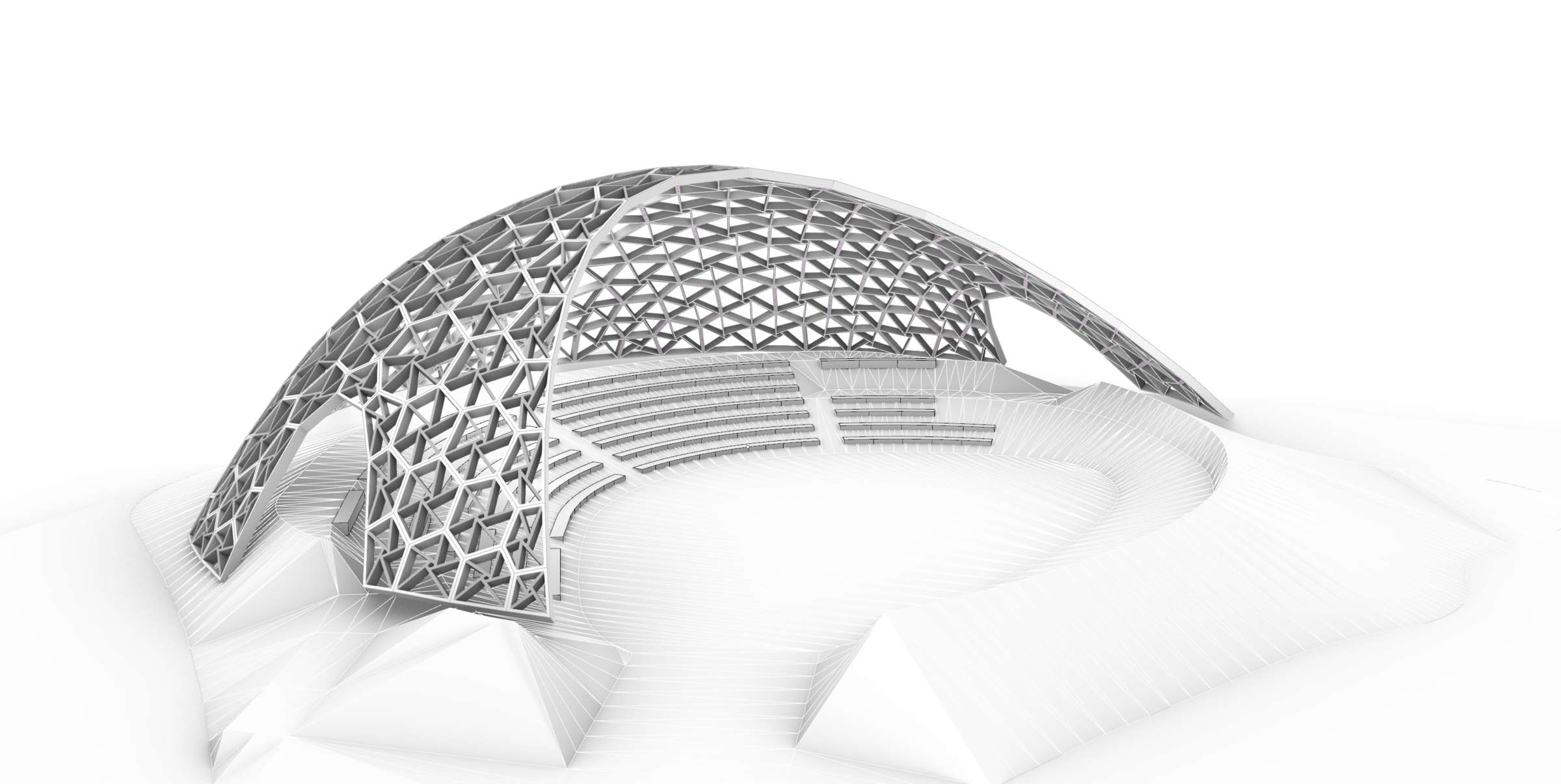 Die THA-Forschenden hatten bereits eine Software für die Konstruktion einer Reciprocalshell entwickelt, die sie zur Errichtung der Parkarena einsetzten. So konnten computergeneriert die polygonalen Fertigmodule mit gegenseitiger Querverstrebung geplant und später dann im Sägewerk erstellt werden.