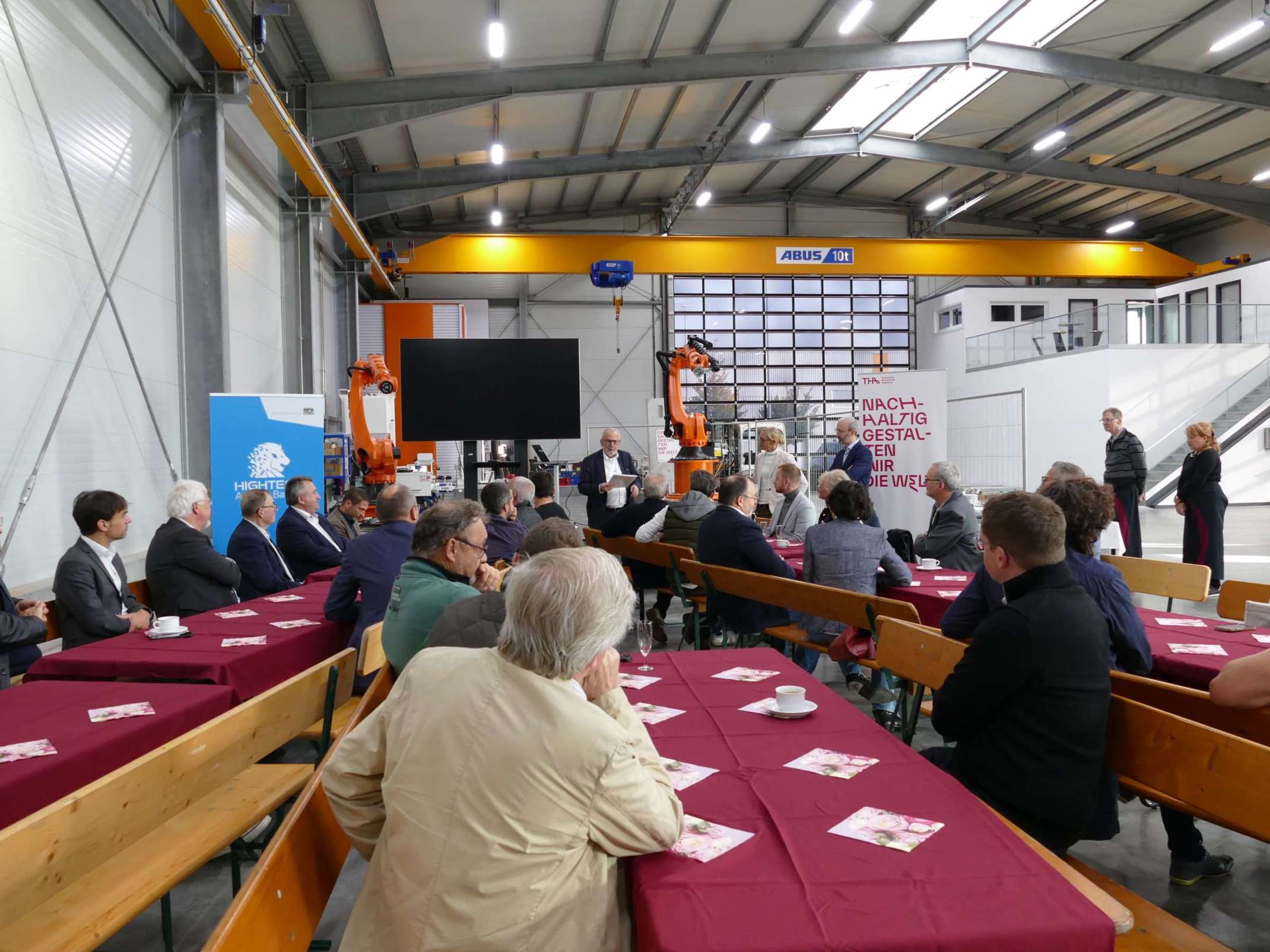 Vorgestellt wurden im Rahmen des Unternehmerfrühstücks aktuelle Forschungsprojekten des TTZ Aichach aus dem Beton- und Holzbau. Ebenso konnte der Maschinenpark, an dem die Forschenden ihre Projekte in der Halle bearbeiten, besichtigt werden.