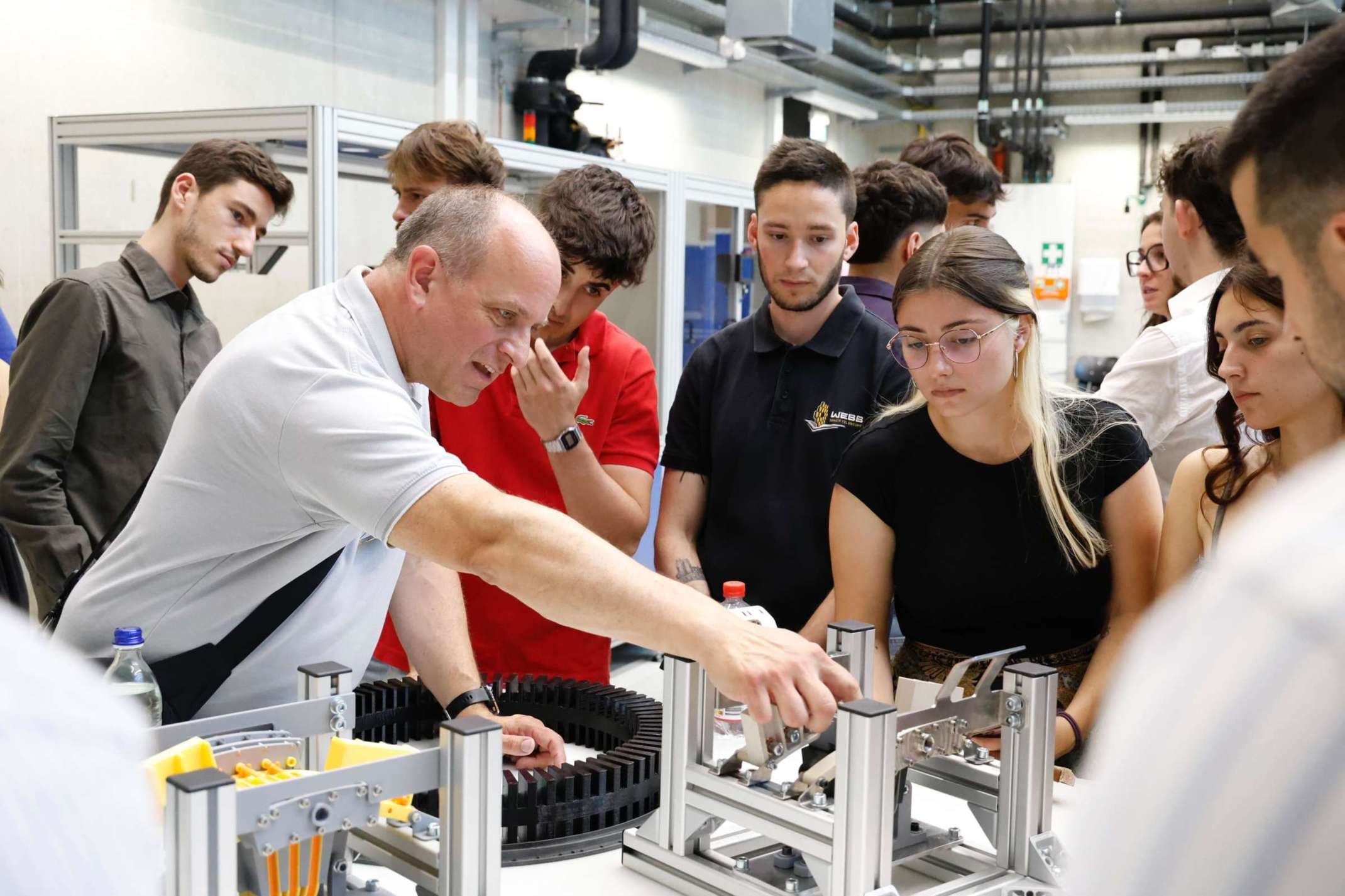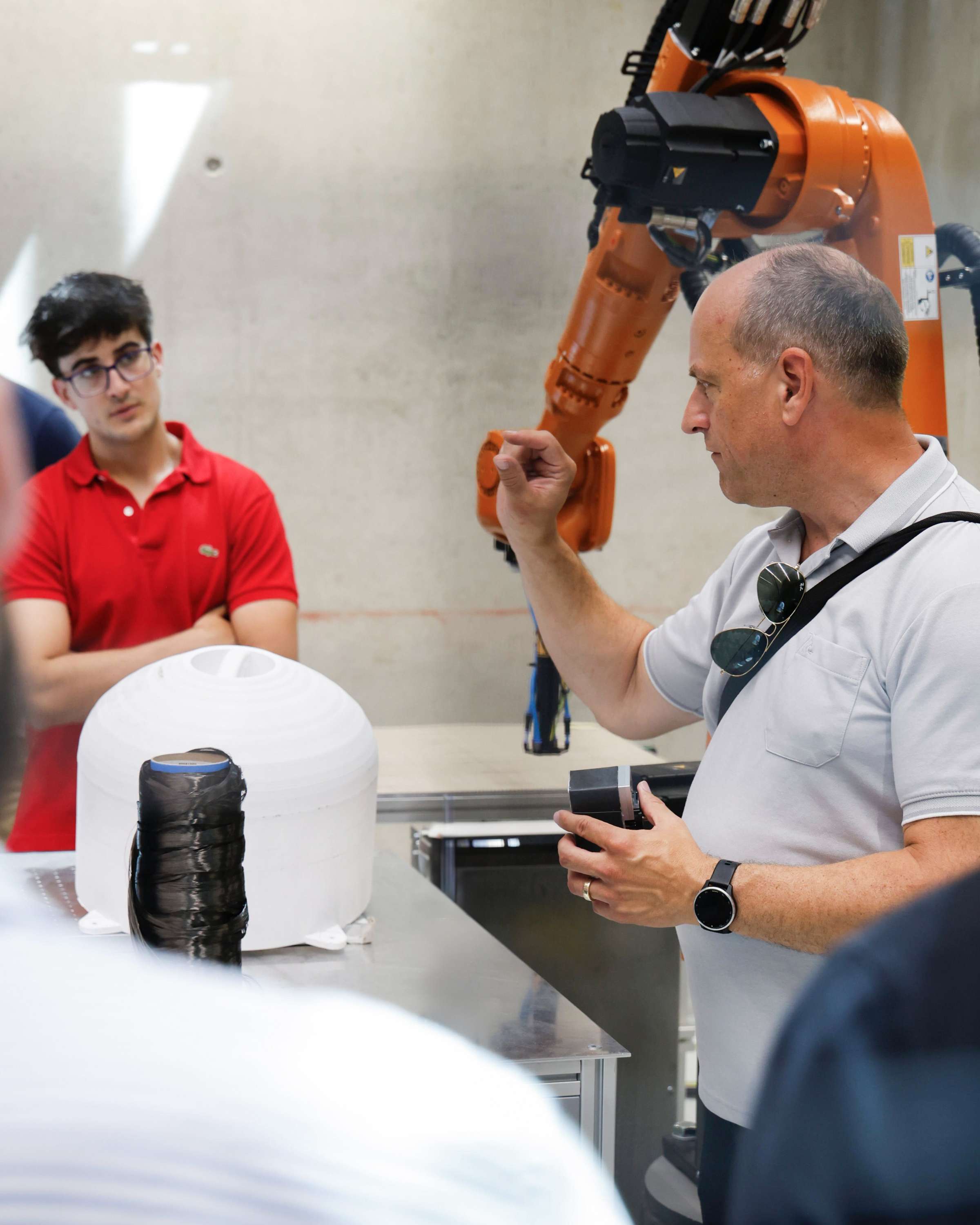 Das zentrale Projekt der Summer School, das alle Teilnehmenden gemeinsam bearbeiten, ist die Konzeption einer wasserstoffbetriebenen Mondlandeeinheit („Lunar Lander“) mittels MBSE – einer modernen Methode des Digital Engineering. Hierzu informierten sich die Studierenden bei dem Programmpunkt im TTZ Gersthofen, welche innovativen Technologien sich für diesen Anwendungsfall adaptieren lassen könnten. Input gab es hierzu folgenden: Die entwickelten Innovationen im Projekt K-AXFLUX-H2, in dem ein kryogenes Wasserstoff-Kühlsystem für ein neuartiges E-Antriebssystem für Air-Mobility-Anwendungen entsteht, und auch die Forschungsergebnisse aus dem Projekt MatWaTa, in dem materialeffiziente Wasserstoffdrucktanks für umweltfreundliche und emissionsfreie Antriebskonzepte der Zukunft entwickelt werden.
