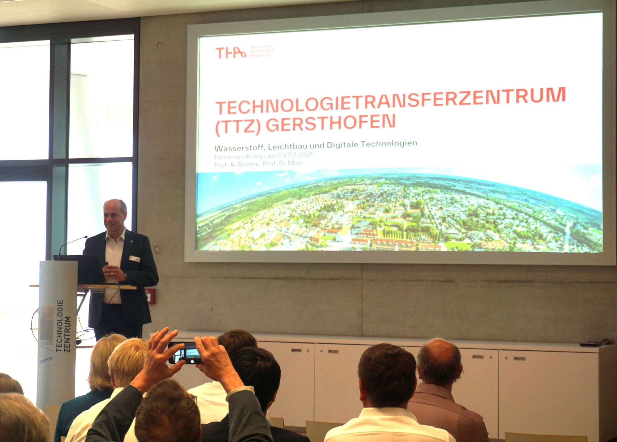 Im Fokus der Veranstaltung stand die Vorstellung des Technologietransferzentrums (TTZ) Gersthofen der Technischen Hochschule Augsburg. Das TTZ Gersthofen ist die praxisnahe Schnittstelle für Innovationen in den Bereichen Wasserstoff, Leichtbau und digitale Technologien. In enger Kooperation zwischen Forschung und Praxis können interessierte Unternehmen am TTZ Gersthofen Lösungen für ihre Unternehmensbedarfe entwickeln. Gefördert wird das TTZ Gersthofen im Rahmen der Initiative „Hightech Transfer Bayern“, einem Teil der „Hightech Agenda Bayern“ des Freistaates Bayern, und von der Stadt Gersthofen. Die wissenschaftliche Leitung des TTZ obliegt Prof. Dr.-Ing. André Baeten und Prof. Dr.-Ing. Neven Majić, die bereits seit mehreren Jahren erfolgreich Projekte in den Bereichen Leichtbau und Wasserstofftechnologien an der THA verantworten. Ziel ist, im TTZ Gersthofen neue Impulse für die regionale Entwicklung zu setzen und gezielte Kooperationen mit der Industrie zu ermöglichen. Eingerahmt wurde der Wasserstofftag von spannenden Fachvorträgen aus Forschung und Industrie rund um die Themen Wasserstoff und Innovationsprojekte.