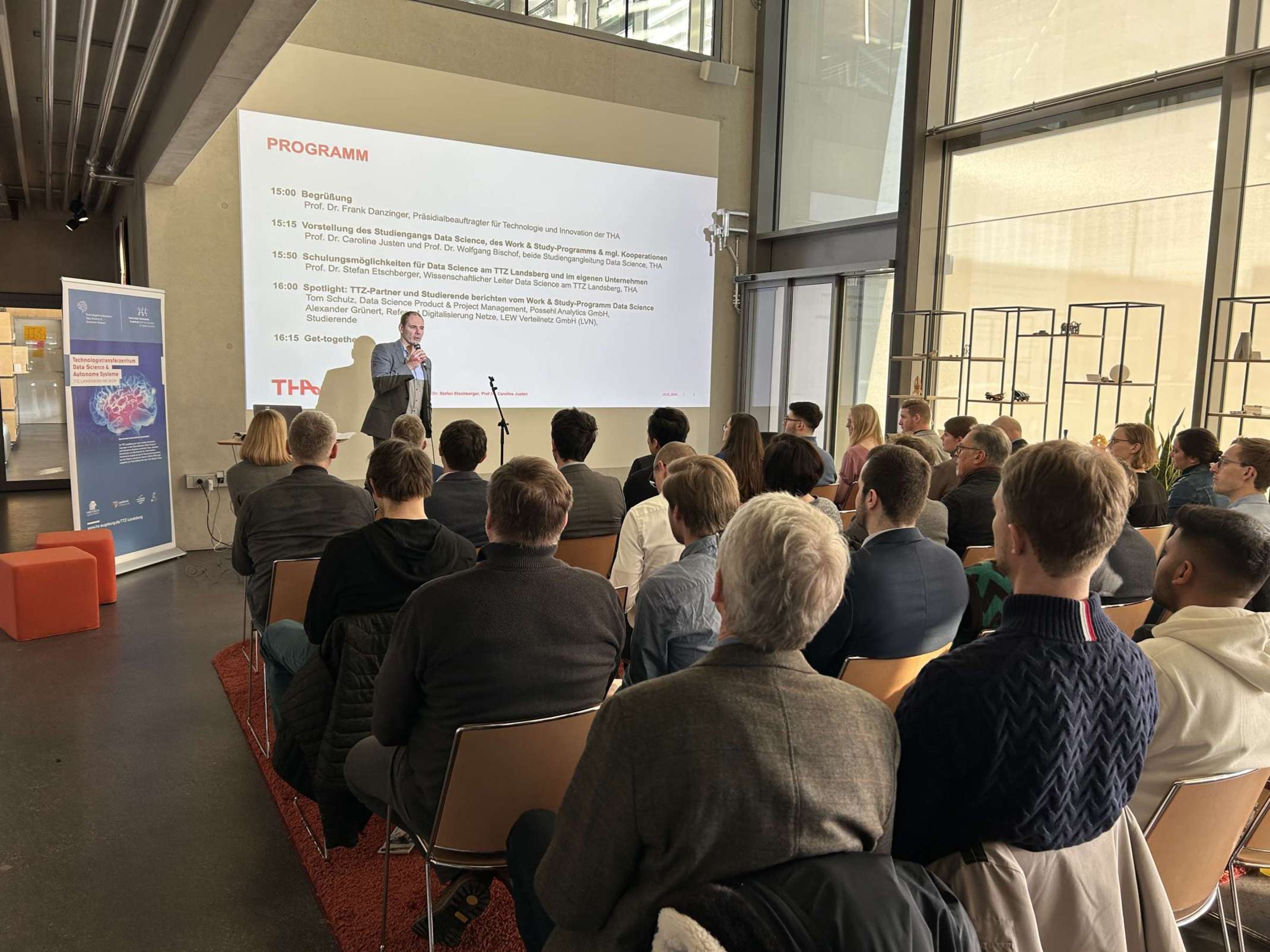Gekommen waren rund 30 Geschäftsführende und am Work & Study-Programm Data Science Interessierte aus der Region, um sich über die Möglichkeiten, die die Technische Hochschule Augsburg im TTZ Data Science und Autonome Systeme am Außenstandort in Landsberg am Lech bietet, zu informieren.