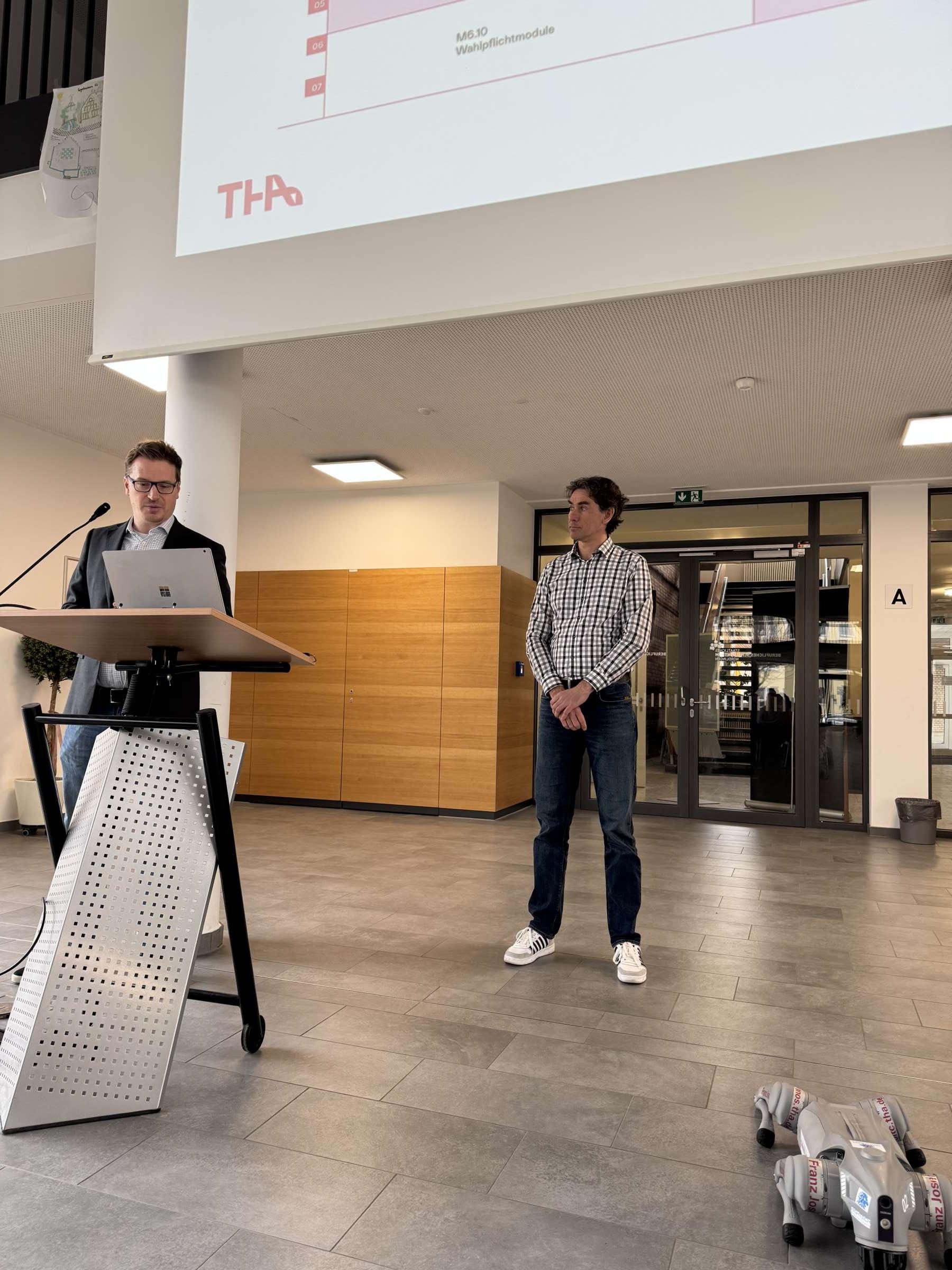 Prof. Jürgen Lenz vom TTZ Nördlingen und Prof. Simon Dietrich von der Fakultät Elektrotechnik waren am 10. Februar 2025 zu Gast an der Technikerschule, um diese neue Kooperationsvereinbarung und die Studiengänge Maschinenbau, Umwelt- und Verfahrenstechnik und Mechatronik /Elektro- und Informationstechnik vorzustellen. Unter dem Motto „Studieren und Forschen an der THA“ gaben die Professoren einen Einblick in das Campus Leben der THA sowie in das Projektbeispiel „Schleifroboter in KMUs“. Es wurde auf die Möglichkeiten und Herausforderungen beim Einsatz von kollaborativen Schleifrobotern in KMUs aus dem verarbeitenden Gewerbe eingegangen.