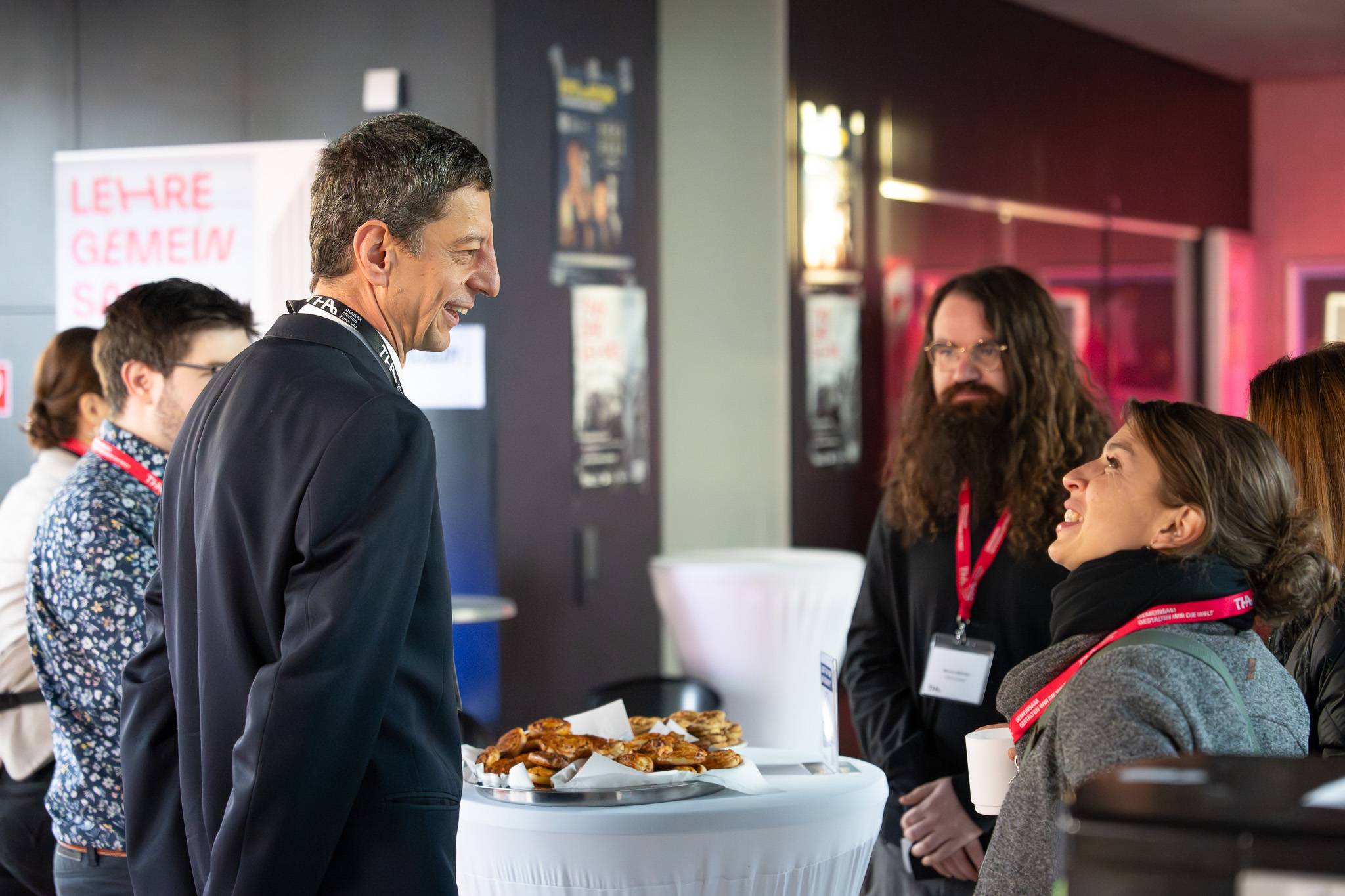 Die zahlreichen Kaffeepausen boten den Teilnehmenden reichlich Gelegenheit, miteinander ins Gespräch zu kommen, Erfahrungen zu teilen und neue Kontakte zu knüpfen. Besonders lebhaft ging es beim Speeddating zu: In kurzen Zwei-Minuten-Runden konnten die Lehrenden nacheinander miteinander ins Gespräch kommen und so auf unkomplizierte Weise auch Kolleginnen und Kollegen aus anderen Fakultäten und Bereichen kennenlernen. Souverän moderiert wurde das Format von Angela Prochaska, die für eine offene und einladende Atmosphäre sorgte. Ganz im Sinne des Tags der Lehre entstanden dabei viele anregende Gespräche darüber, wie gute Lehre gestaltet werden kann.
