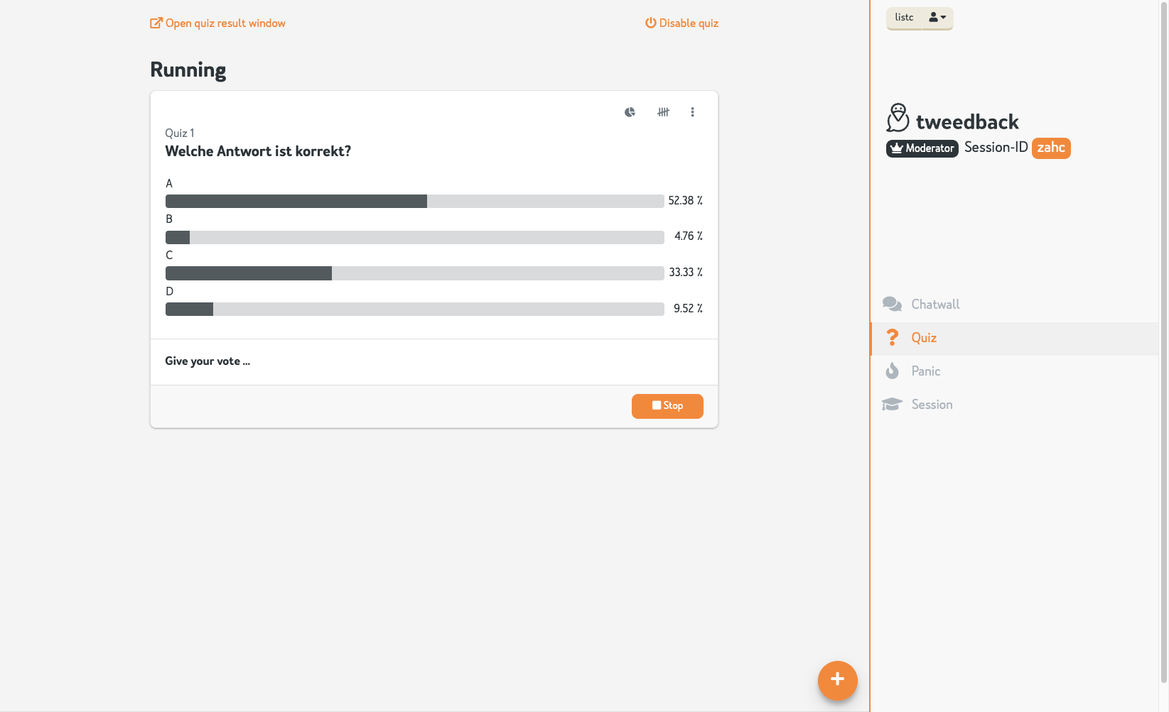 Tweedback ist eine webbasierte Anwendung, die speziell für Clickerfragen (Peer Instruction) entwickelt wurde. Lehrende können Single- oder Multiple-Choice-Fragen erstellen, die Studierenden antworten im Browser, z.B. auf dem Smartphone oder Laptop. Neben der Quiz-Funktion gibt es auch eine Chatwall, in der Studierende Fragen sammeln können, und einen Panikbereich, in dem z. B. mitgeteilt werden kann, wenn das Vorlesungstempo zu schnell oder zu langsam ist.