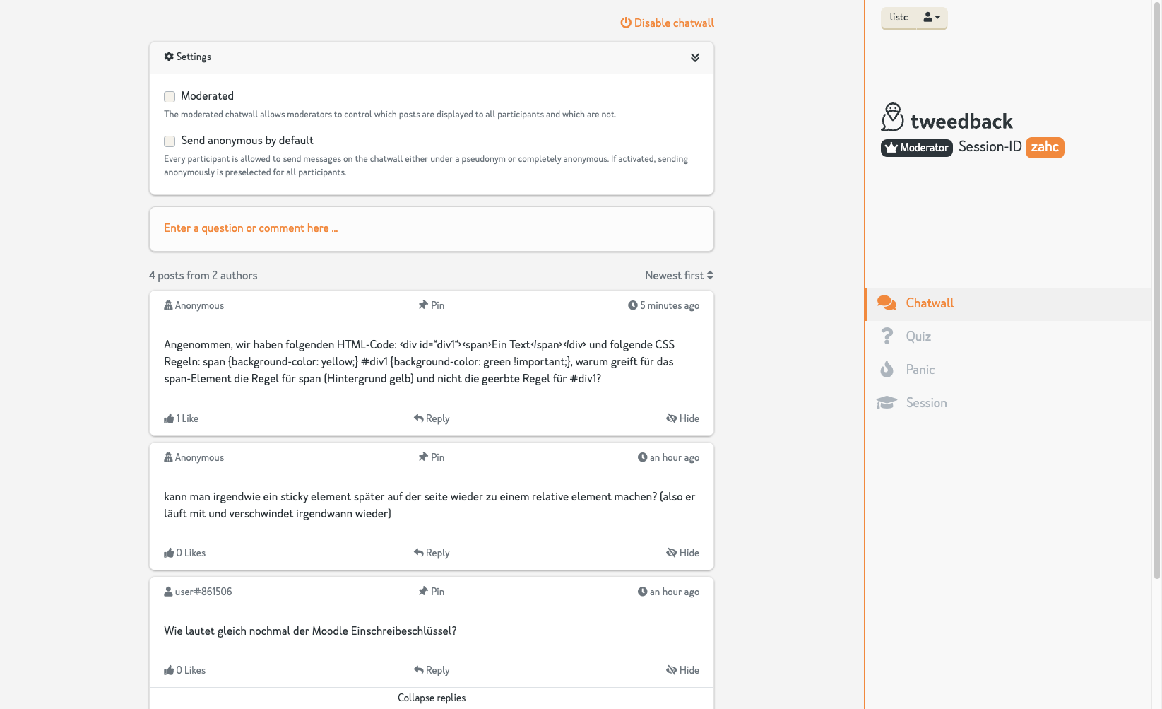 In der Chatwall können Studierende Fragen sammeln, gestellte Fragen liken oder selbst auf Fragen antworten. Die Chatwall eignet sich z. B. besonders, um anonyme Fragen zu ermöglichen oder in Vorbereitung auf eine Vorlesung Fragen sammeln zu lassen.