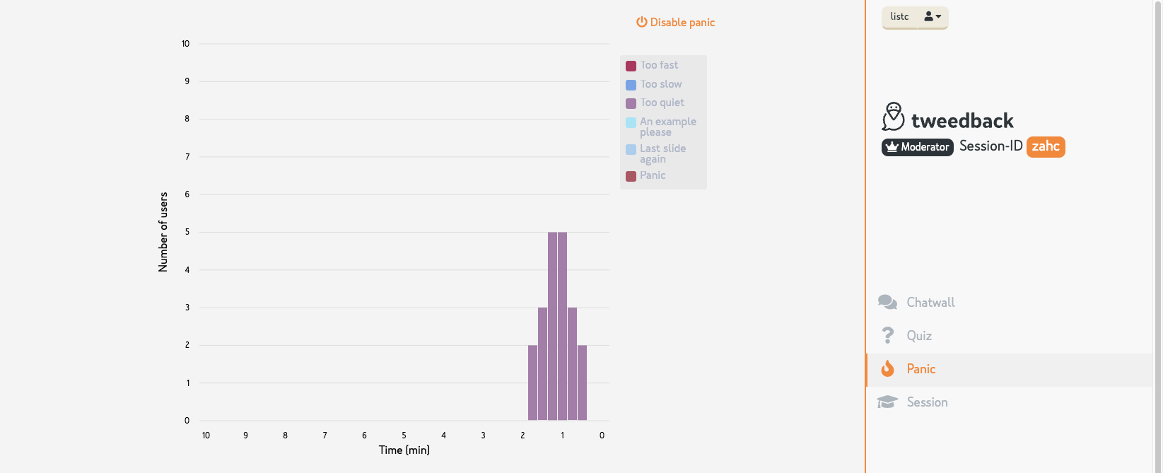 Mit Hilfe von simplen Buttons können Studierende Rückmeldung zum Vorlesungstempo geben, um weitere Beispiele bitten oder mit dem Ausdruck "Panik" zeigen, dass der Vorlesungsstoff z. B. unklar ist. Lehrende erhalten eine Übersicht der letzten 10 Minuten.
