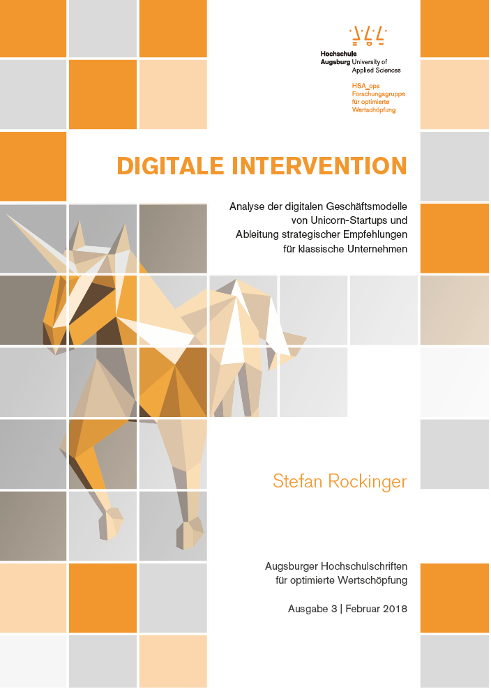 Rockinger, S. (2018): »DIGITALE INTERVENTION - Analyse der digitalen Geschäftsmodelle von Unicorn-Startups und Ableitung strategischer Empfehlungen für klassische Unternehmen«, Augsburger Hochschulschriften für optimierte Wertschöpfung, Band 3, Shaker, 2018.