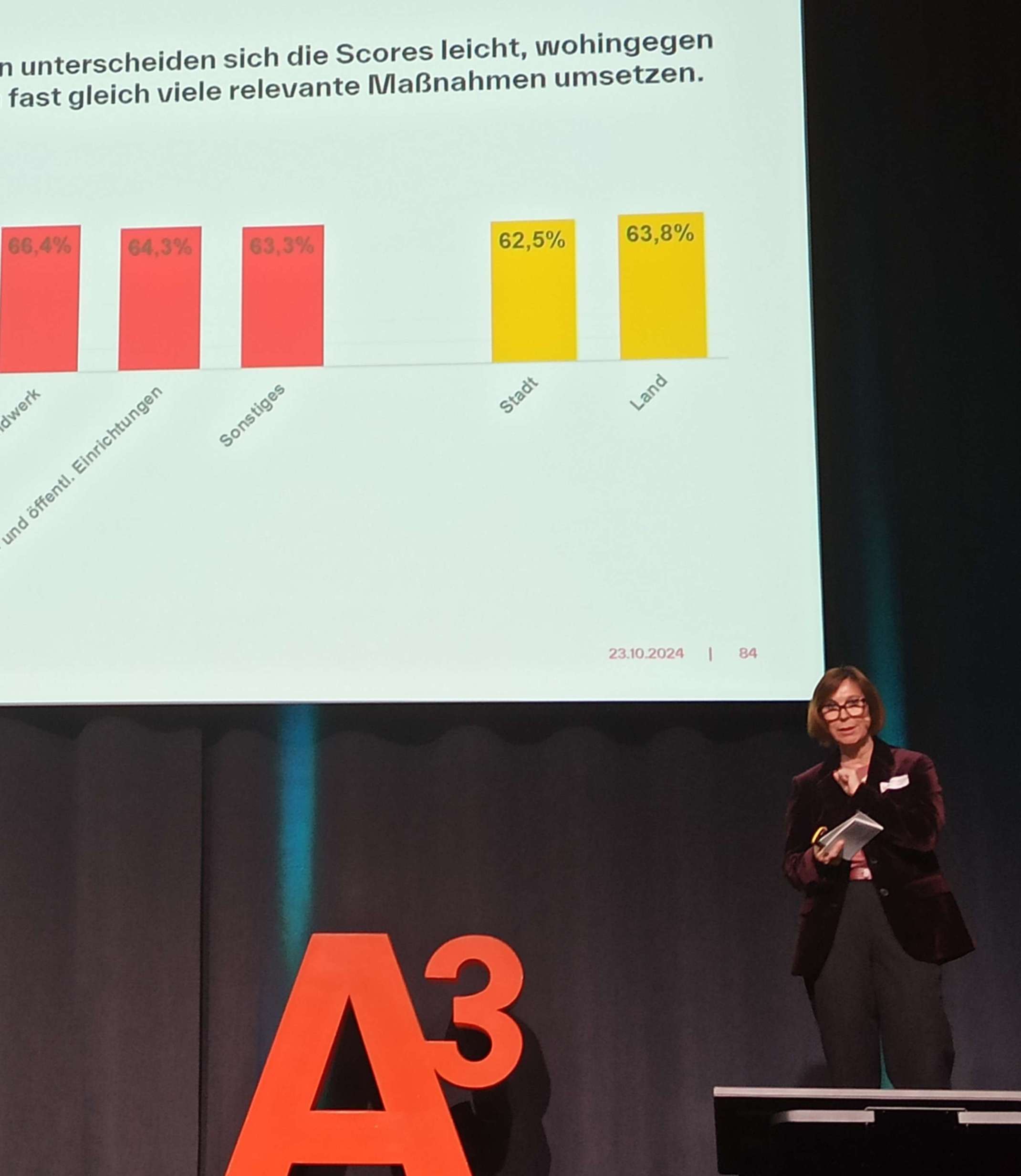 Frau Prof. Joeris stellte im Anschluss die Forschungsergebnisse der ersten Befragung von Organisationen der Region A3 vor. Diese Befragung fand im Rahmen des Nachhaltigkeitsmonitors statt – einem gemeinsamen Projekt der Technischen Hochschule Augsburg mit der Regio Augsburg Wirtschaft GmbH.