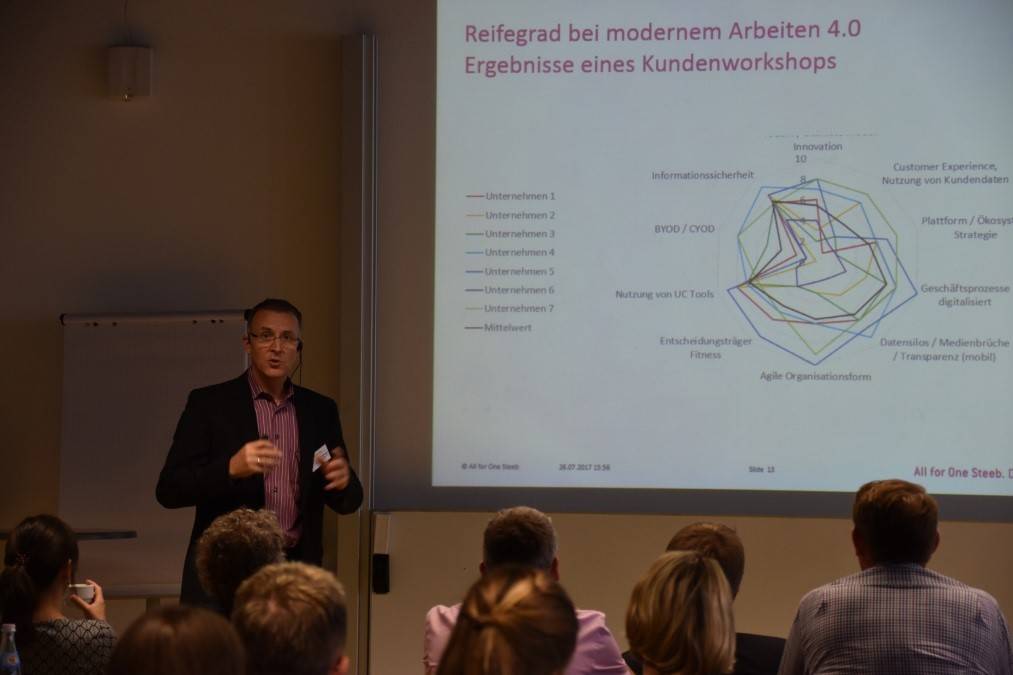 Anschließend gab es zwei Praxisbeispiele: Kai Göttmann, Mitglied der Geschäftsleitung der All for One Steeb AG, stellte das neue Open-Office-Bürokonzept mit unterschiedlichen Bereichen für Gruppenarbeiten, Zweiergesprächen sowie ruhigen Einzelarbeitsplätzen dar. Gleichzeitig vermittelte er den Anwesenden, dass moderne Technik bei mobilem Arbeiten unverzichtbar ist und berichtete Erfahrungen u.a. in der Nutzung von Web-Konferenzen, dem Microsoft Surface Hub, dem SAP Digital Boardroom oder HoloLens für eine „mixed reality“.