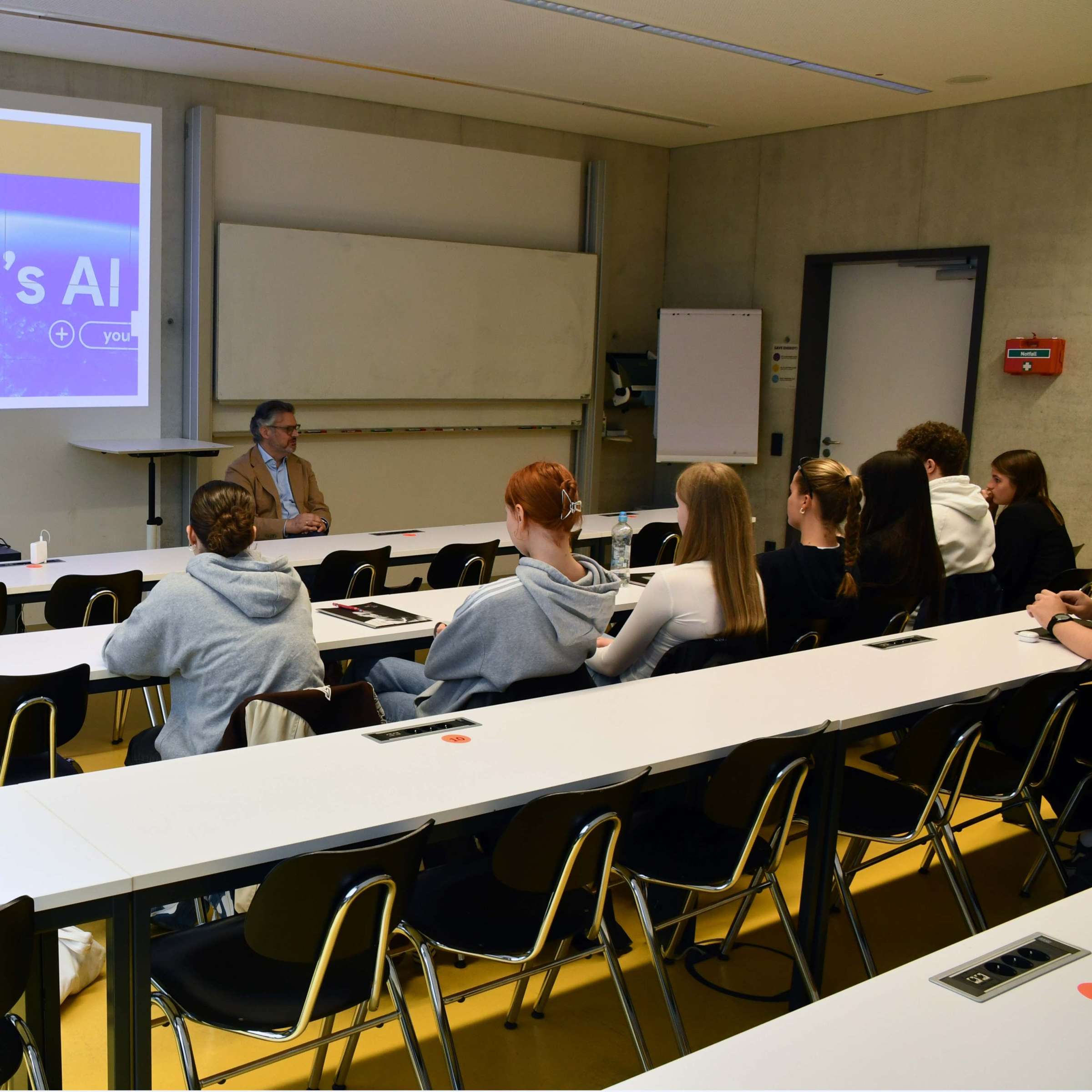 Danach erleben die Teilnehmer:innen direkt den Studienalltag: Sie besuchen eine Vorlesung der Wirtschaftspsychologie von Prof. Dr. Barbara Eschner und werden kurzerhand in Gruppenarbeiten der Studierenden mit eingebunden. Schnell entstehen konstruktive Gespräche zum aktuellen Thema der Markt- und Konsumentenpsychologie, die auf unterschiedliche Weise das tägliche Erleben und Verhalten aller beeinflusst.
