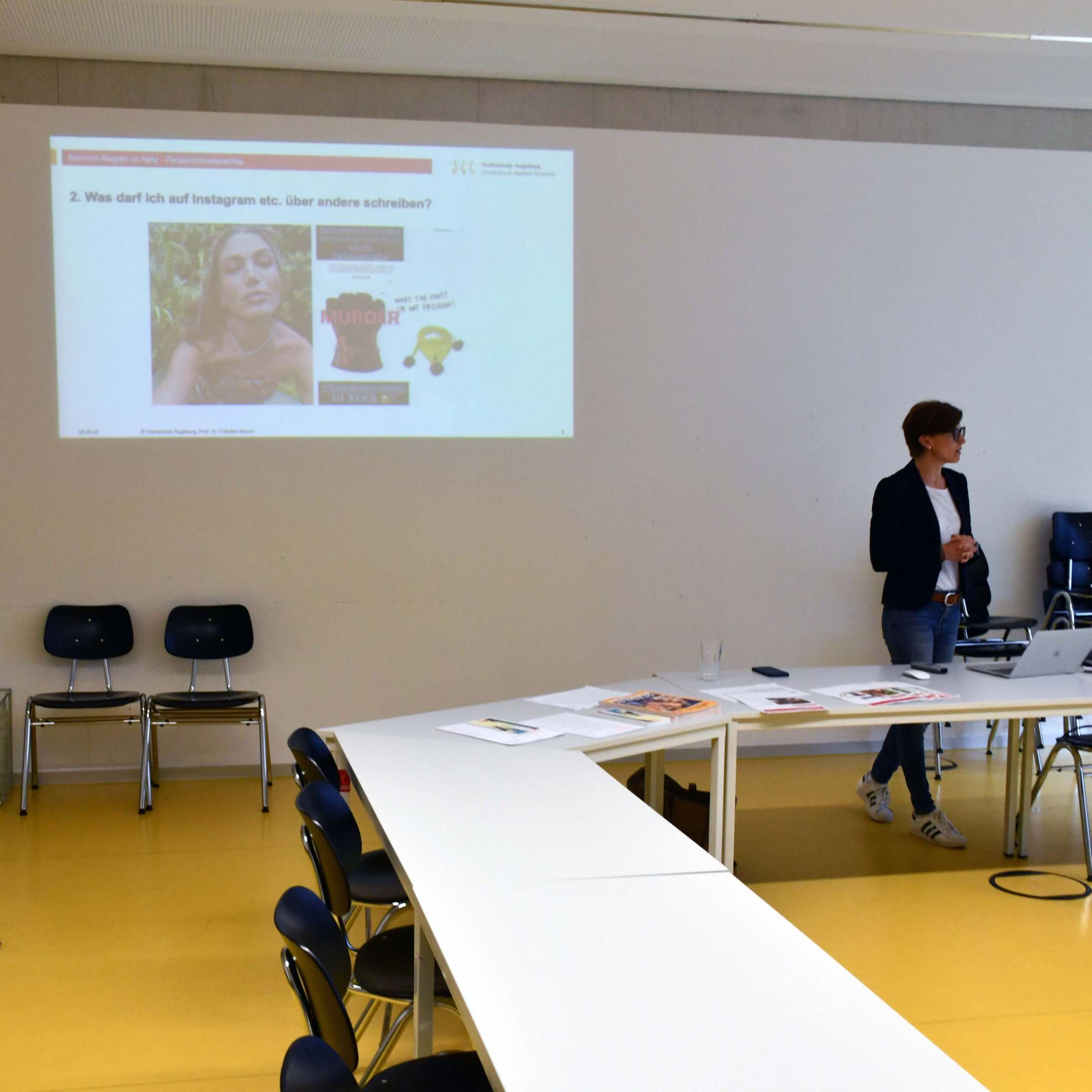 Im Workshop mit Prof. Dr. Felicitas Maunz übernehmen die Teilnehmer schließlich selbst die Rolle von Influencern und setzen sich mit rechtlichen Fragestellungen auseinander: Hat Cathy Hummels auf ihrem Instagram-Kanal Schleichwerbung betrieben? Wie ist der Rechtsstreit um Influencerin Tessa Bergmeier ausgegangen – ist ihre Kritik auf Instagram Beleidigung oder Meinungsfreiheit? In Gruppenarbeiten werden nicht nur die einzelnen Fälle erörtert, sondern es wird auch diskutiert, was guten Content ausmacht, sowie der Umgang mit negativen Kommentaren und Shitstorms. Ein Teilnehmer ist begeistert von der Veranstaltung:“ Ich bin eigentlich nur als Begleitperson heute hier. Als Fotograf mit eigenem Instagram-Kanal ist das Thema aber auch für mich von praktischem Interesse. Ich habe heute sehr viel mitgenommen.“