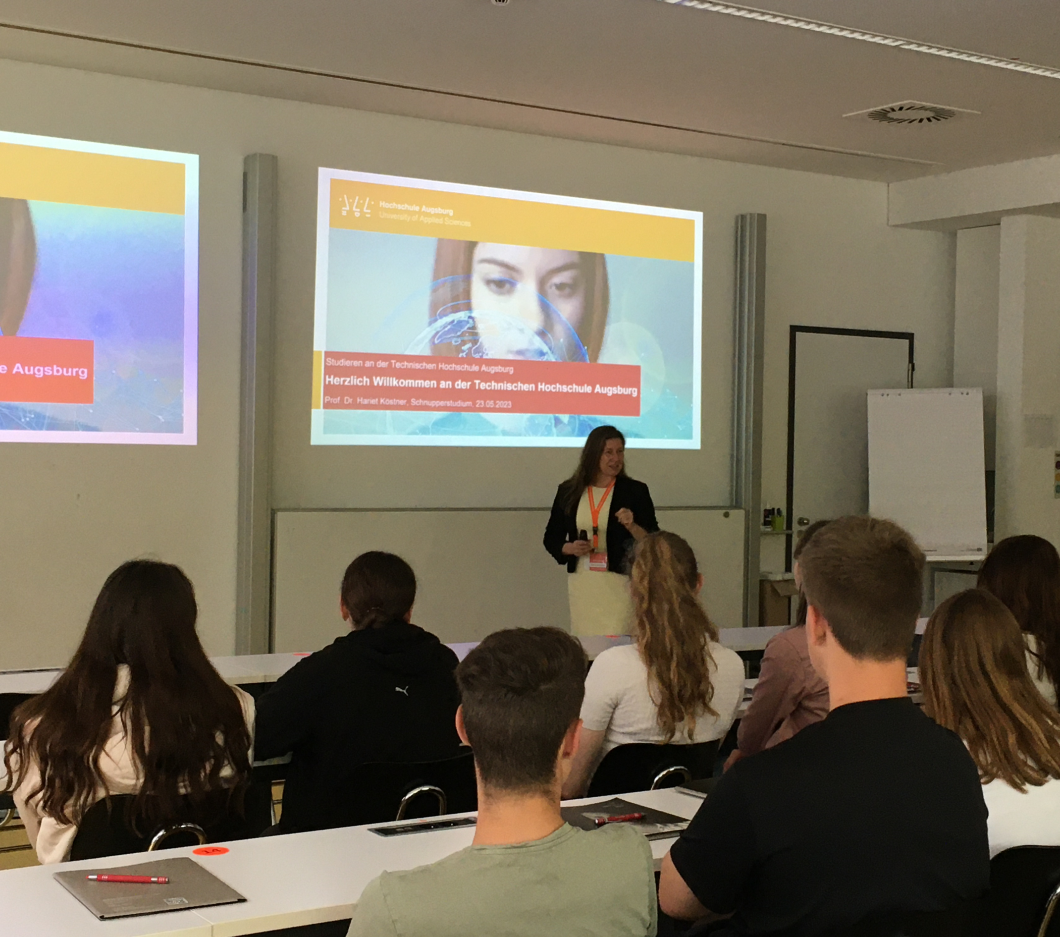 Auf dem Programm der Fakultät Wirtschaft für das Peutinger-Gymnasium stand die Teilnahme an den Zwischenpräsentationen des Projekts „Nachhaltiger Campus“ unter der Leitung von Prof. Dr. Sabine Joeris. Die Gymnasiast:innen erhielten die Möglichkeit, die kreativen Lösungsansätze der Studierenden kennenzulernen, ihr Bewusstsein für Nachhaltigkeit zu schärfen und Einblicke in die Projektarbeit an einer Hochschule zu gewinnen.