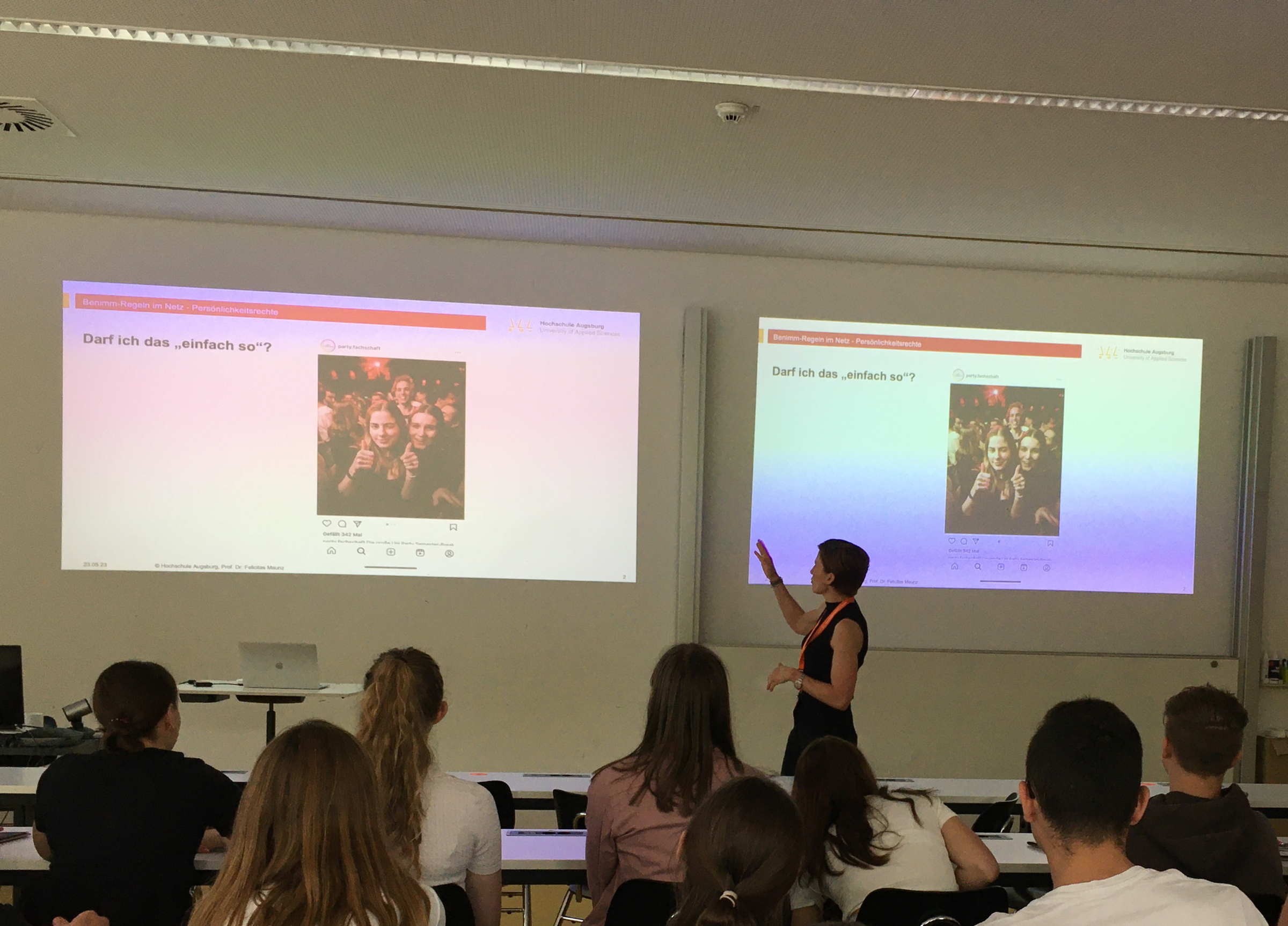 Es folgten zwei interaktive Veranstaltungen, bei denen ihnen topaktuelle Themen präsentiert wurden. Prof. Dr. Felicitas Maunz widmete sich dem Thema Persönlichkeitsrechte in den sozialen Medien und verdeutlichte wichtige Aspekte, die im digitalen Zeitalter beachtet werden sollten. Prof. Dr. Hariet Köstner gab ihnen einen Einblick in die Welt von Google und ChatGPT aus der Sicht einer Marketing-Expertin.