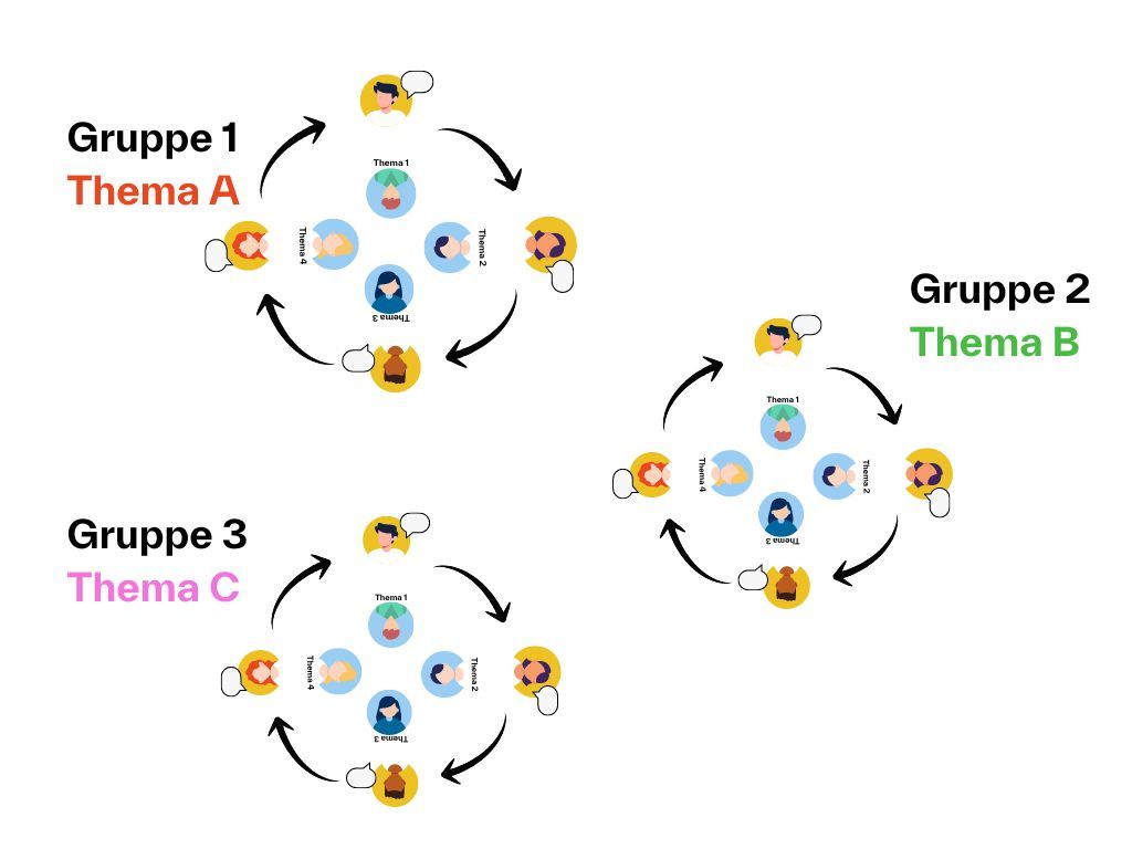 Wenn Sie genügend Platz haben, können Sie auch mehrere Zirkel-Gruppen parallel laufen lassen. Dabei können Sie allen Zirkel-Gruppen die gleichen Themen zuordnen