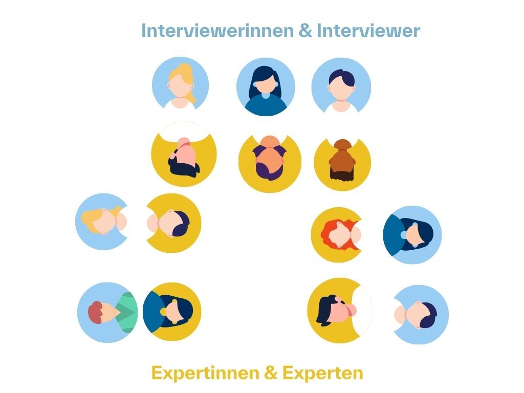 Zunächst finden sich alle Interviewerinnen und Interviewer in einem Stuhlkreis zusammen und drehen die Stühle nach außen. Anschließend nimmt immer eine Expertin bzw. ein Experte gegenüber Platz, sodass sie direkt den einzelnen Interviewpersonen zugewandt sind.