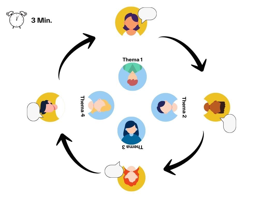 Nach etwa 3 Minuten ist die erste Runde vorbei und es wird rotiert. Alle Expertinnen und Experten rücken einen Platz im Uhrzeigersinn weiter.