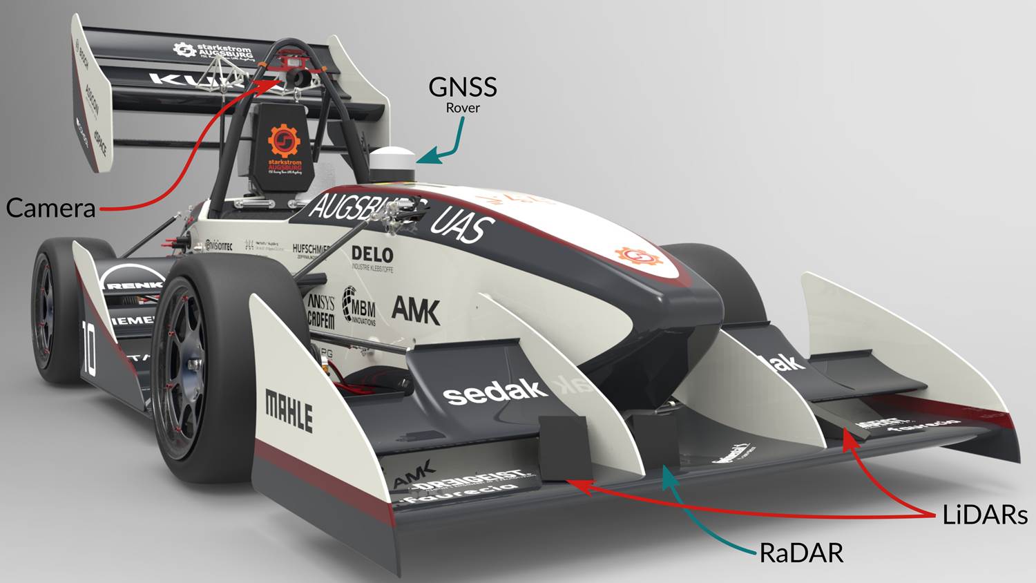 Fast zeitgleich wird an der Hochschule auch der Verein Starkstrom Augsburg gegründet. Hier bauen Studierende mit Unterstützung der Professoren der Hochschule Elektrorennfahrzeuge und beteiligen sich an Konstruktions- und Fahrwettbewerben der Formula Student in Konkurrenz mit Teams anderer Hochschulen aus der ganzen Welt. Größter Erfolg bisher: Platz 3 beim Beschleunigungsrennen des Driverless Fahrzeugs am Hockenheimring 2017 – und das unter erschwerten Bedingungen. „Ein Akku war kaputt. Wir mussten uns also mit dem Elektroauto und dem autonom fahrenden Renner einen Akku teilen, den also ständig umbauen. Man muss da ja auch vor dem Rennen durch die technischen Abnahmen durch und den Akku vorzeigen. Das war Stress“, erzählt Markgraf, trotzdem mit einem Lächeln im Gesicht. In den Wochen vor einem Rennen geht es immer sehr turbulent zu in der Halle von Starkstrom Augsburg im Sigma Techno Park in Augsburg. „Da werden Nächte durchgemacht, letzte Fehler beseitigt. Es muss ja alles termingerecht fertig werden. Und ein Erfolg beim Rennen ist dann immer eine große Befreiung nach dieser Anstrengung“, sagt Markgraf zufrieden.