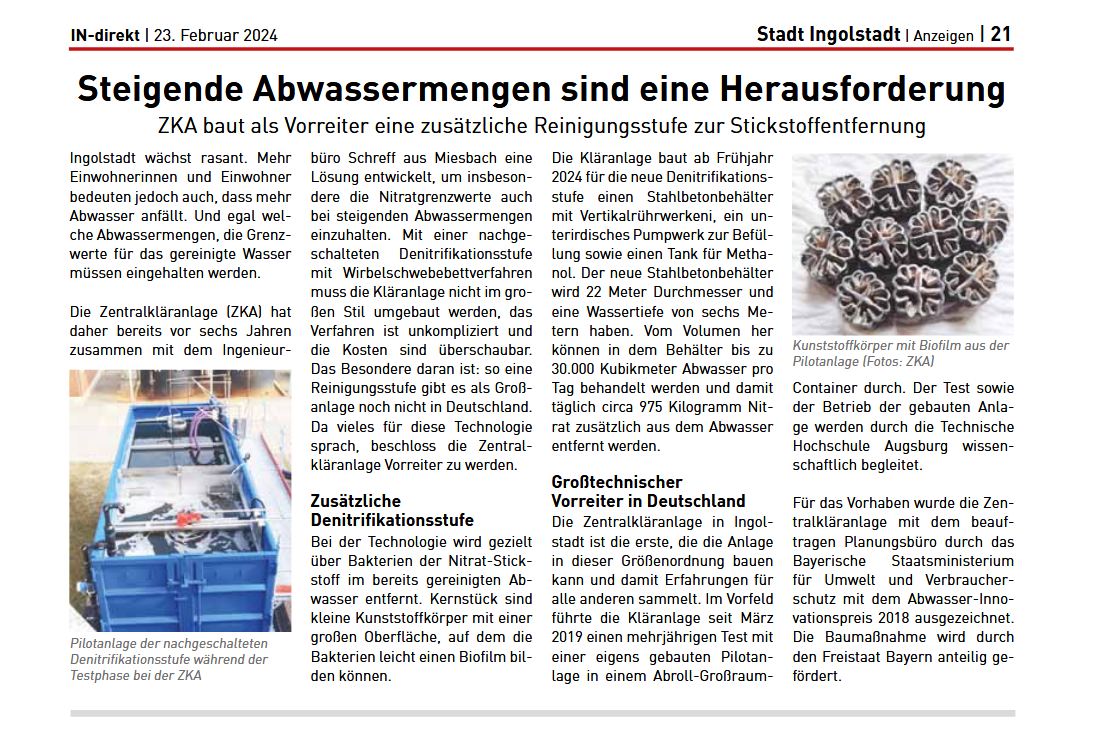 Auf der Zentralkläranlage Ingolstadt soll eine großtechnische Umsetzung einer nachgeschalteten Rest-Denitrifikation im Wirbelschwebebett erfolgen. Das Vorhaben wurde durch das Bayerische Staatsministerium für Umwelt und Verbraucherschutz StMUV mit dem Abwasser-Innovationspreis 2018 ausgezeichnet. Seit März 2019 wird eine Pilotanlage (siehe Foto) betrieben. Im Rahmen der wissenschaftlichen Untersuchungen sollen die gesammelten Erfahrungen durch den Betrieb der Pilotanlage und der Großtechnik für den Einsatz auf anderen Kläranlagen erarbeitet werden und damit einen Beitrag zur Entwicklung neuer Technologien bei der Abwasserbehandlung leisten.