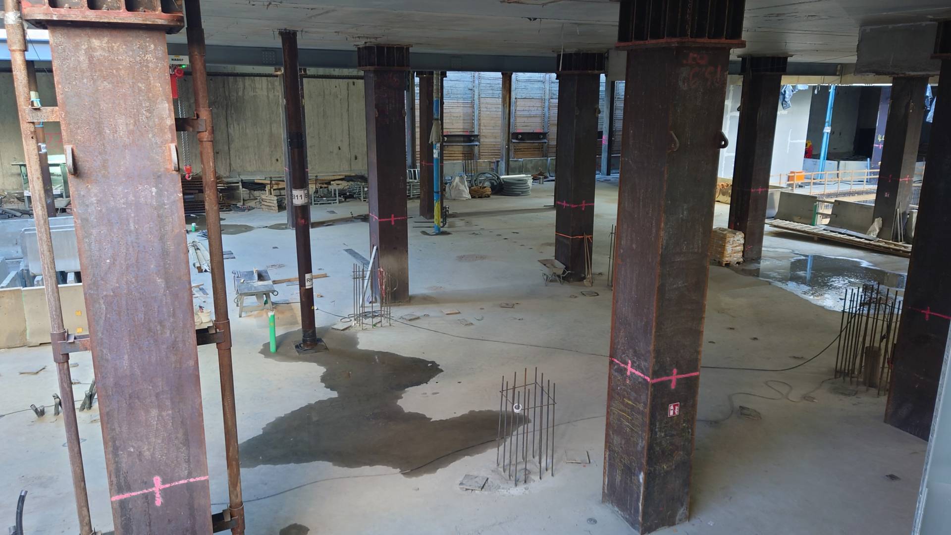 Das Bauwerk wird von oben betrachtet drei Fußballfelder groß und ist bis zu 65 Meter tief. Aktuell wird unterhalb der ersten Zwischendecke der Boden ausgehoben. Gebaut wird hier in der „Deckelbauweise“, bei der im Schutz einer umschließenden Schlitzwand Etage für Etage nach unten gegraben wird. Ist die Ebene einer Zwischendecke erreicht, so wird diese betoniert und anschließend der Aushub darunter fortgeführt.