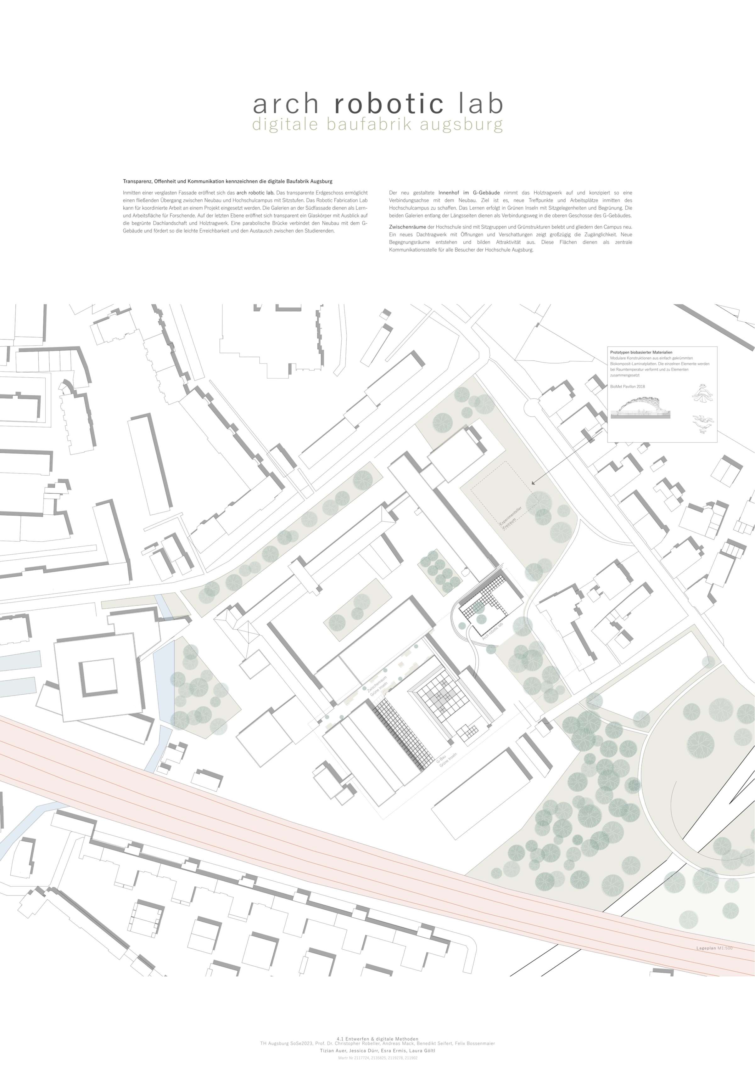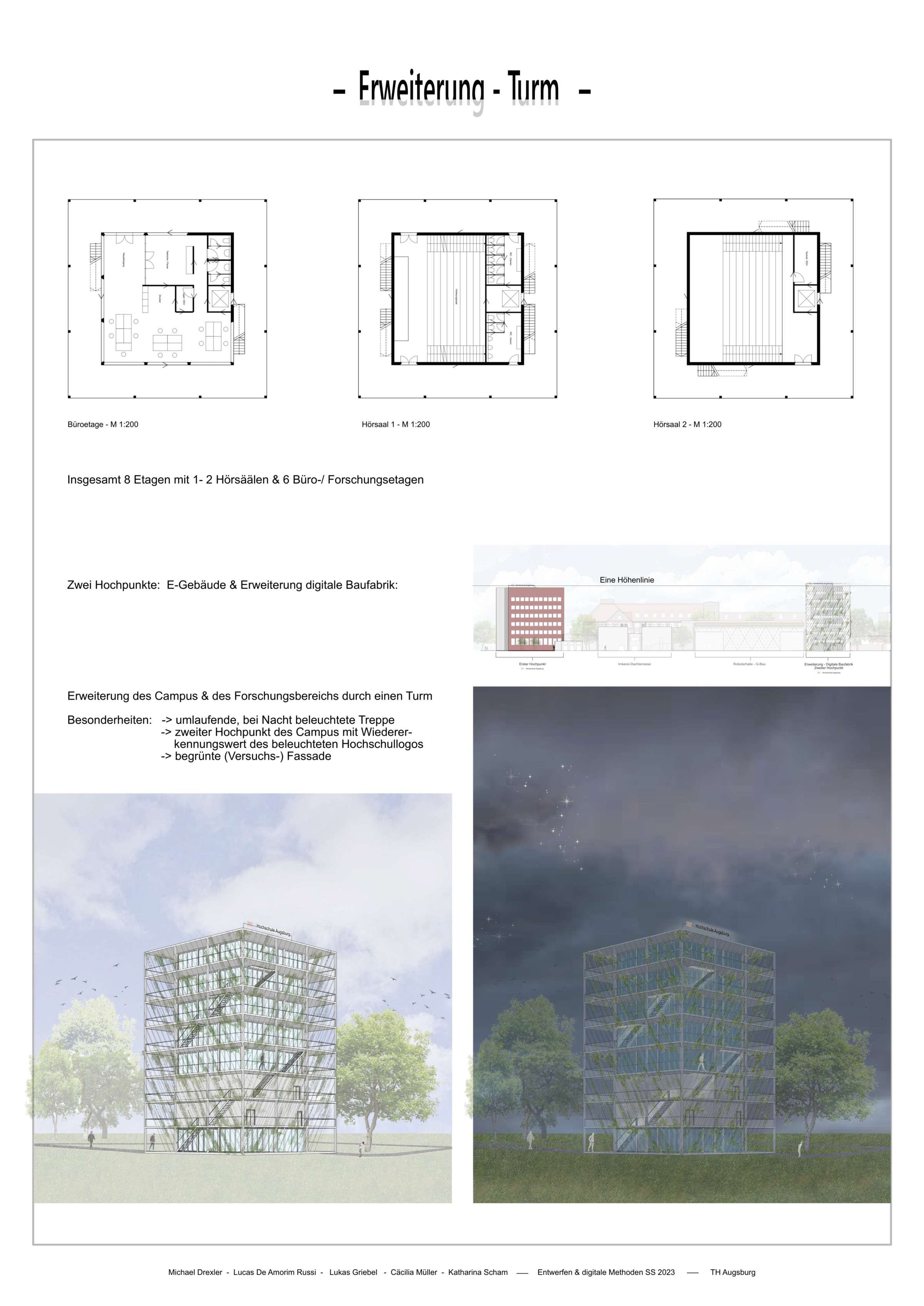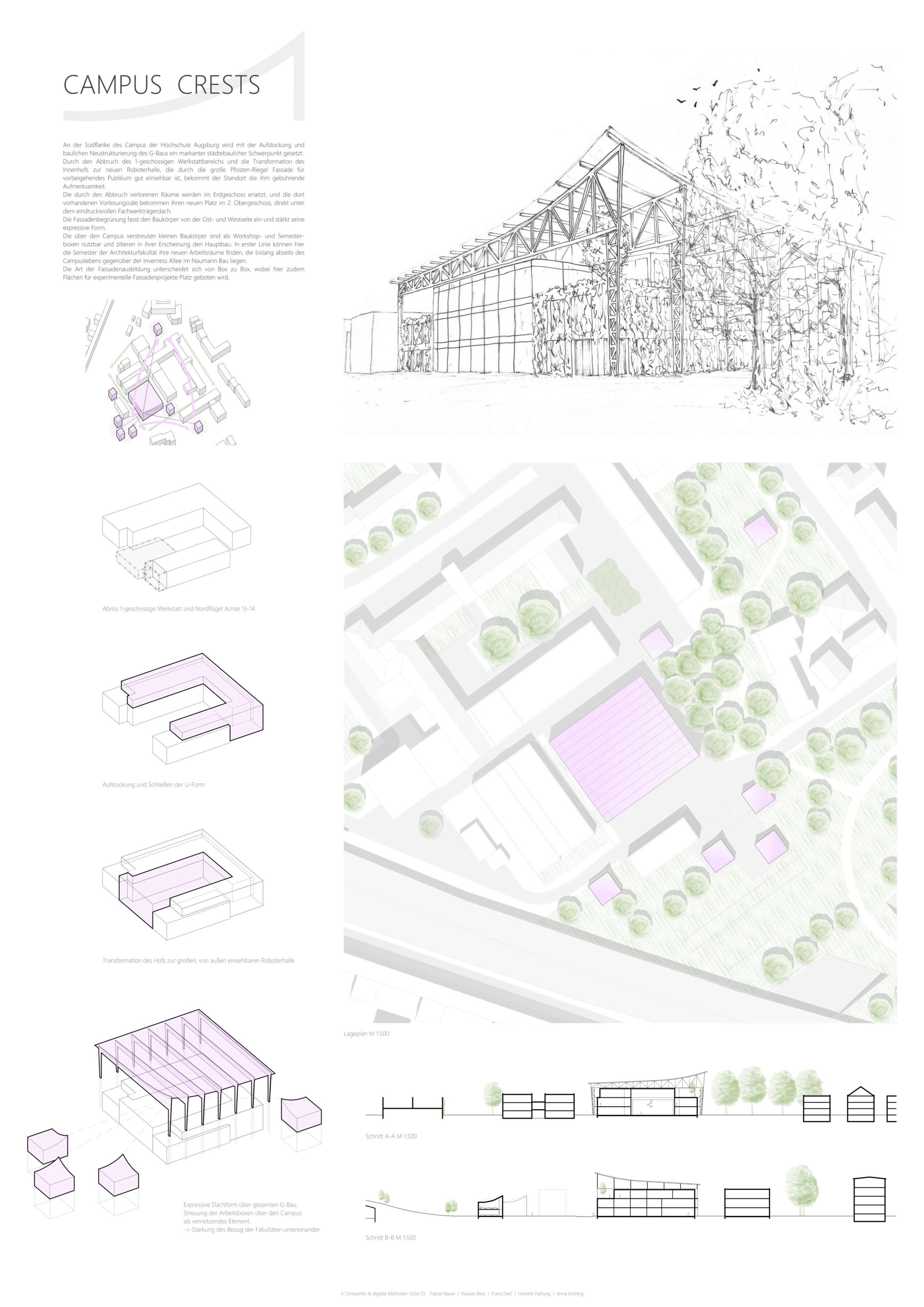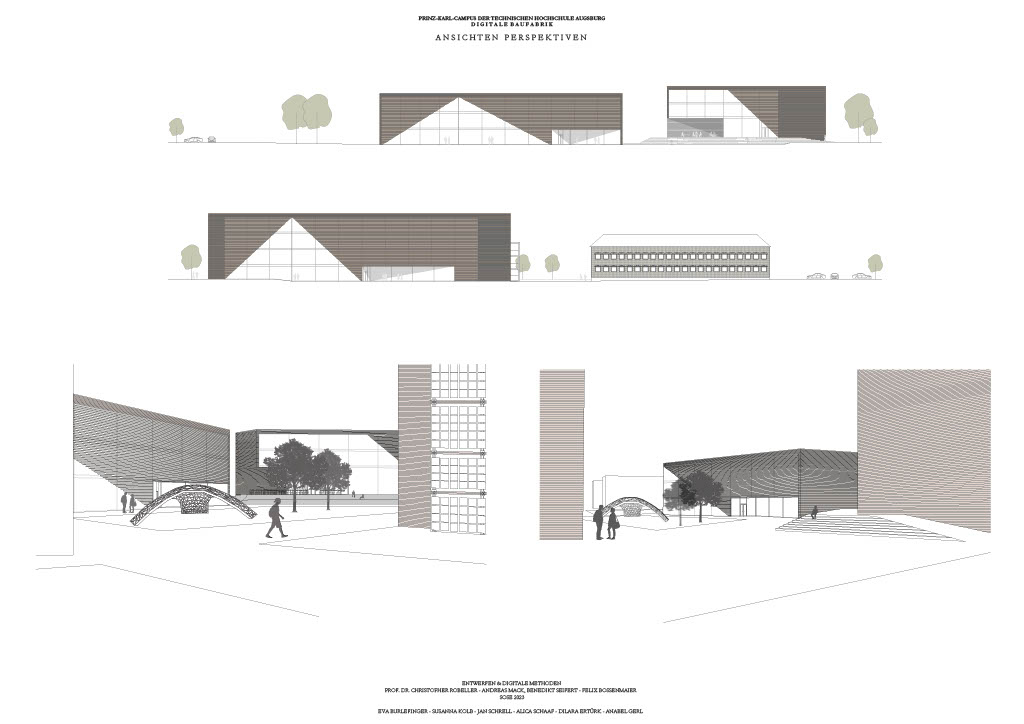 Der Höhepunkt des Semesters war die Präsentation der Ergebnisse in den Fluren des C-Baus. Hier stellten die Gruppen ihre spannenden Entwürfe in Form von Grundrissen, Schnitten und Ansichten vor, aber zeigten auch Visualisierungen, Modelle und sogar eine Animation für eine mögliche Weiterentwicklung des Campus und eine mögliche innovative neue digitale Baufabrik.