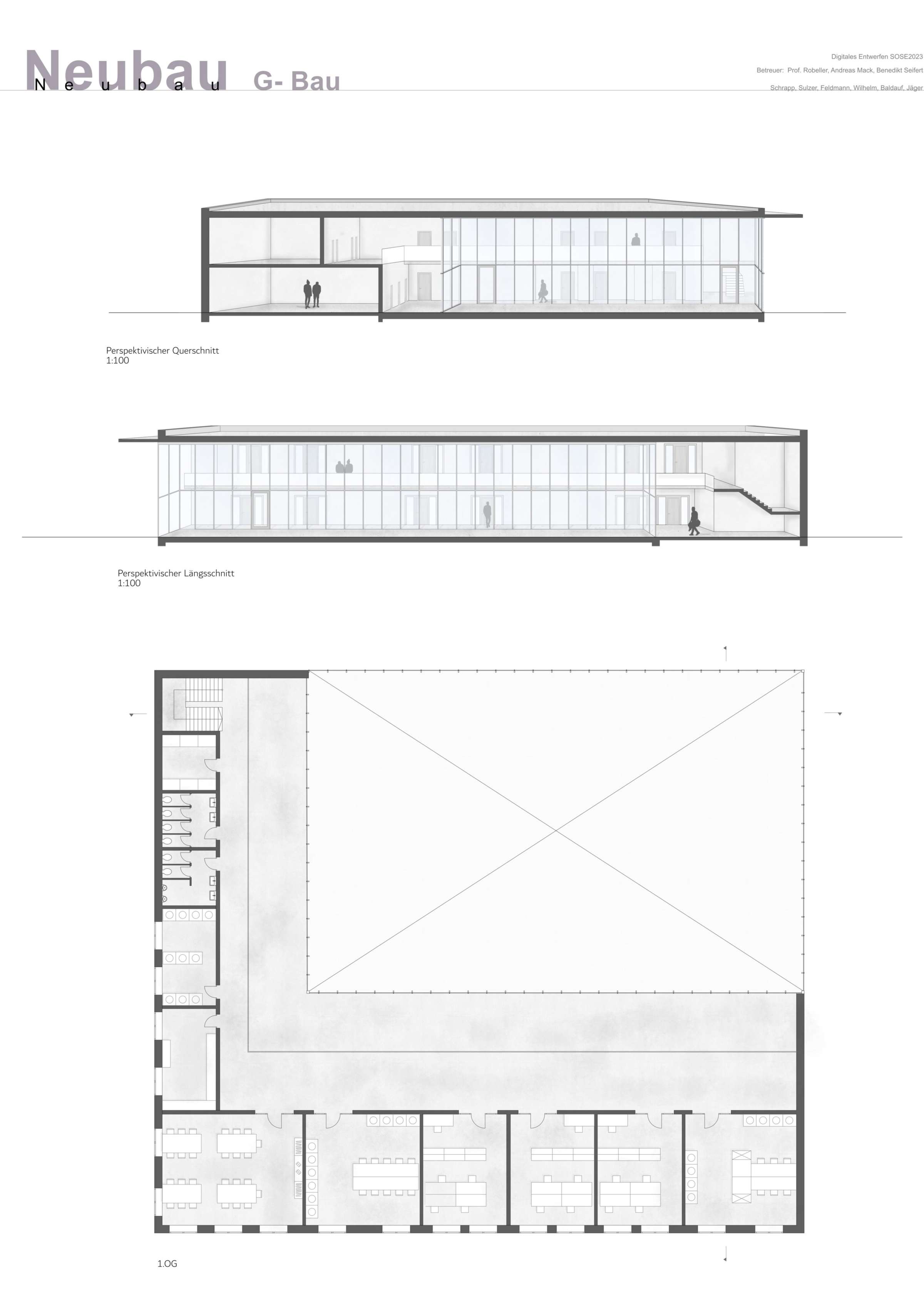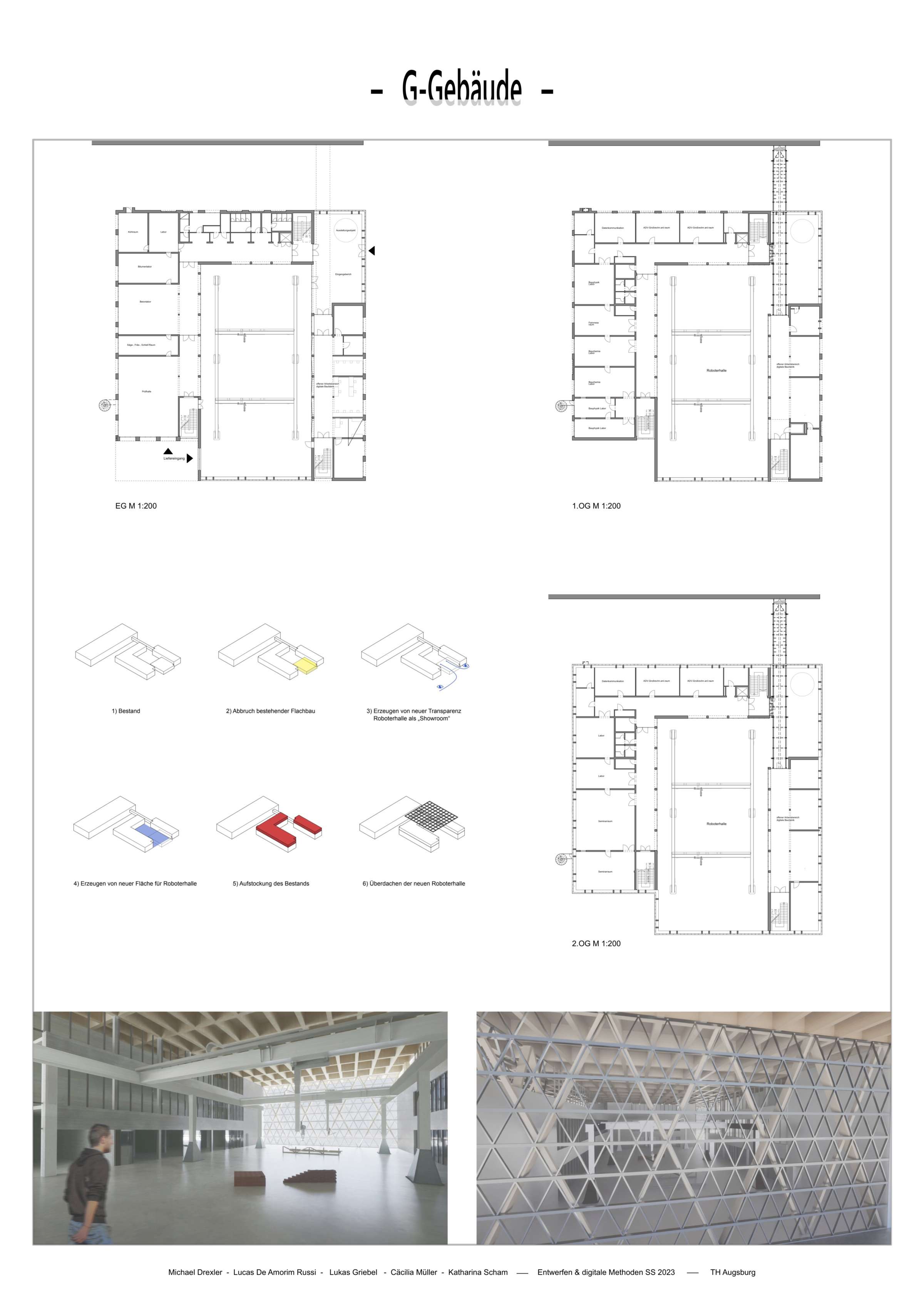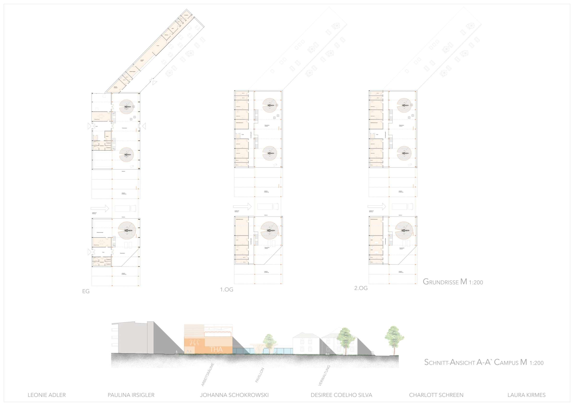 Der Höhepunkt des Semesters war die Präsentation der Ergebnisse in den Fluren des C-Baus. Hier stellten die Gruppen ihre spannenden Entwürfe in Form von Grundrissen, Schnitten und Ansichten vor, aber zeigten auch Visualisierungen, Modelle und sogar eine Animation für eine mögliche Weiterentwicklung des Campus und eine mögliche innovative neue digitale Baufabrik.