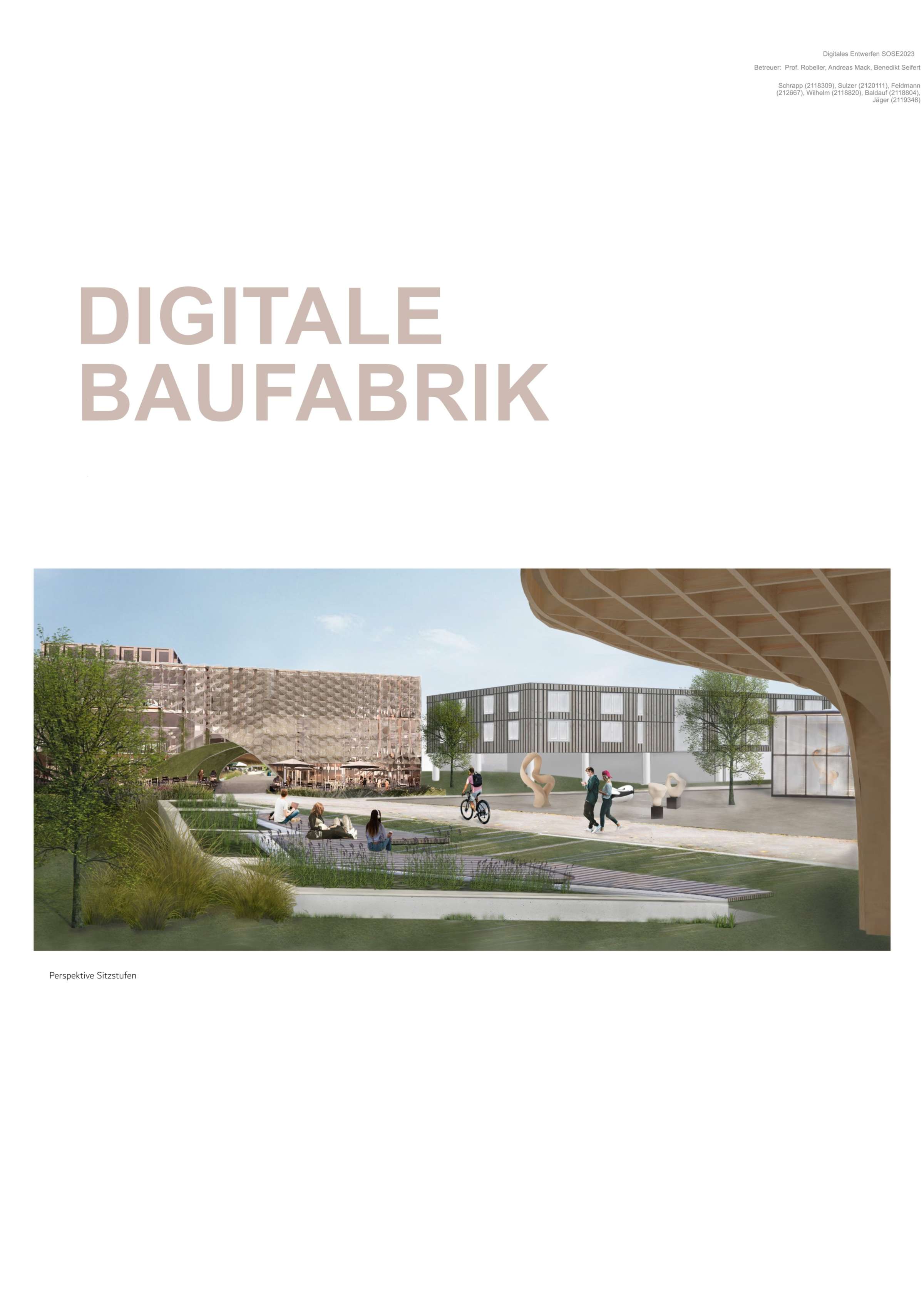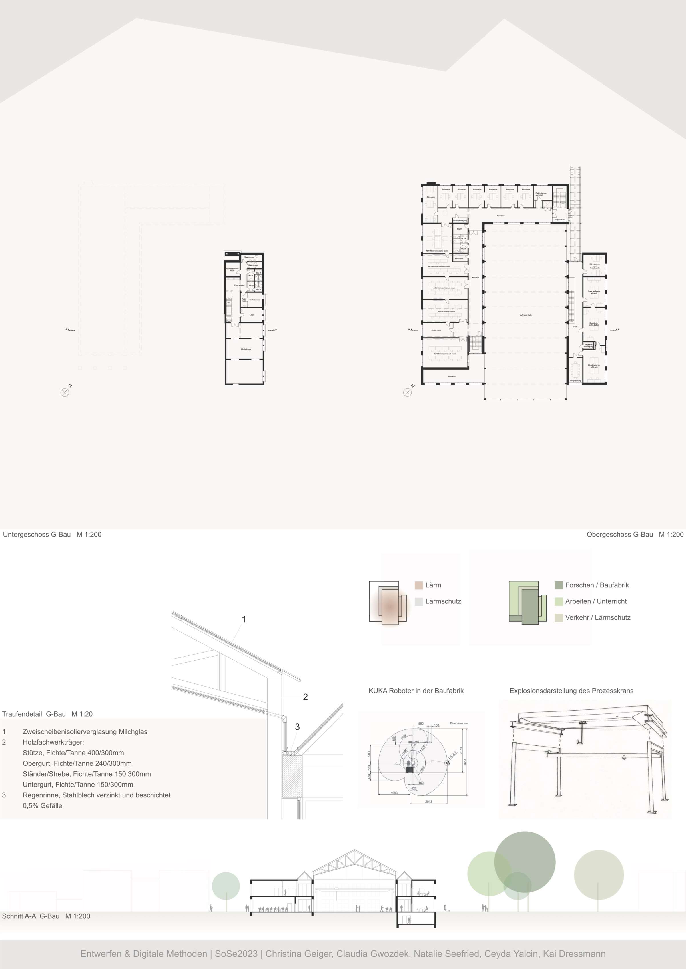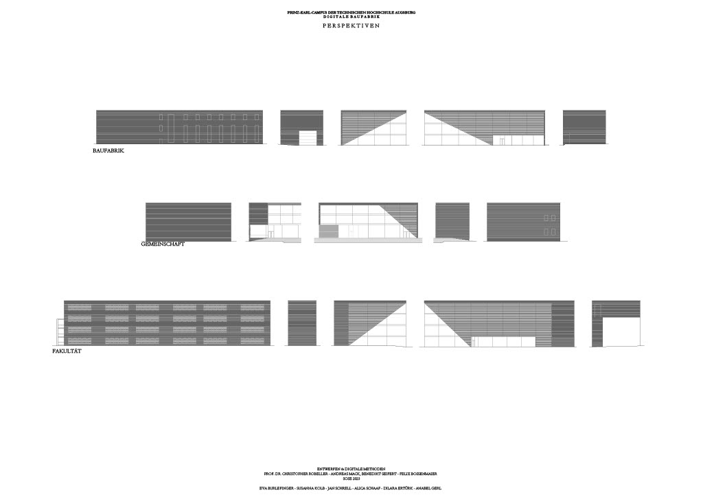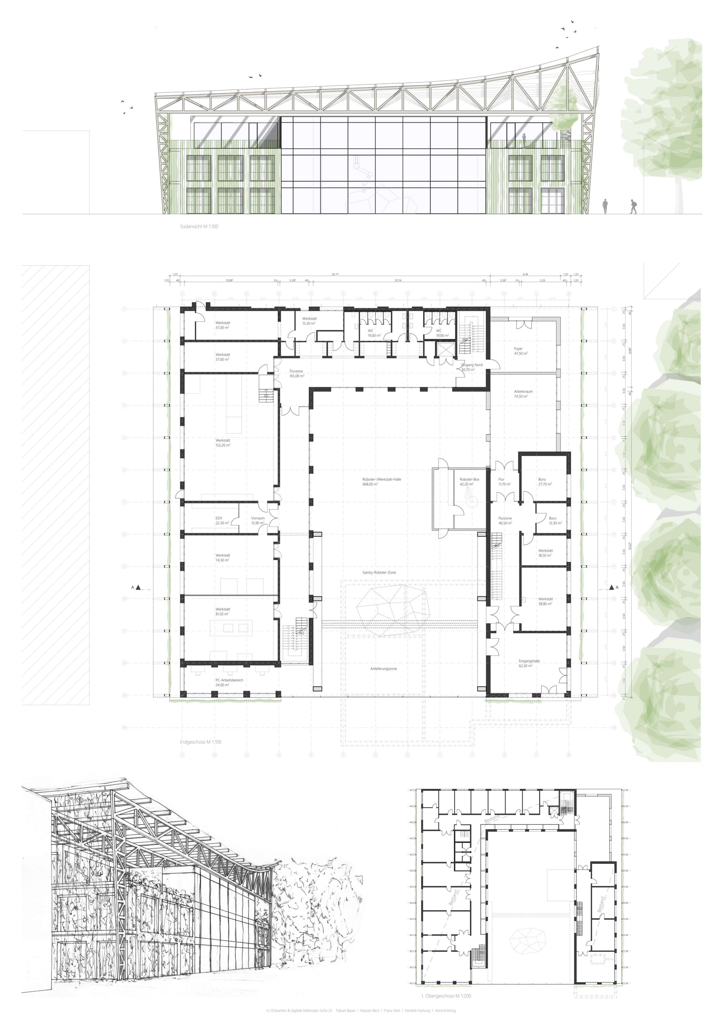 Im Anschluss an die Konzepterstellung widmeten sich die Teams jeweils einem Gebäude, das als wegweisende digitale Baufabrik dienen und spannende Experimente ermöglichen soll. Die Baufabrik fungiert in erster Linie als Labor, aber auch als Showroom und Austauschort für verschiedene Fachrichtungen, wobei der Fokus auf der digitalen Fabrikation und dem Holzbau liegt.