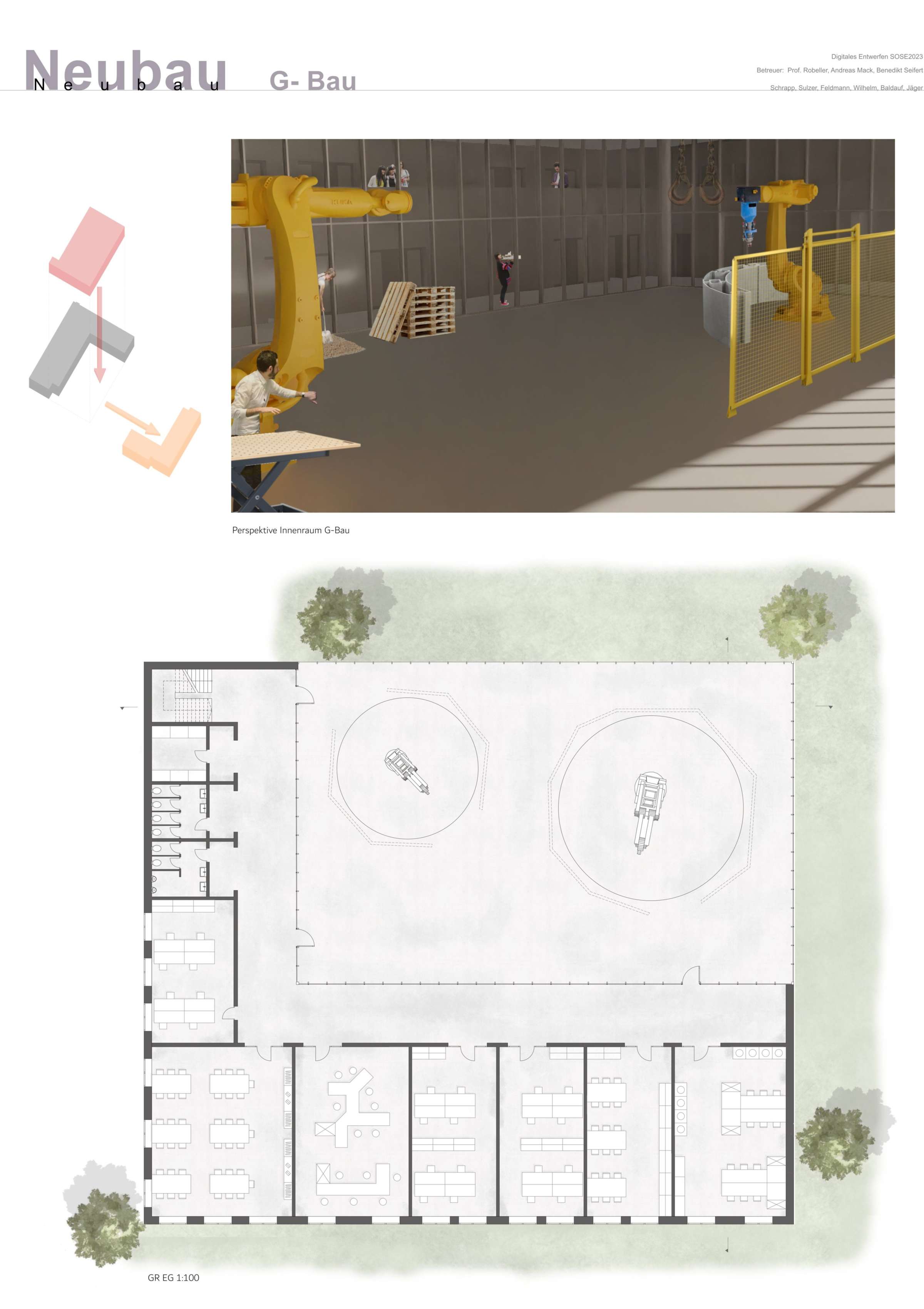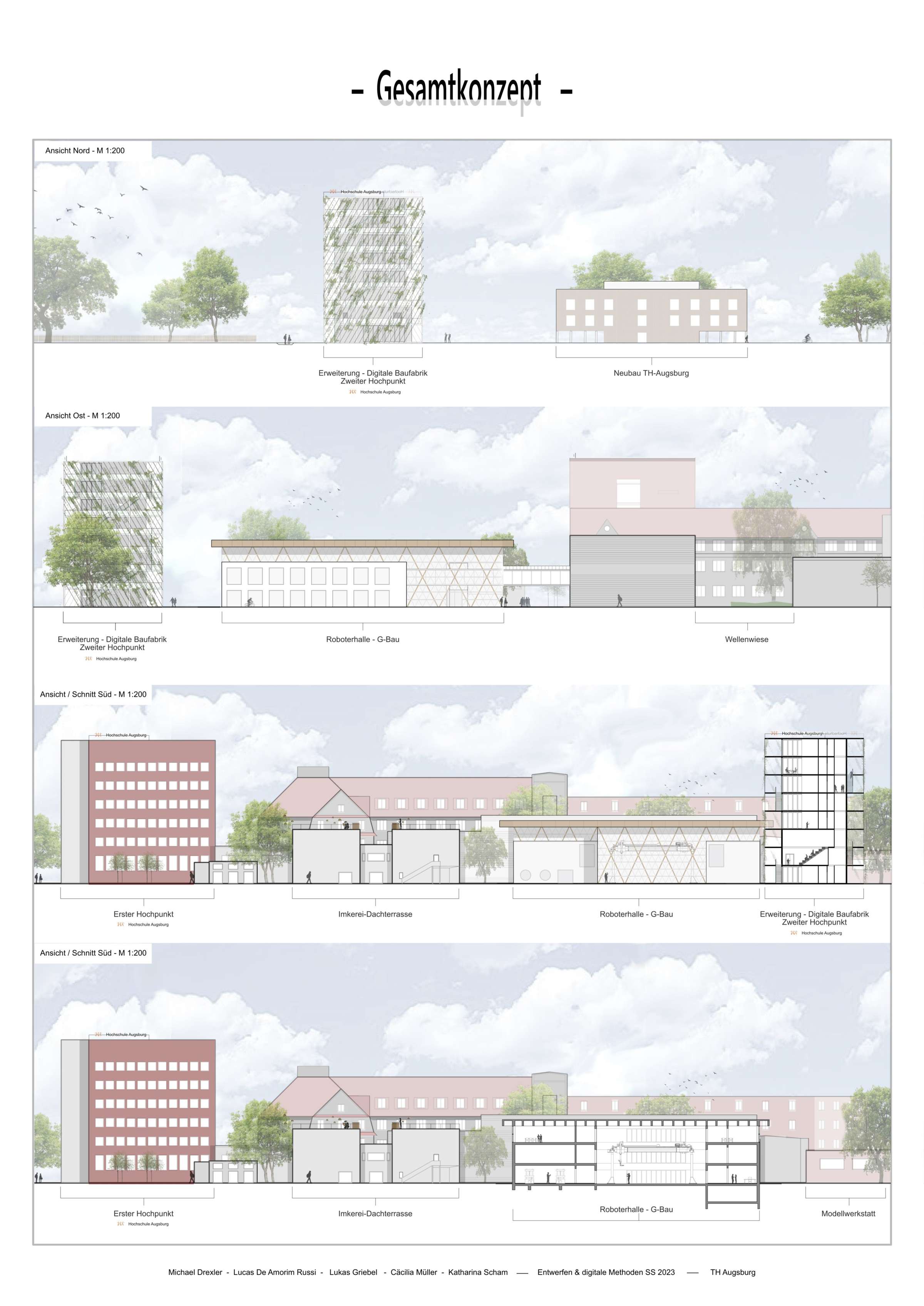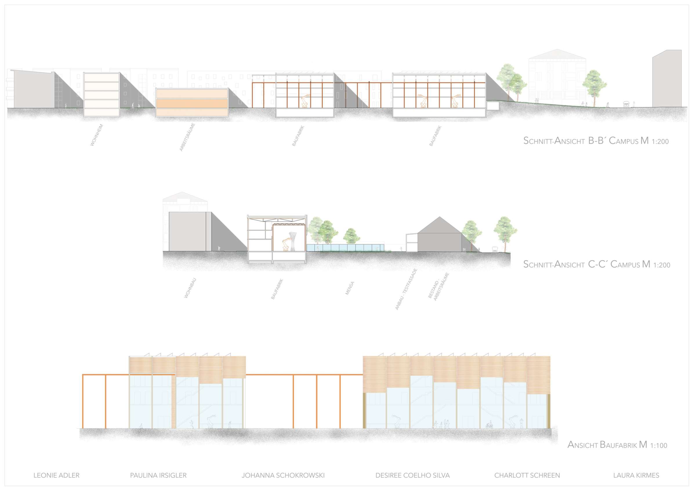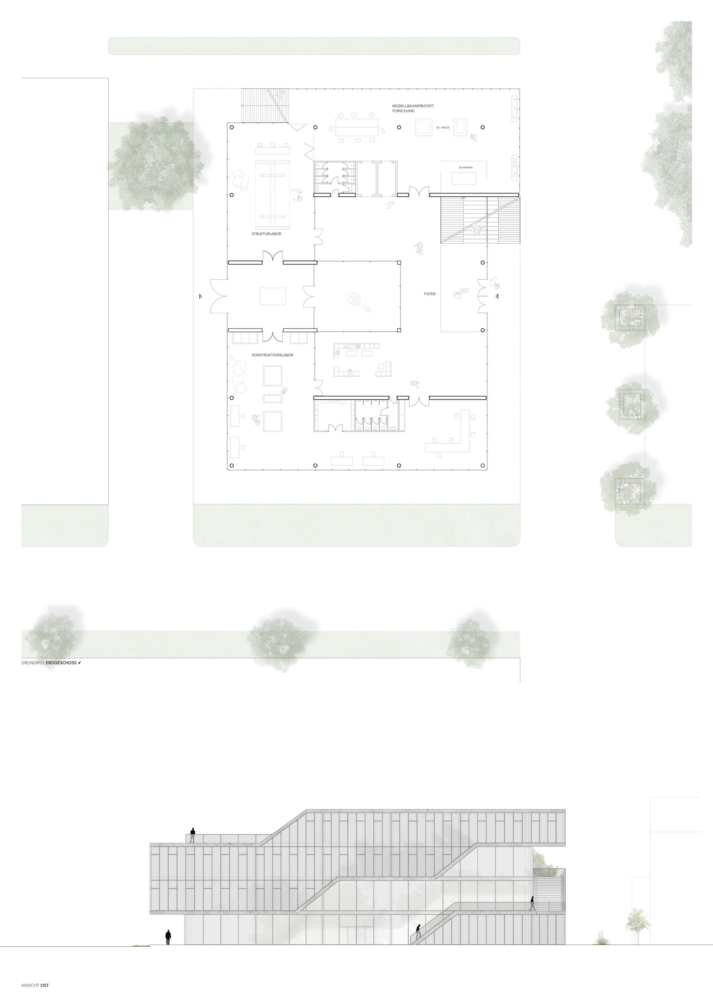 Im Anschluss an die Konzepterstellung widmeten sich die Teams jeweils einem Gebäude, das als wegweisende digitale Baufabrik dienen und spannende Experimente ermöglichen soll. Die Baufabrik fungiert in erster Linie als Labor, aber auch als Showroom und Austauschort für verschiedene Fachrichtungen, wobei der Fokus auf der digitalen Fabrikation und dem Holzbau liegt.