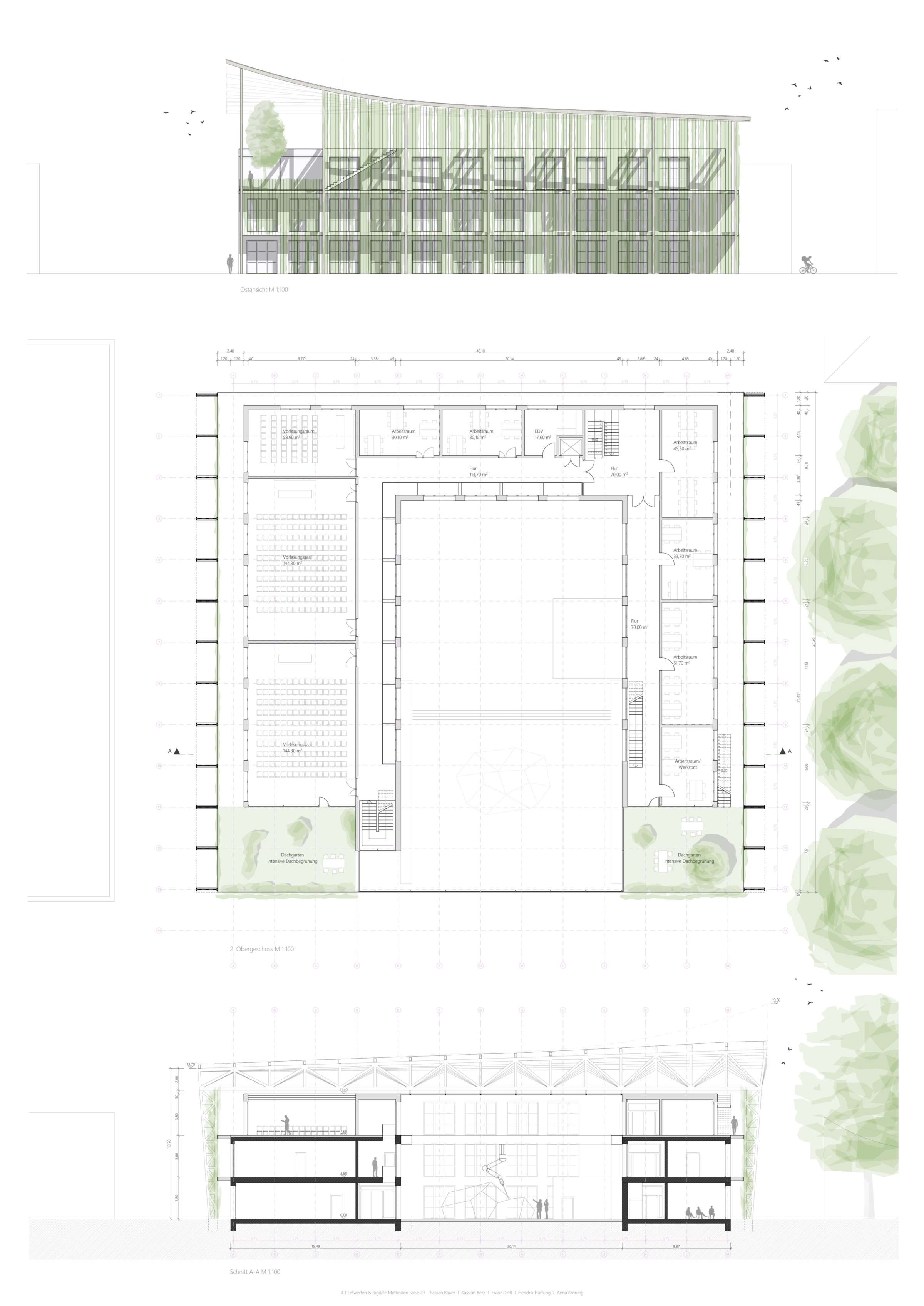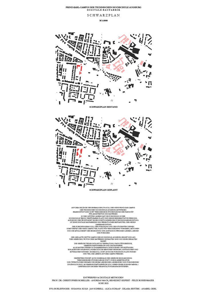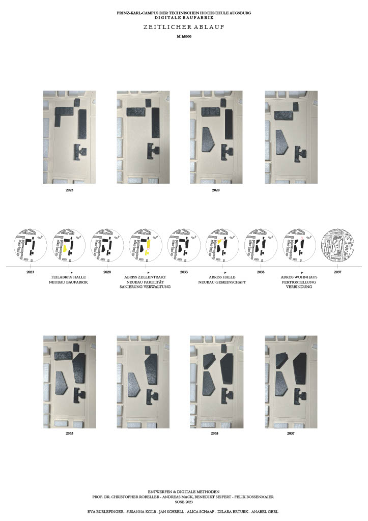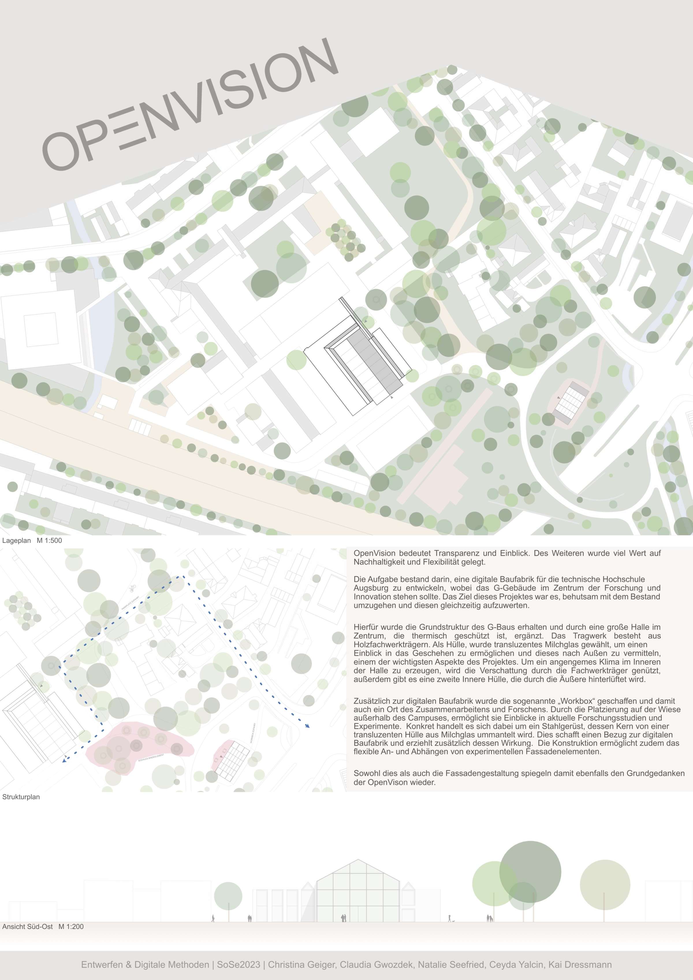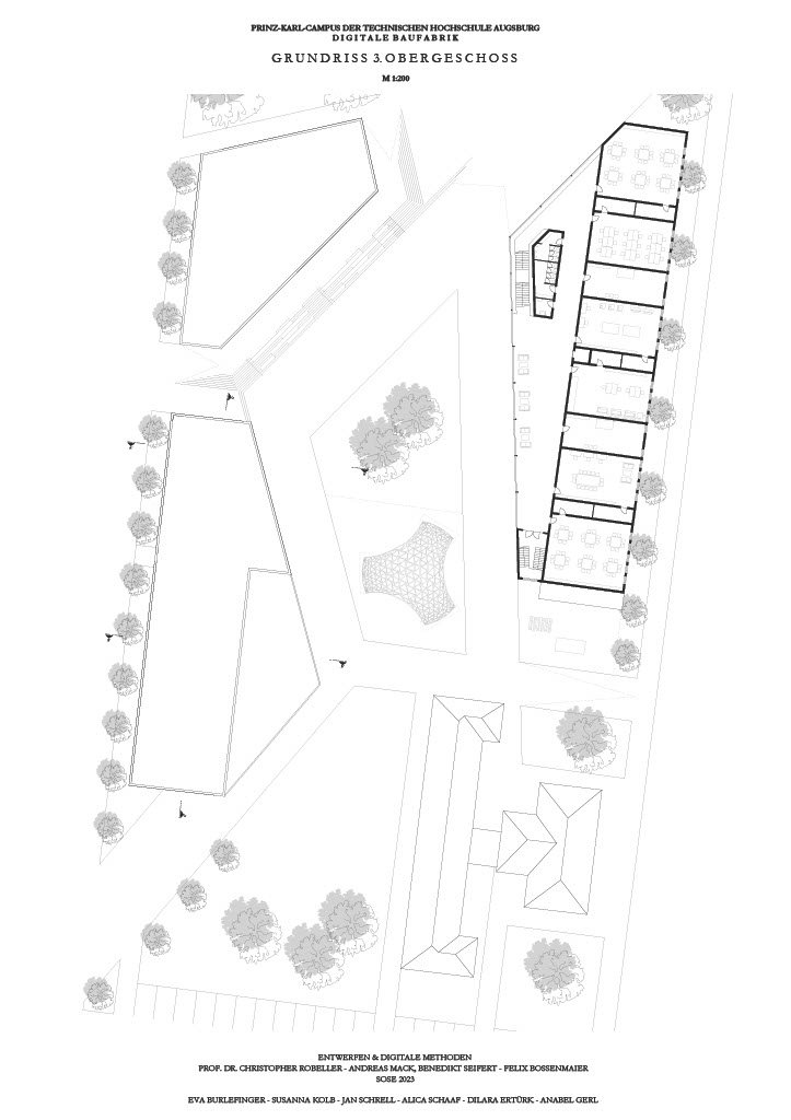 Im Anschluss an die Konzepterstellung widmeten sich die Teams jeweils einem Gebäude, das als wegweisende digitale Baufabrik dienen und spannende Experimente ermöglichen soll. Die Baufabrik fungiert in erster Linie als Labor, aber auch als Showroom und Austauschort für verschiedene Fachrichtungen, wobei der Fokus auf der digitalen Fabrikation und dem Holzbau liegt.