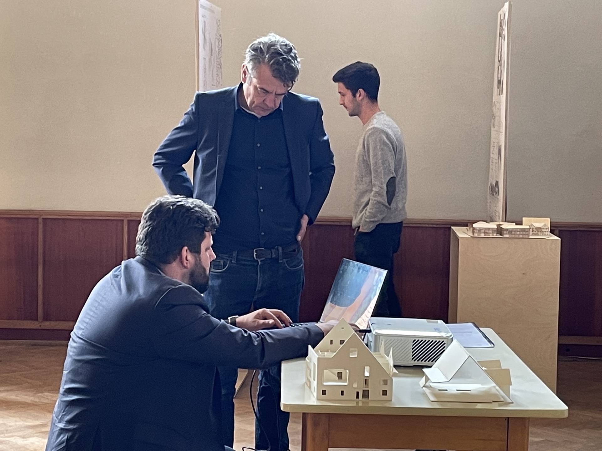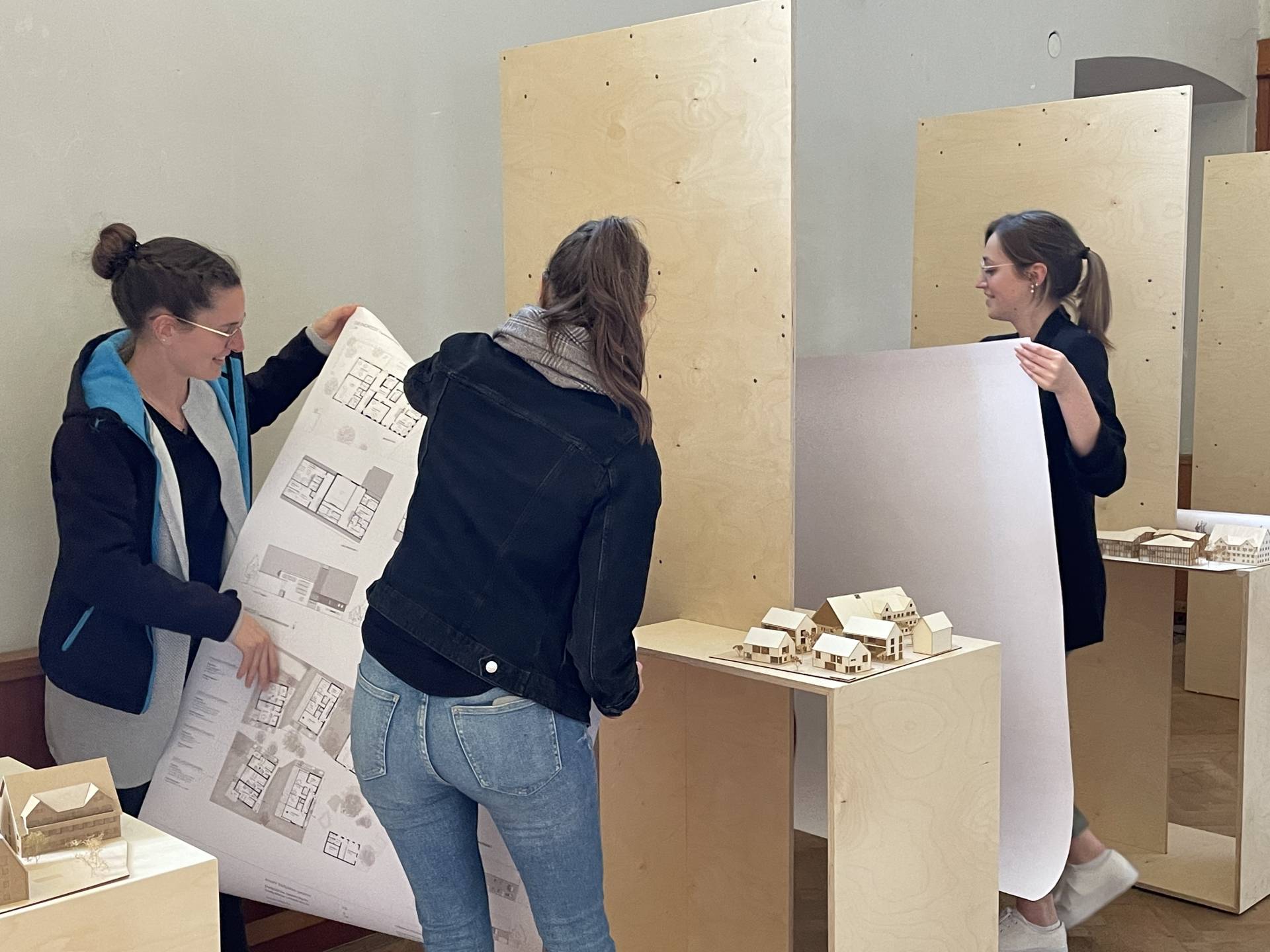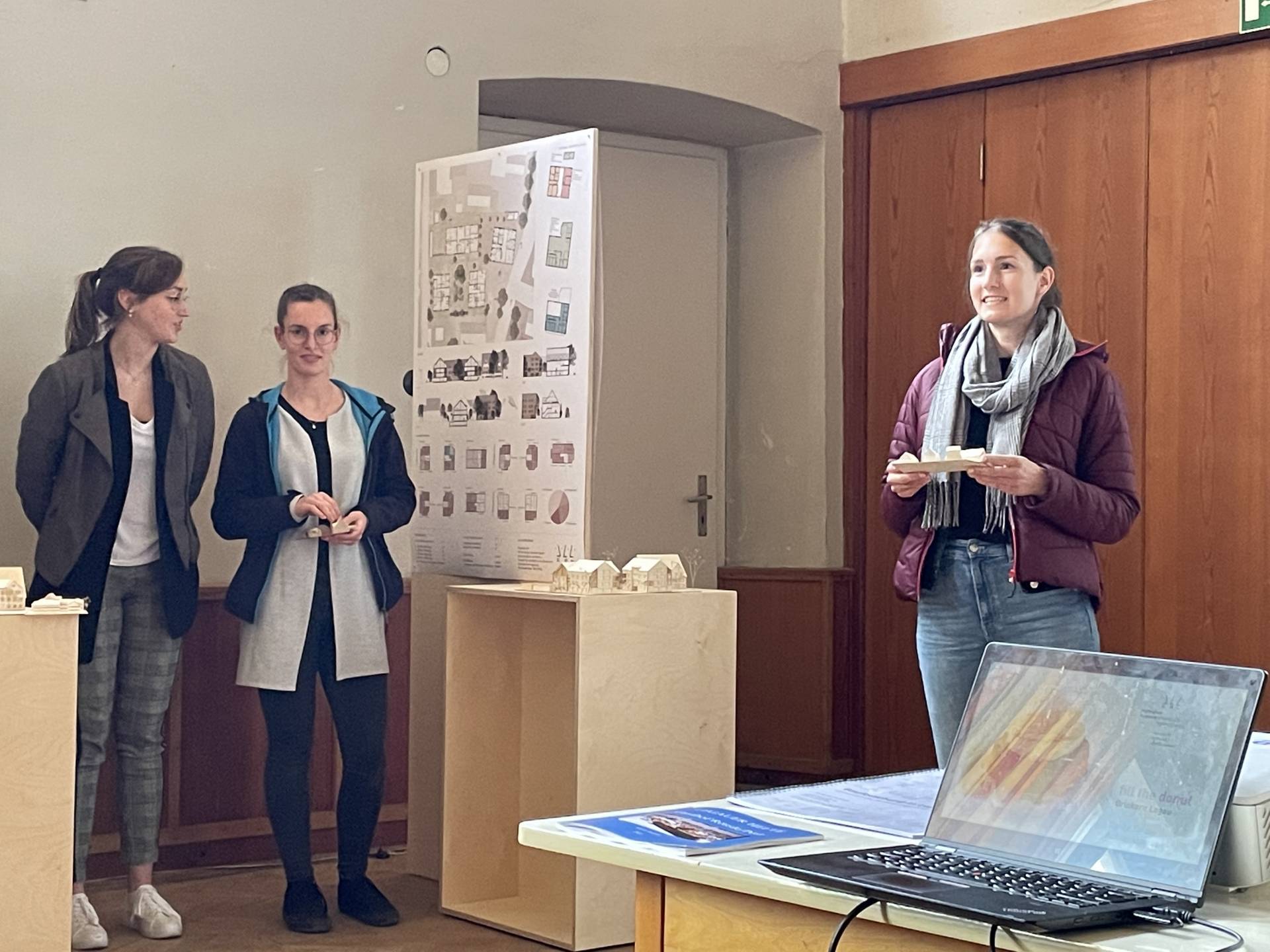 Die Ergebnisse des Projektstudios ‚Fill the donut – Ortskern Legau‘ wurden anhand von acht studentischen Arbeiten der lokalen Bevölkerung in einer Ausstellung im Mai 2022 vorgestellt. Ebenfalls Teil der Ausstellung bildeten die Analysen zur Ortsentwicklung und zum Bestandsgebäude, die im parallel verlaufenden Projektseminar erarbeitet wurden. Die Ausstellung eröffnete Bürgermeister Franz Abele und Dr. Thomas Martini als Vertreter der Grundstückseigentümer. Der Architekt und Fachautor Florian Aicher hatte den Kontakt zur Hochschule Augsburg hergestellt und war ebenfalls anwesend. Der Veranstaltungssaal der alten Post, der für die Veranstaltung nach langer Pause ausnahmsweise seine Pforten öffnete, war von zahlreichen interessierten Bürgern gut besucht.