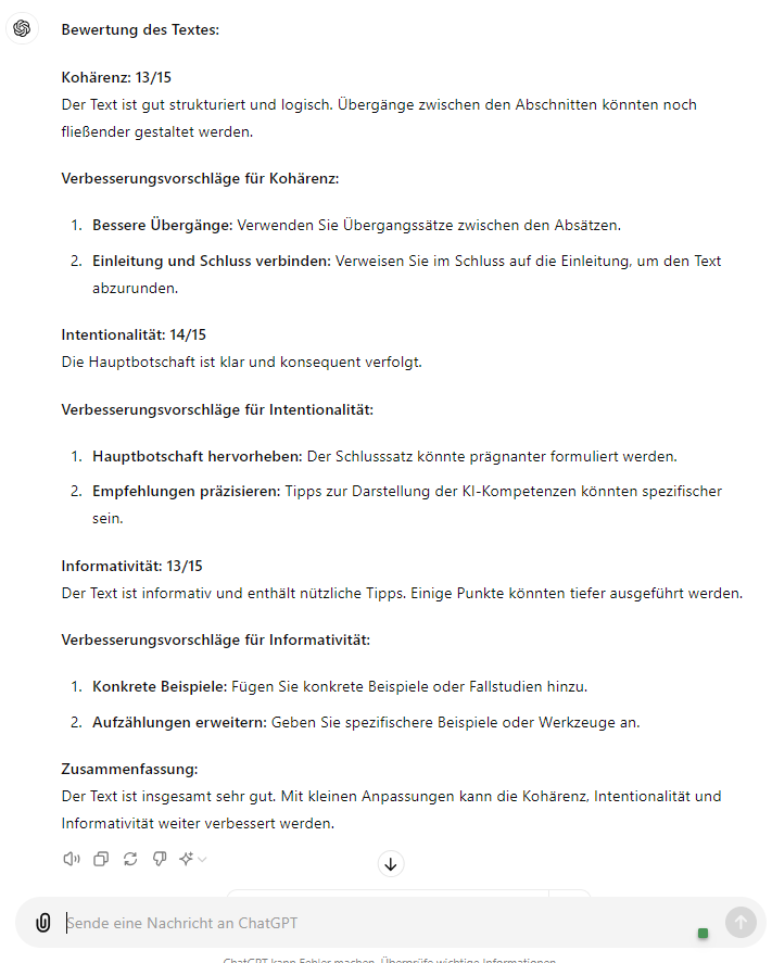 ChatGPT is an AI tool that has been publicly available since 2022 and is based on a large neural network. It was developed by the OpenAI organization and trained with a large amount of text data collected from the internet and digital books. ChatGPT can perform a variety of tasks such as generating, summarizing and completing texts or answering questions based on natural language input - also known as a "prompt". ChatGPT also takes into account the course of the dialog.