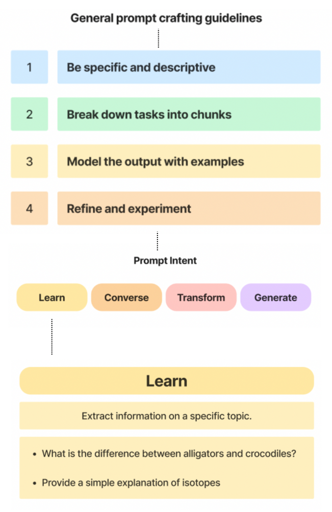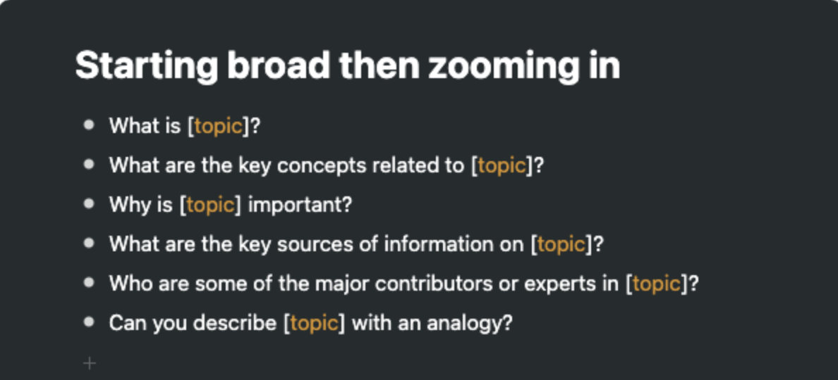 For each of these goals, in turn, there are approaches for an effective prompt: if you are dealing with a topic that is brand new for you to learn, for example, you should start broad with your questions to get a general idea of the "shape" of a topic, and then go deeper (see image below).