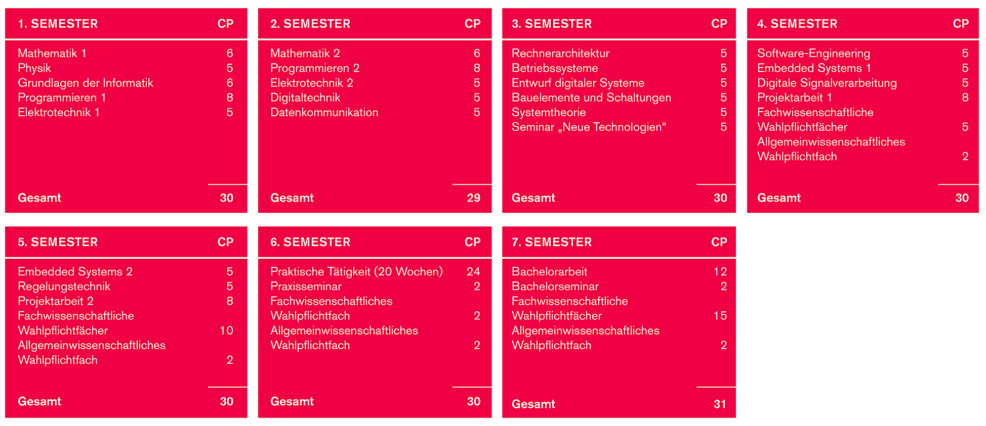 The course comprises a total of seven semesters, consisting of a two-semester foundation course followed by the main course, lasting five semesters. During the first two semesters, students will be given a good grounding in mathematics, physics, electrical engineering and computer science. The main course consists of four academic semesters and one practical semester. During this practical semester, students work on a project that makes practical use of the knowledge they have gained, as well as learning how to work independently on an engineering project in industry. The industry internship is supplemented by accompanying courses at the university.