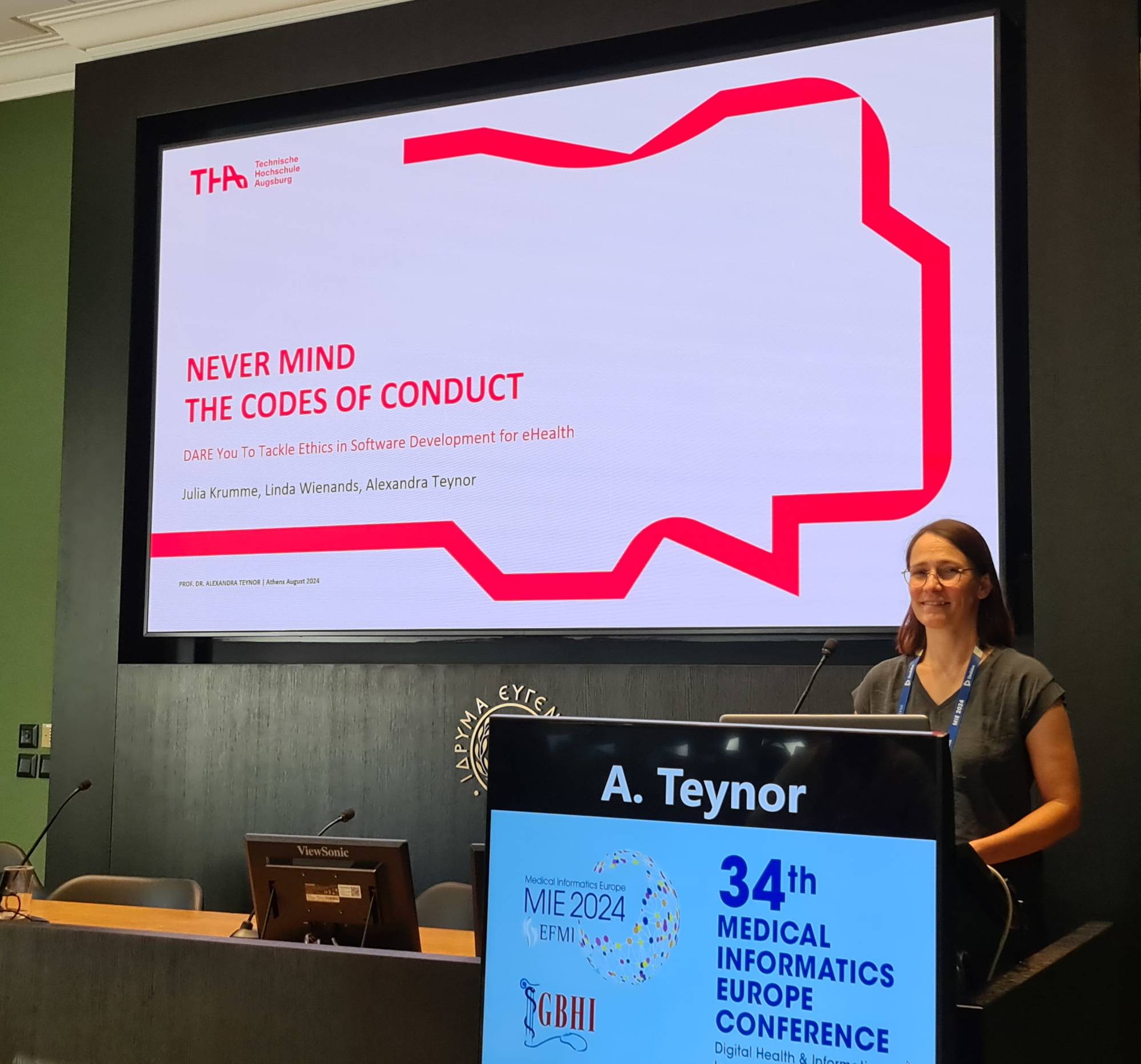 We were able to present brand new results from our THA_digileg at MIE2024, the annual conference of the EFMI-European Federation for Medical Informatics: Never mind the codes of conduct - DARE to tackle ethics in agile software development. With the DARE method, ethical issues can be tackled during the development process with the help of an ethics canvas, principle cards, harmonised question cards to uncover ethical problems and ethical estimation poker cards to weigh up conflicts.