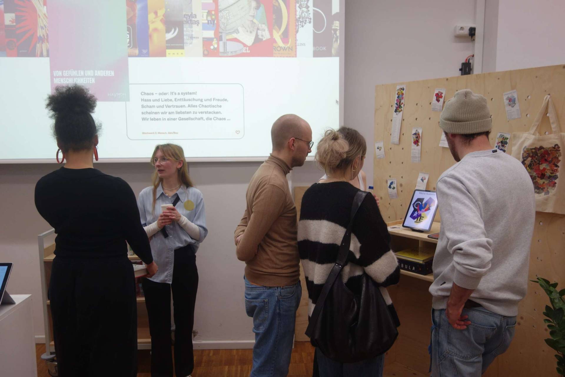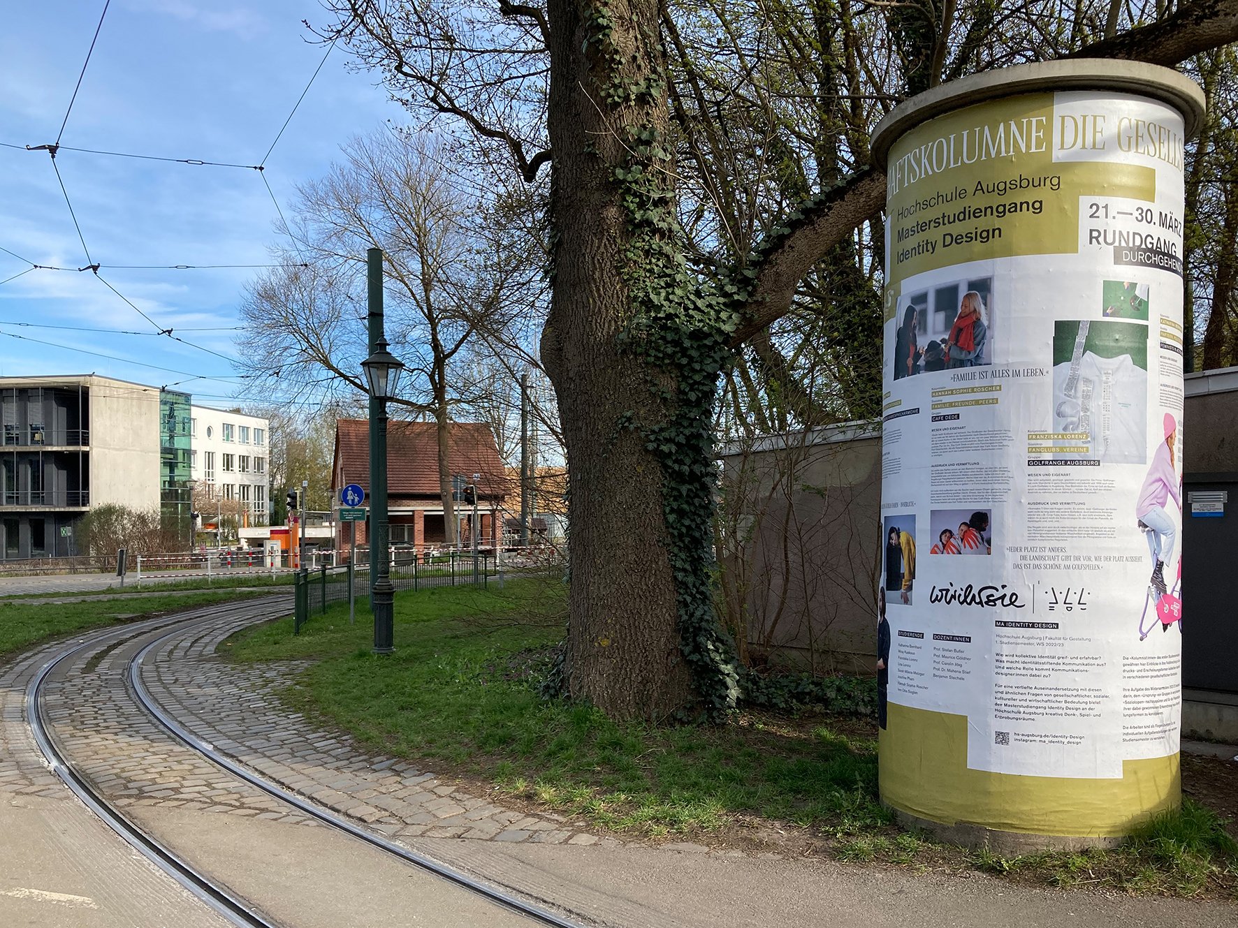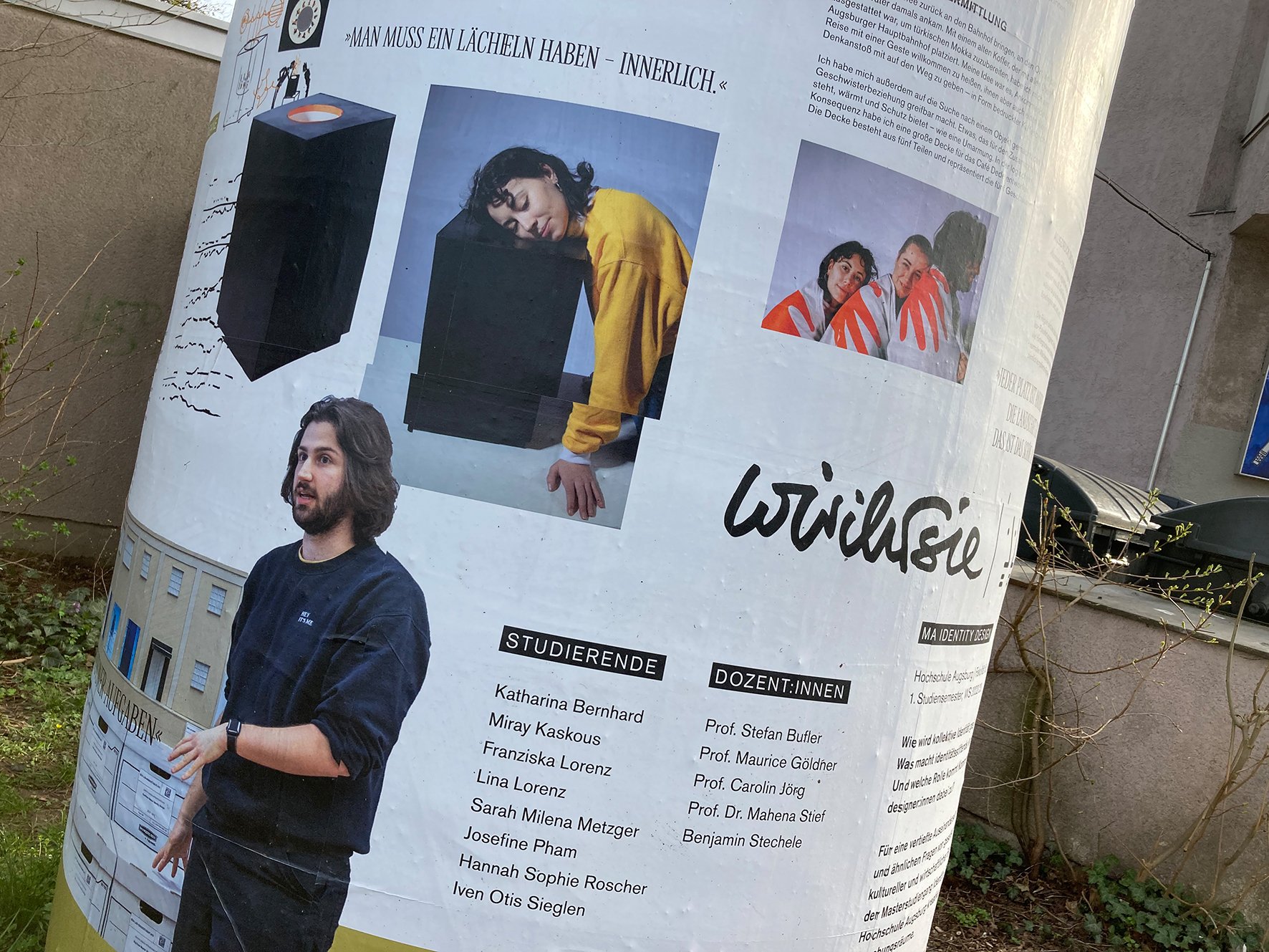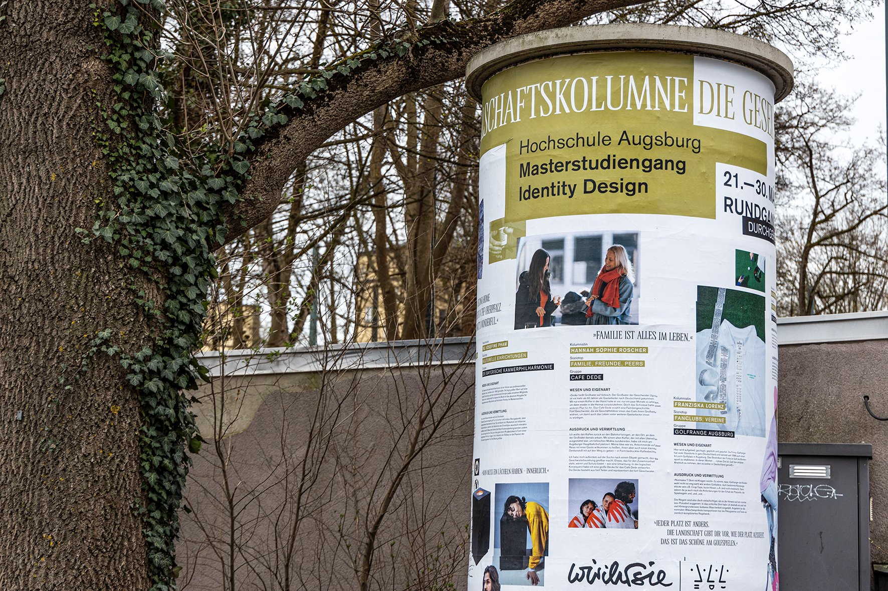 Bildergalerie zur Ausstellung der MA Identity Design Studienarbeiten des Jahrgangs’22 auf einer zur »Gesellschaftskolumne« umgestalteten Litfaßsäule mit Impressionen vom »Ausstellungsrundgang« (Vernissage).