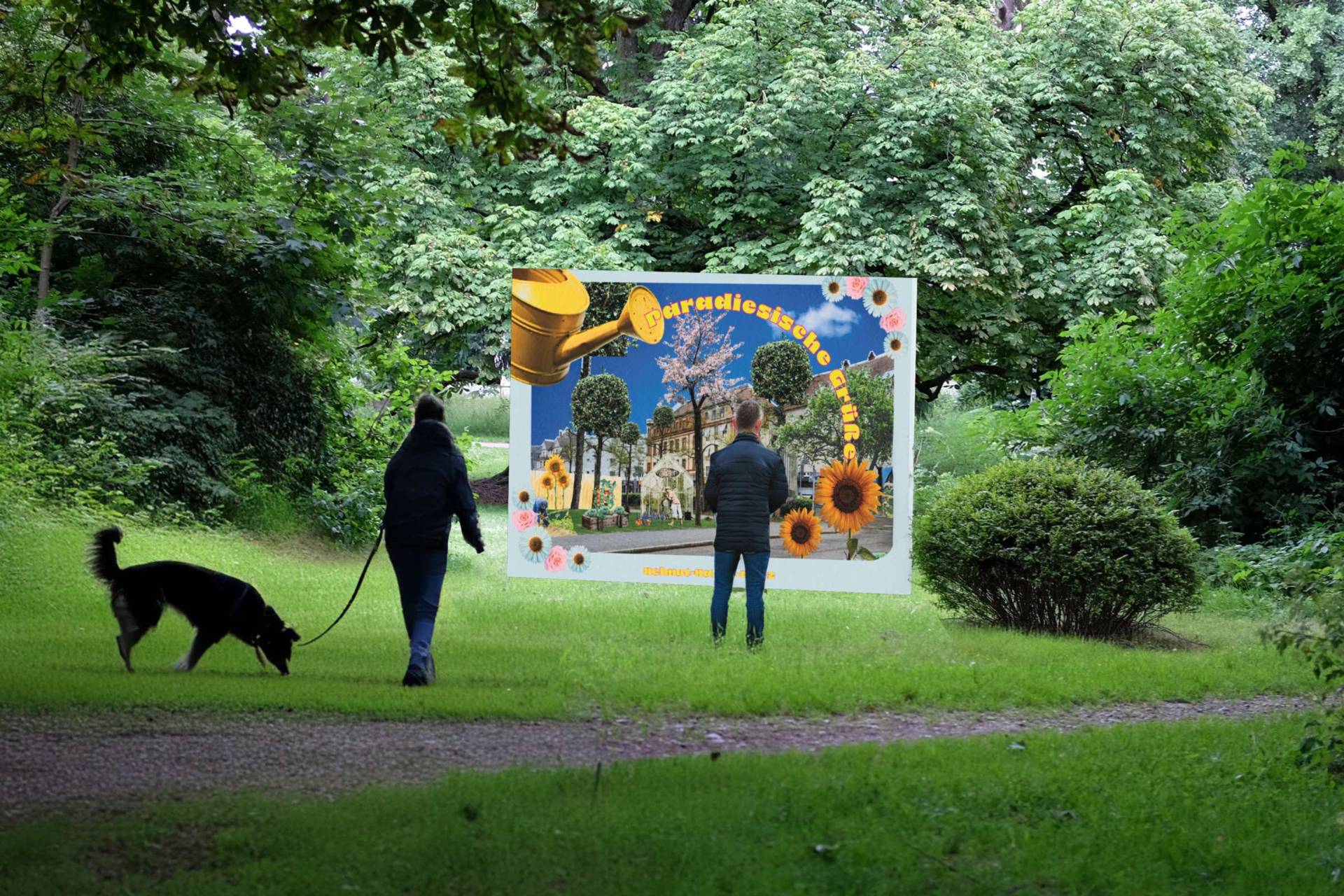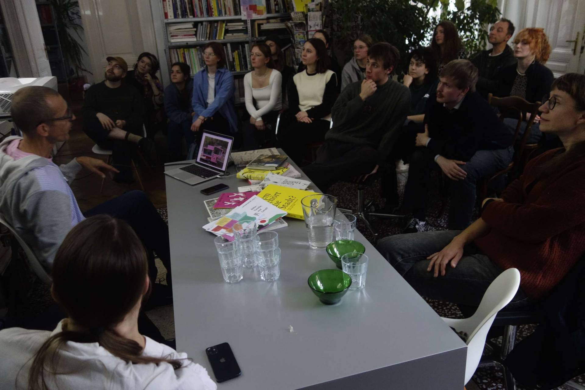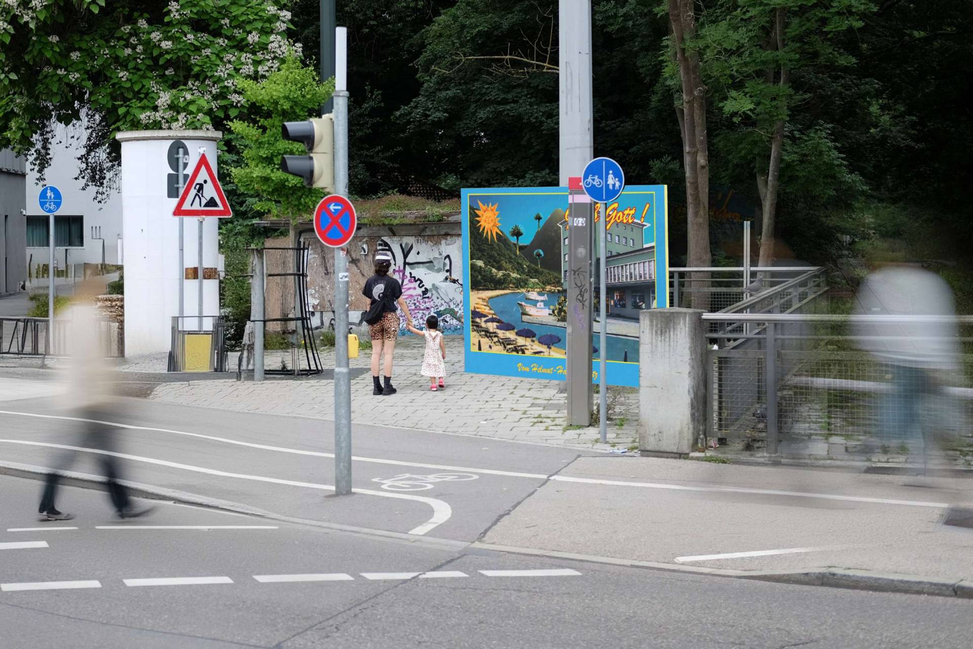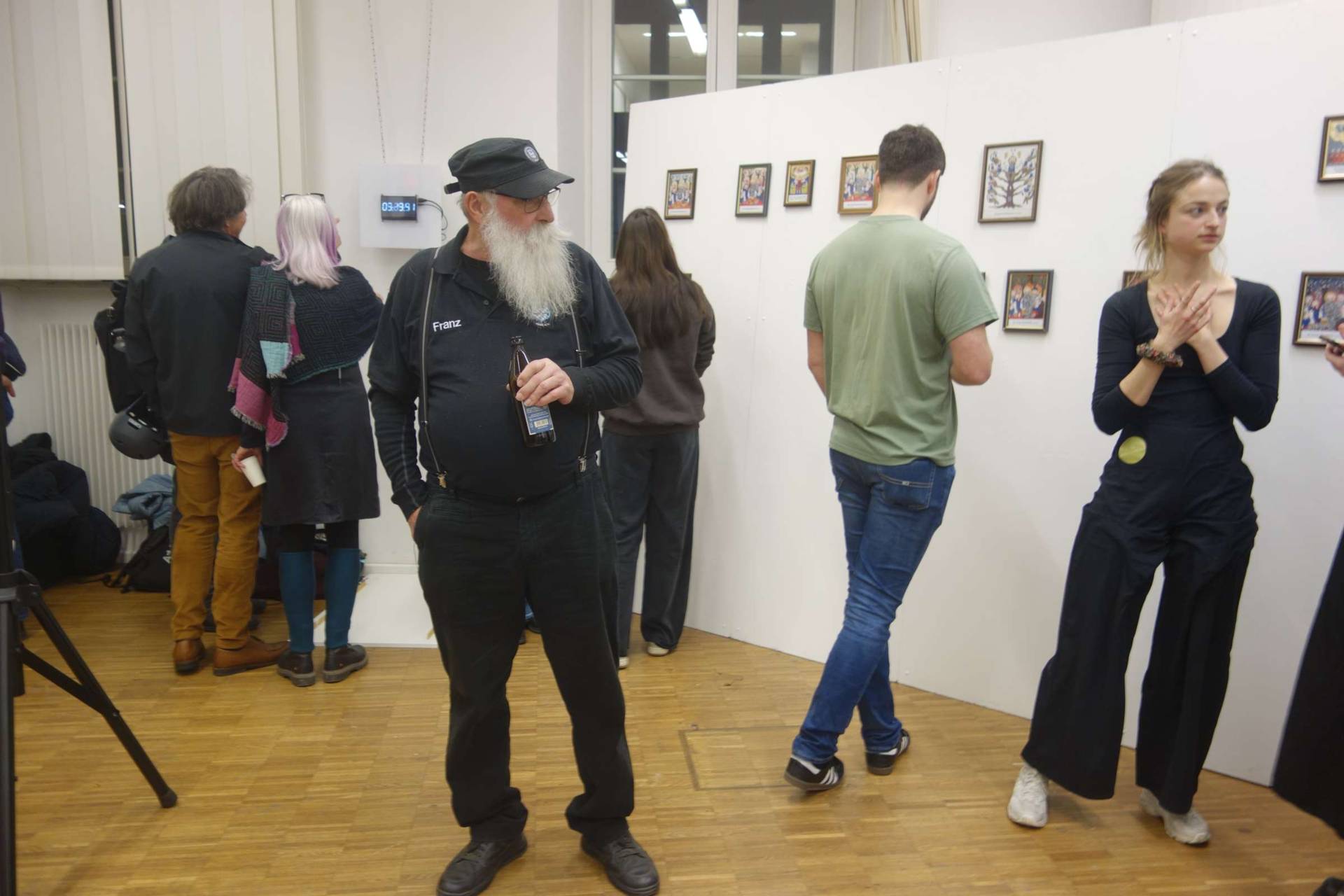 Bildergalerie zur Ausstellung der MA Identity Design Studienarbeiten des Jahrgangs’22 auf einer zur »Gesellschaftskolumne« umgestalteten Litfaßsäule mit Impressionen vom »Ausstellungsrundgang« (Vernissage).