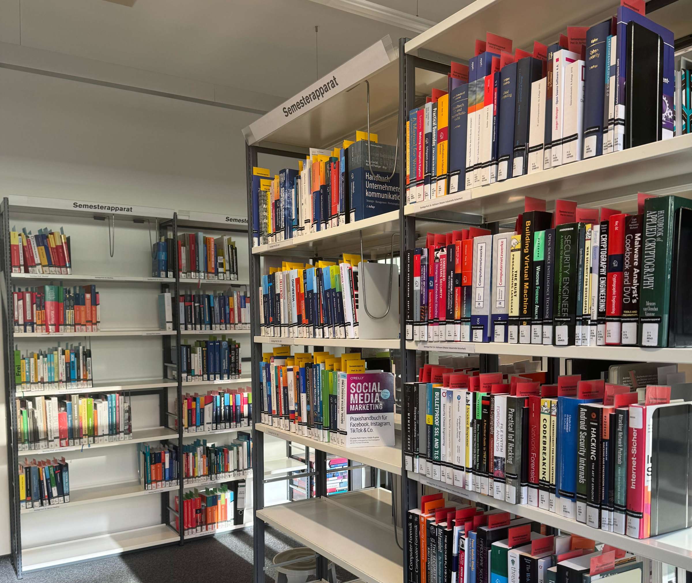 Printed books are located on shelves next to the group rooms of the library, online resources can be found in Moodle.