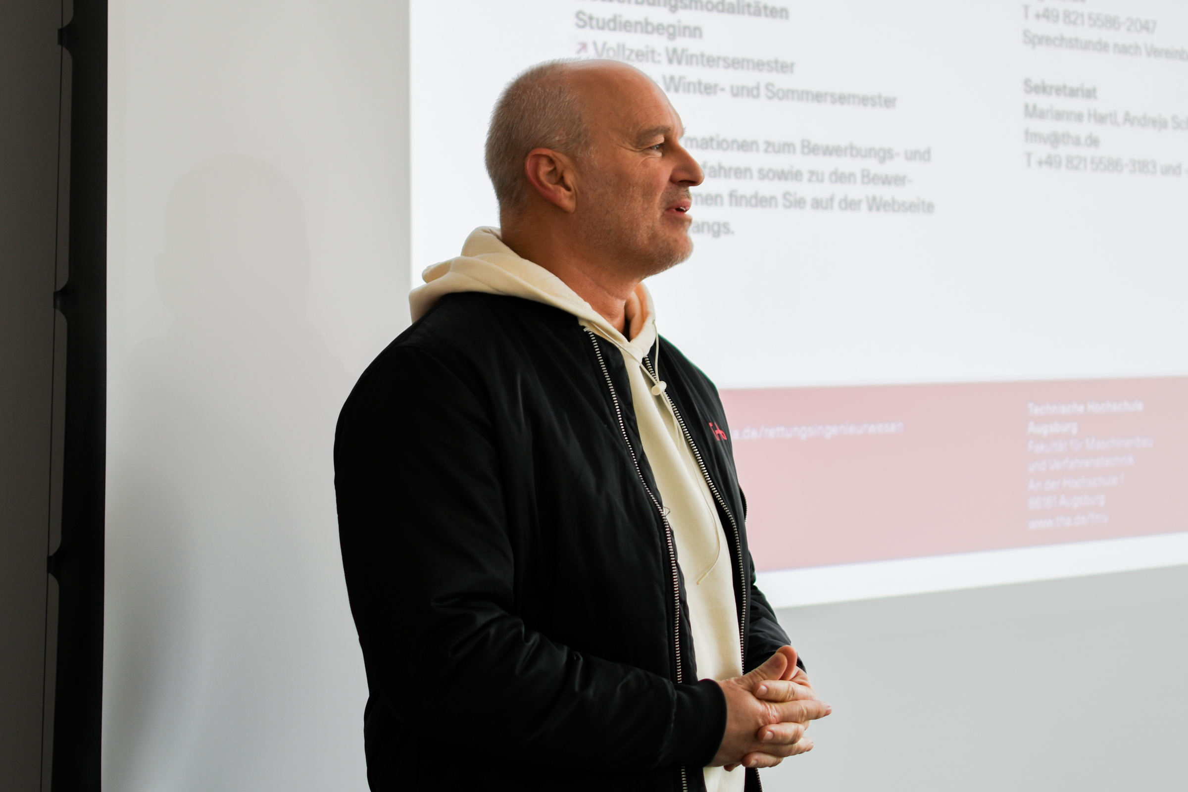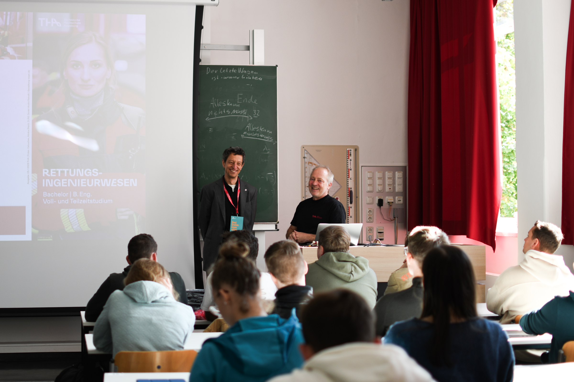 Während es für die Bachelorstudierenden im Maschinenbau und in Umwelt- und Verfahrenstechnik mit einer Campusführung der Fachschaft weiterging, wurde für den neuen Studiengang Rettungsingenieurwesen eine Einführungsveranstaltung angeboten. Dabei wurden sie von den Prof. Dr.-Ing. Stefan Murza, Prof. Dr. Nik Klever und Vizepräsident Prof. Dr. phil. László Kovács begrüßt. Auch THA-Präsident Prof. Dr. Dr. h.c. Gordon Rohrmair war zugegen und richtete motivierende Worte an die neuen Studierenden. Dabei hoben sie alle die besondere Bedeutung dieses Studienangebots für die Hochschule, die Region und die Gesellschaft hervor.