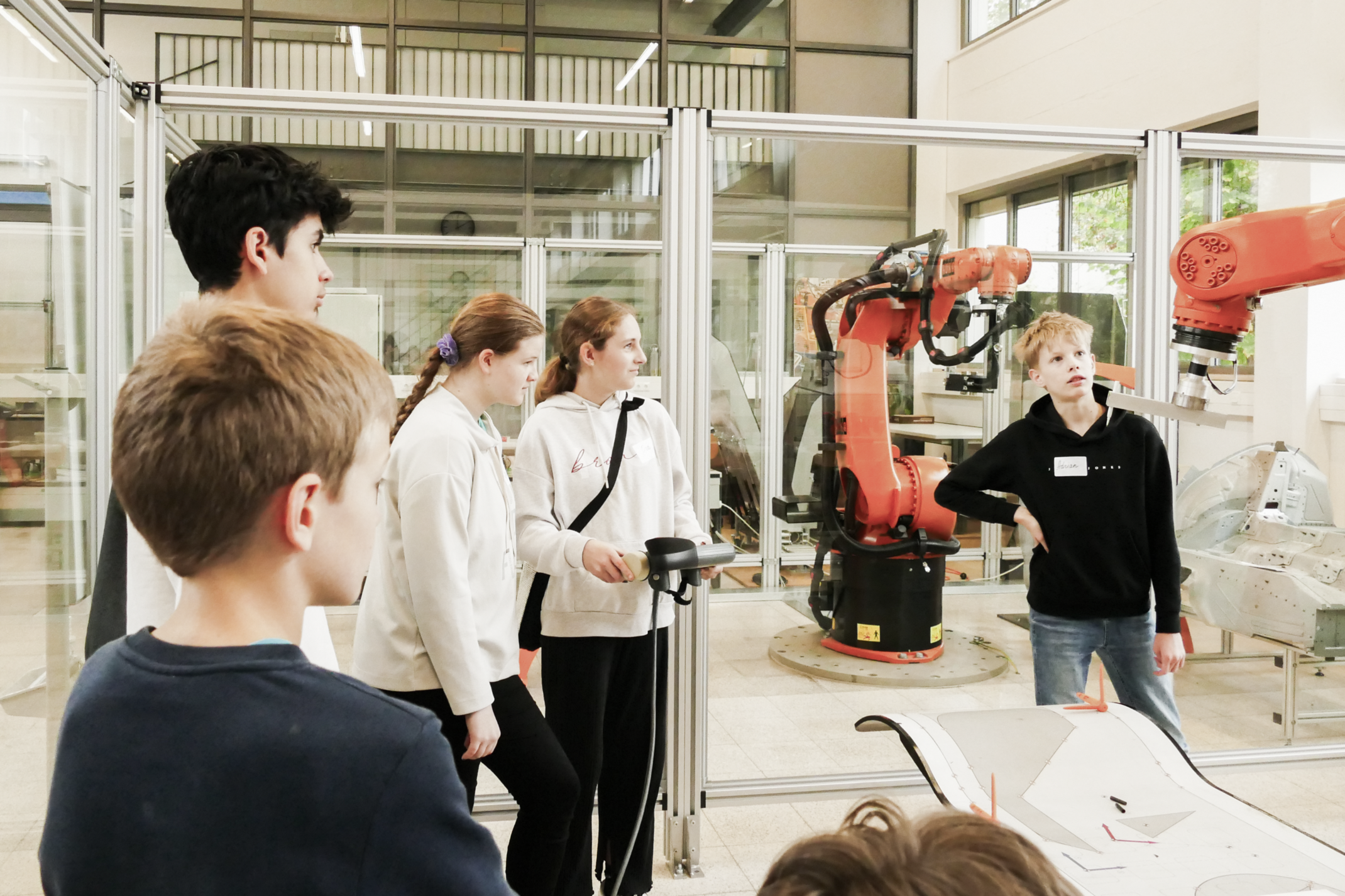 Ein Angebot im diesjährigen Herbstferienprogramm war ein Besuch im Robotiklabor der Fakultät für Maschinenbau und Verfahrenstechnik an der Technischen Hochschule Augsburg. Einen Vormittag lang konnten die sieben teilnehmenden Jugendlichen sich an den Robotern ausprobieren, lernten wie ein Industrieroboter gesteuert wird und konnten zum Schluss ein kleines Programm online erstellen. In dem Programm setzten die Jugendlichen ihre Namen auf ein Papier und ließen den Roboter die so entstandenen Punkte mit Linien verbinden. Ein krönender Abschluss in zweifacher Hinsicht: Das Programm lief hervorragend und formte aus den Namen eine Krone.