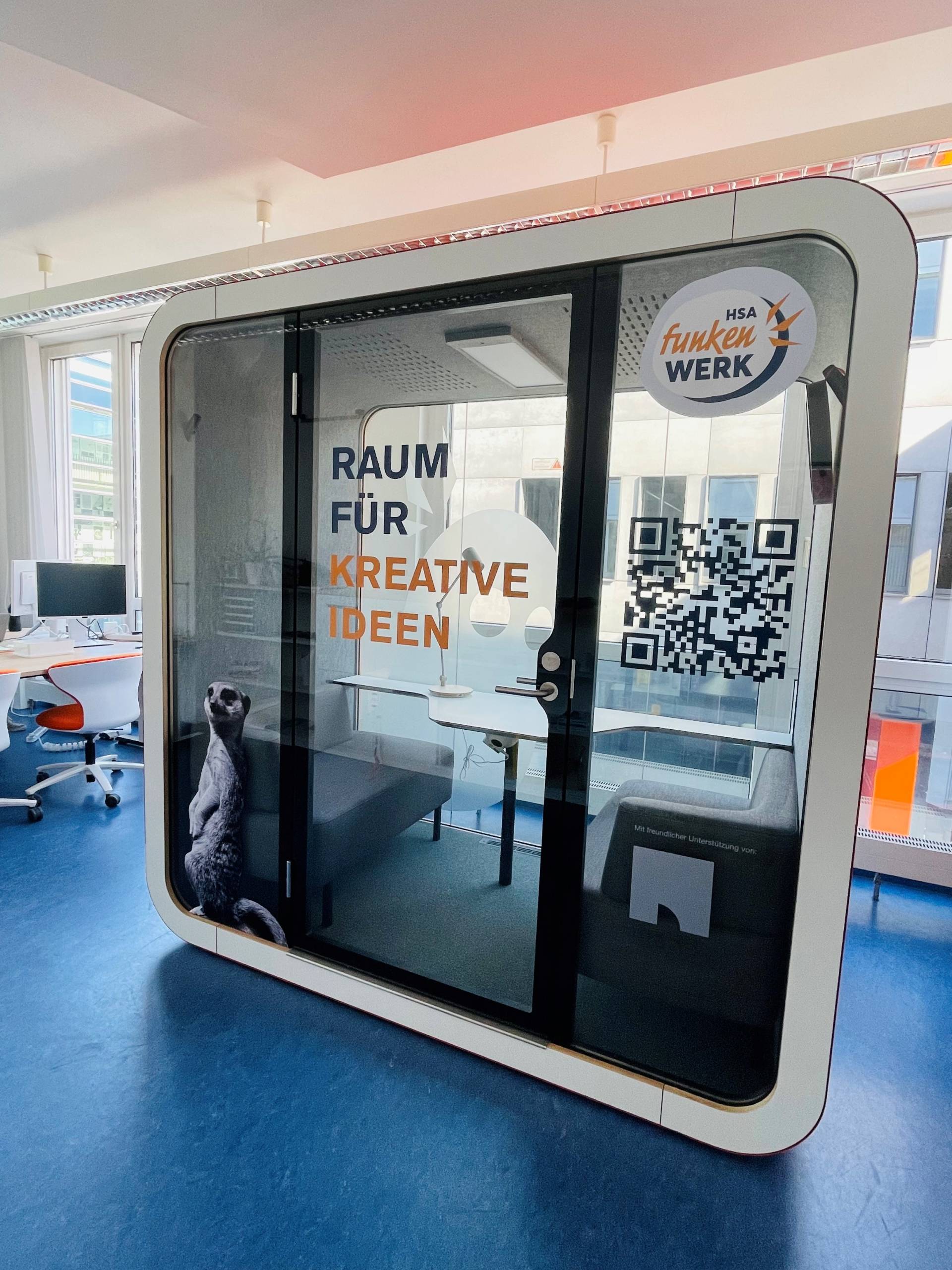 Schalldicht und belüftet sind die Spaceboxen des Funkenwerks Dein Rückzugsort zum konzentrierten Arbeiten, telefonieren, zoomen und durchatmen. Eine Insel für Tête-à-Tête Gespräche, zum Brainstormen oder auch einfach zum Weltschmerz raus SCHREIEN.