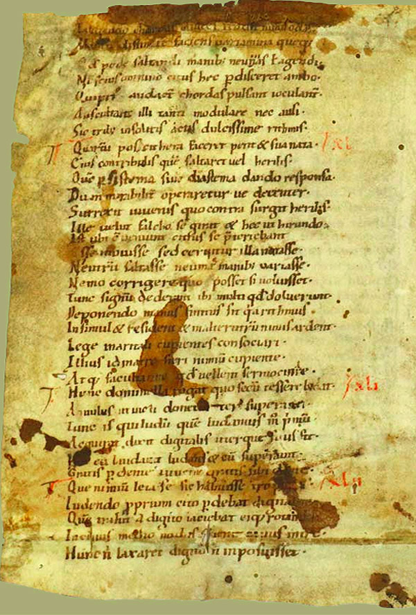 30 | «Est» ait «hic harpa, melior qua non erit ulla,In qua, dum vixit, meus heros simphoniavit,Cuius clangore mea mens languescit amore,Quam nemo tetigit, is postquam vivere finit.In qua, si vultis, rithmos modulare valetis.» |