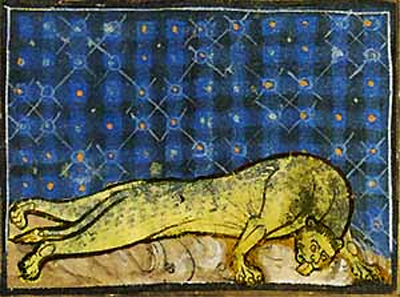 1. PANTHERE est une beste tachie de petis cercles blans et noirs autresi comme petit oil, et est amés de toz animaus fors que dou dragon. Et sa nature est que tout maintenant qu'ele a sa viande prise, se rentre en son espelonce, et se dort .iii. jours; lors se lieve et oevre sa bouche, et flaire s'alaine si dous et si souef ke totes bestes ki sentent l'odour s'en vont devant lui, fors solement le dragon, ki s'afiche es pertuis desous terre, pour la puour k'il en a, k'il set bien que a morir le covient. 2. Et sachiés que li panthere ne porte fiz en trestote sa vie que une seule fois, et ore orés porquoi. Ses cheaus quant il sont escreu dedens le cors a la mere, ne welent pas soufrir jusc'au tens de lor droite naissance, ains s'efforcent nature et debrisent as ongles les entrailles a lor mere, et s'en issent hors en tel maniere que la mere n'engendre plus en nule maniere du monde par semence de son malle.
