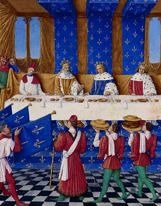 7 | Item d'entremes d'une queue de sangler, tiers mes vn rose et vn tieule, oisons et chapons de haute craisse a la dodine, fromentee et venoison, et d'antremes poulles doreez verdes et jaunes et pommes d'orenge. Et fu le diner en vne sale commune et fu assis a la table premier l'euesque de Paris, l'euesque de Bonneseparch, le roy de France et le roy de Behaigne, le duc de Berri, le duc de Bourgoigne, le duc de Sessone, le duc de Bourbon et le duc de Bar. |
