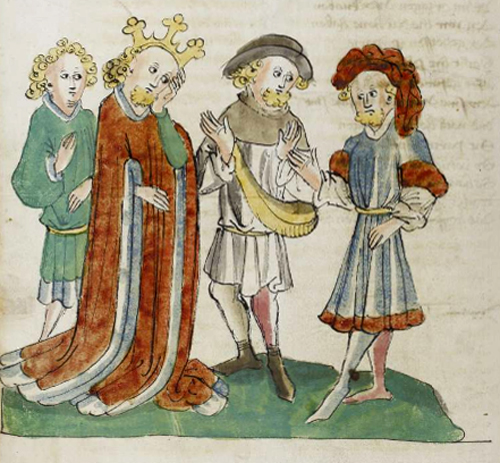 5625 | Pârîsen bî der hende wîz.si fuorte in sunder itewîzfür den künic hôchgebornund wolte stillen sînen zornmit dem juncherren ûz erwelt, |