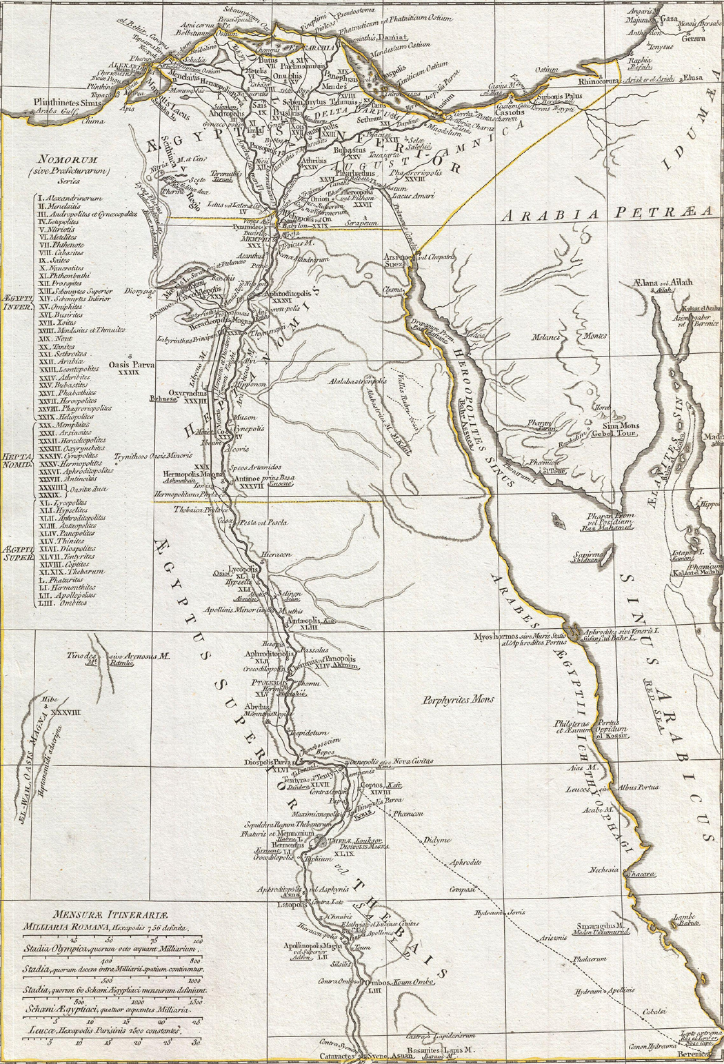 IX. [1] πέφυκε μέν νυν ἡ χώρη αὕτη οὕτω. ἀπὸ δὲ Ἡλίου πόλιος ἐς Θήβας ἐστὶ ἀνάπλοος ἐννέα ἡμερέων, στάδιοι δὲ τῆς ὁδοῦ ἑξήκοντα καὶ ὀκτακόσιοι καὶ τετρακισχίλιοι, σχοίνων ἑνὸς καὶ ὀγδώκοντα ἐόντων. [2] οὗτοι συντιθέμενοι οἱ στάδιοι Αἰγύπτου τὸ μὲν παρὰ θάλασσαν ἤδη μοι καὶ πρότερον δεδήλωται ὅτι ἑξακοσίων τε ἐστὶ σταδίων καὶ τρισχιλίων, ὅσον δέ τι ἀπὸ θαλάσσης ἐς μεσόγαιαν μέχρι Θηβέων ἐστί, σημανέω· στάδιοι γὰρ εἰσὶ εἴκοσι καὶ ἑκατὸν καὶ ἑξακισχίλιοι. τὸ δὲ ἀπὸ Θηβέων ἐς Ἐλεφαντίνην καλεομένην πόλιν στάδιοι χίλιοι καὶ ὀκτακόσιοι εἰσί.